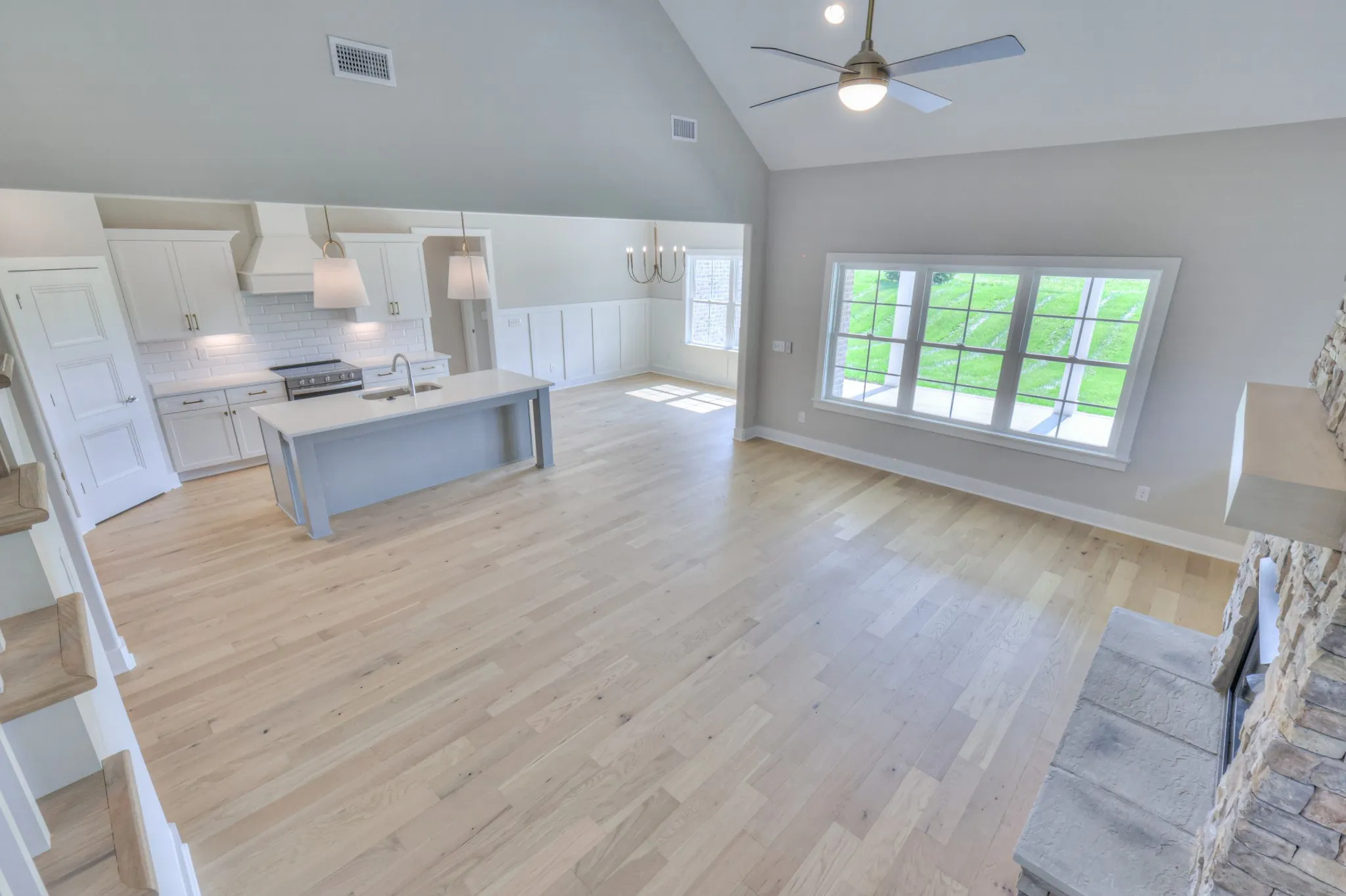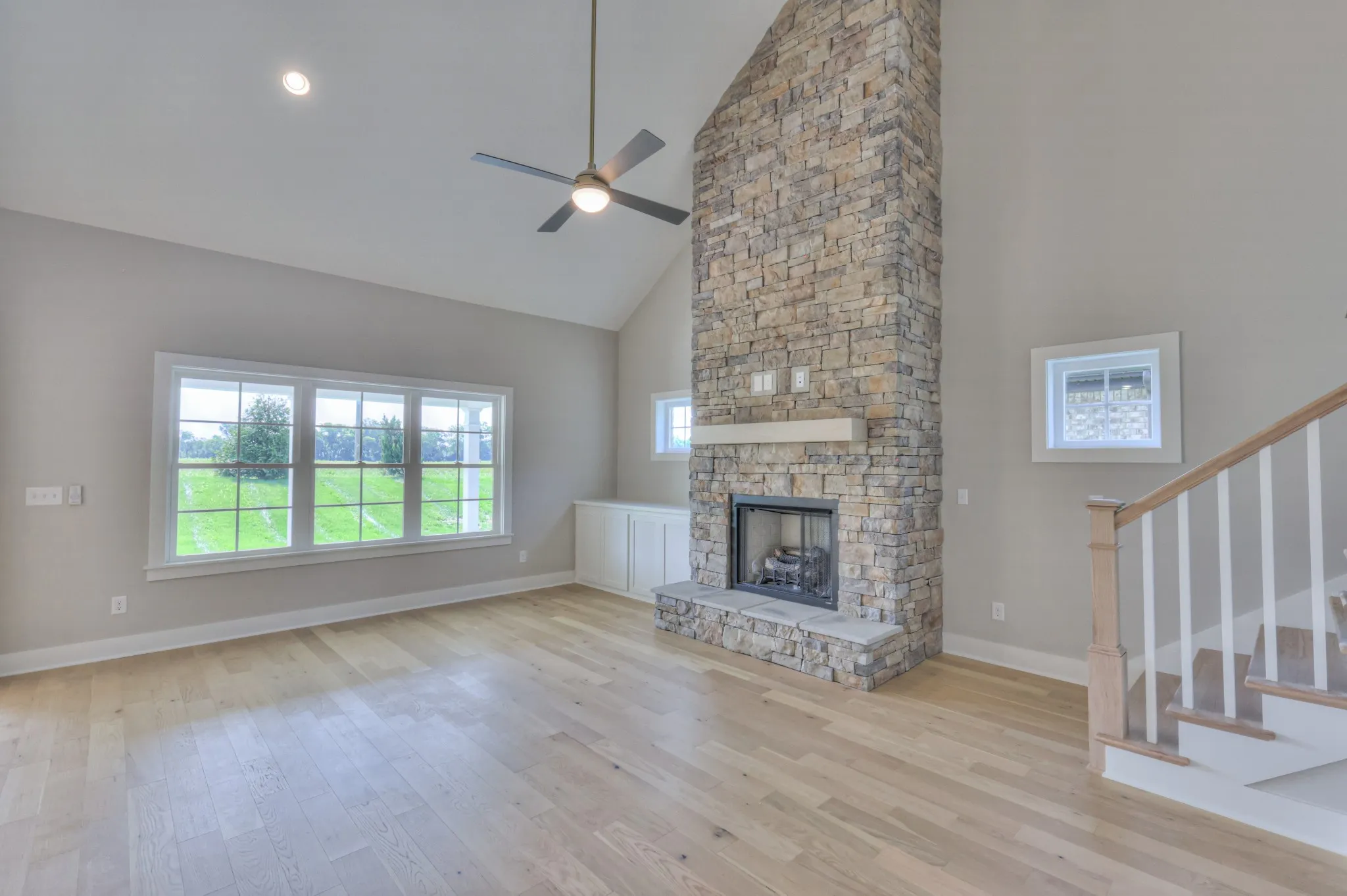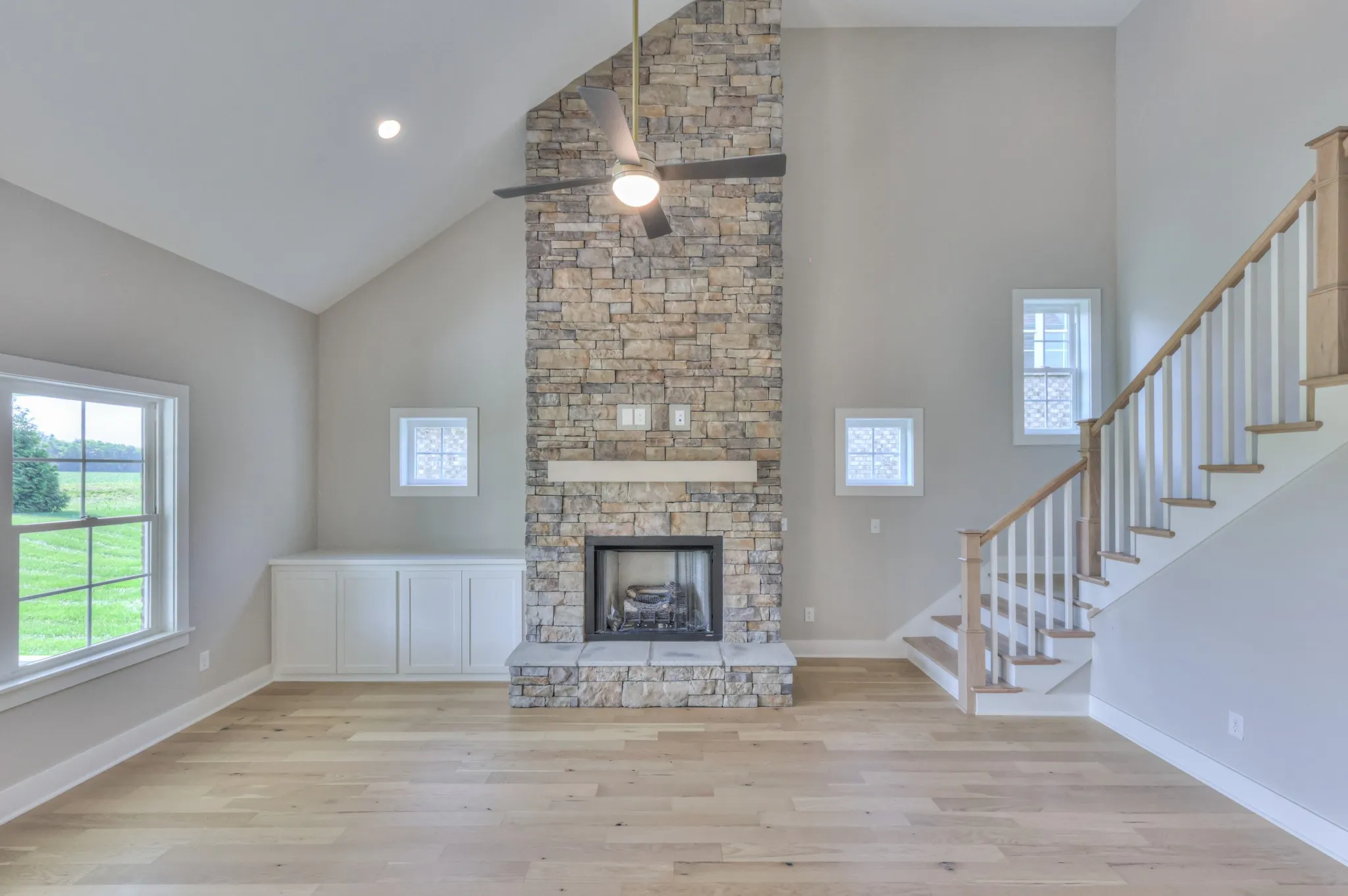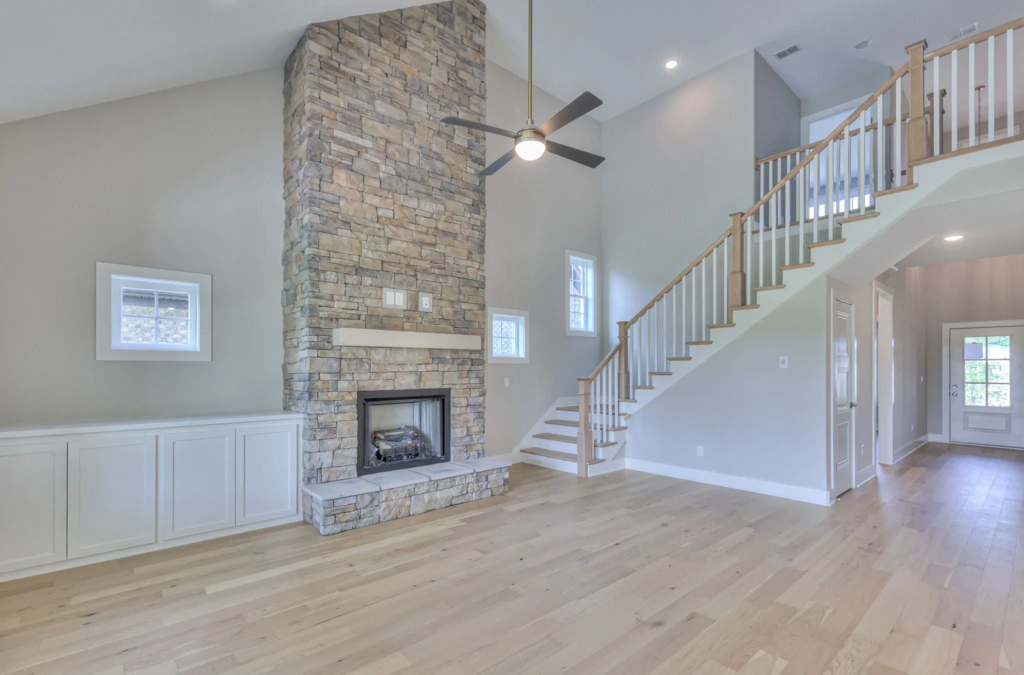 The Arrington Plan offers a 3-car garage and an open layout with 4 bedrooms, 3 full baths, and a large bonus room. Primary and secondary bedrooms on the main level; two bedrooms and full bath upstairs. The kitchen features quartz countertops, a fully vented cooktop hood, and overlooks the living area with a gas fireplace and built-ins.