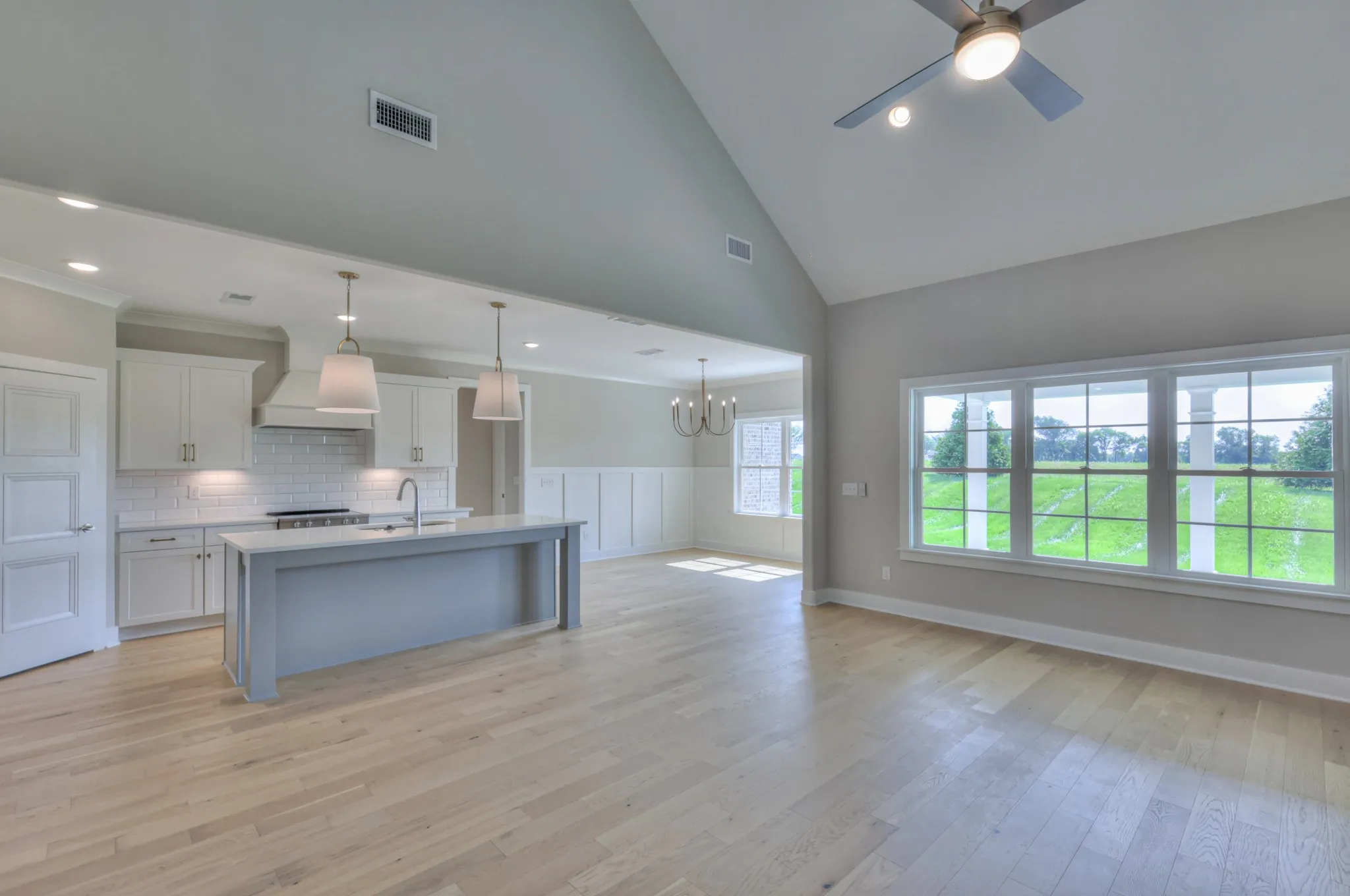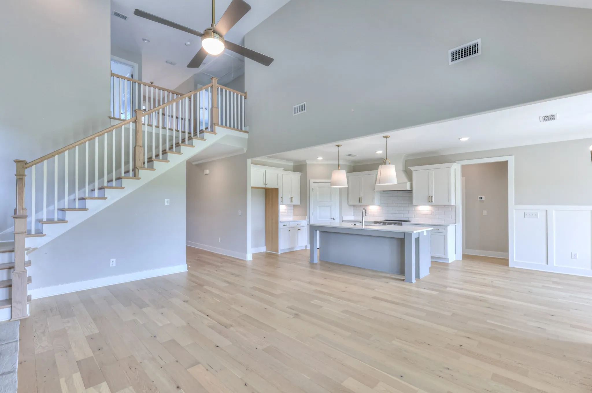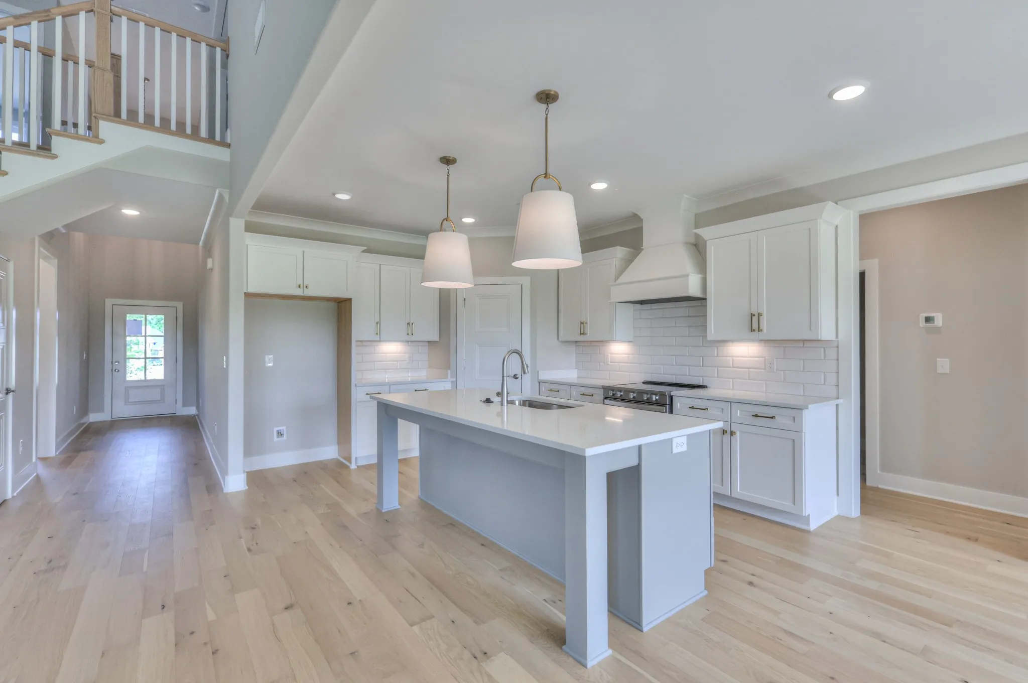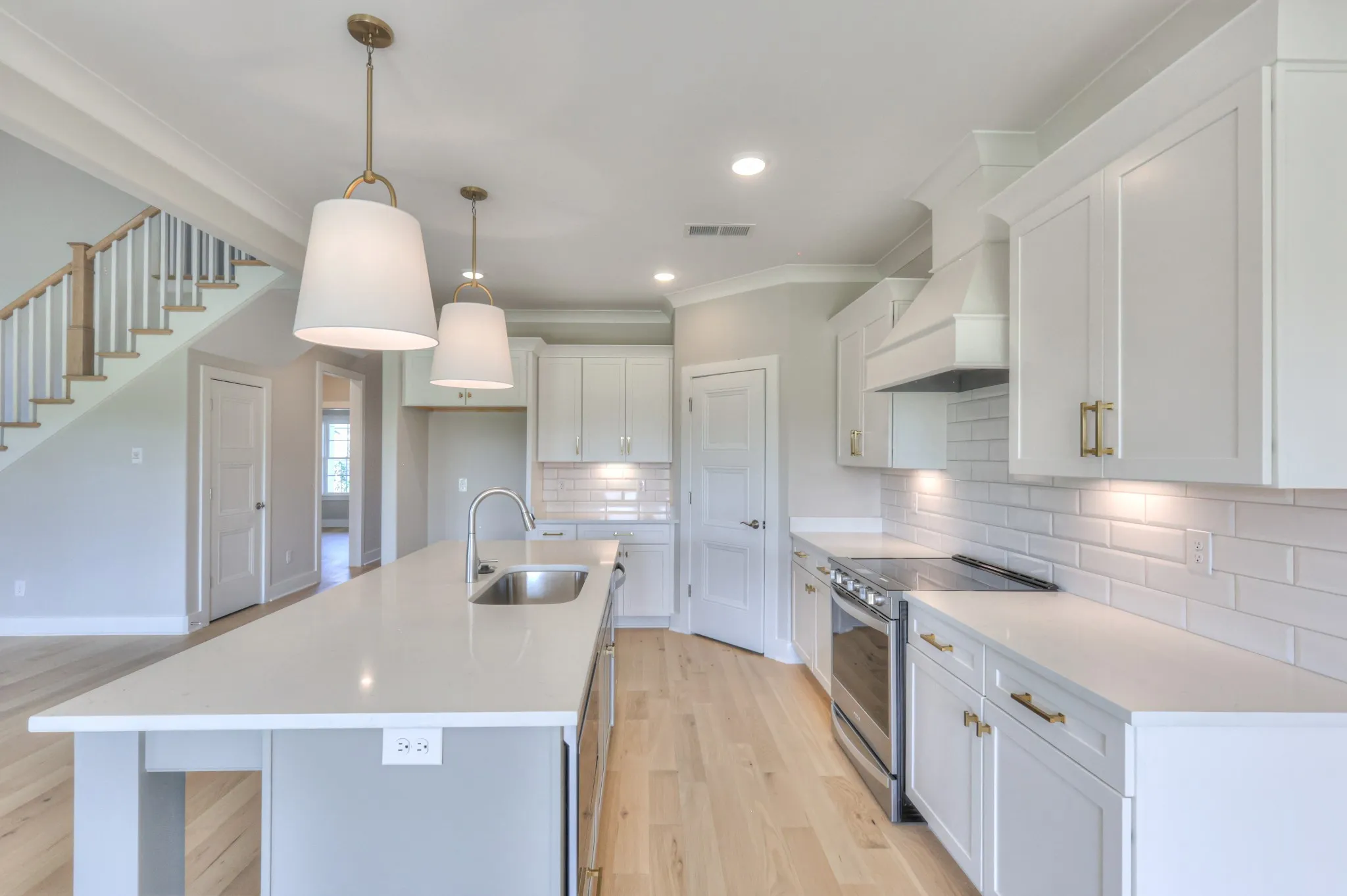 The Arrington Plan offers a 3-car garage and an open layout with 4 bedrooms, 3 full baths, and a large bonus room. Primary and secondary bedrooms on the main level; two bedrooms and full bath upstairs. The kitchen features quartz countertops, a fully vented cooktop hood, and overlooks the living area with a gas fireplace and built-ins.