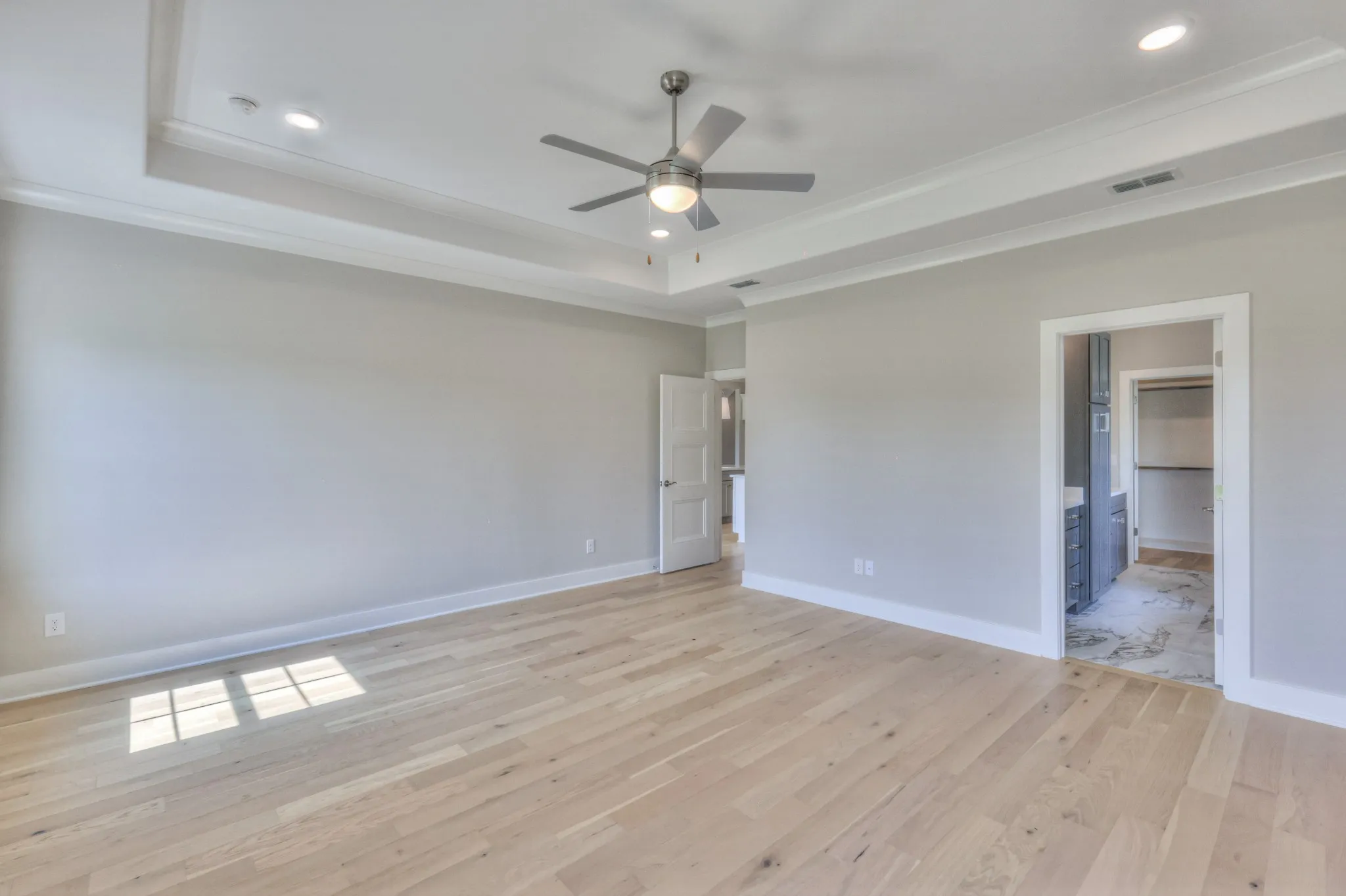 Upgrades include hardwood floors throughout the main level, gas tankless water heater, epoxy-coated garage flooring, and covered front and rear patios. The primary suite includes a garden tub and custom built-ins in the walk-in closet.