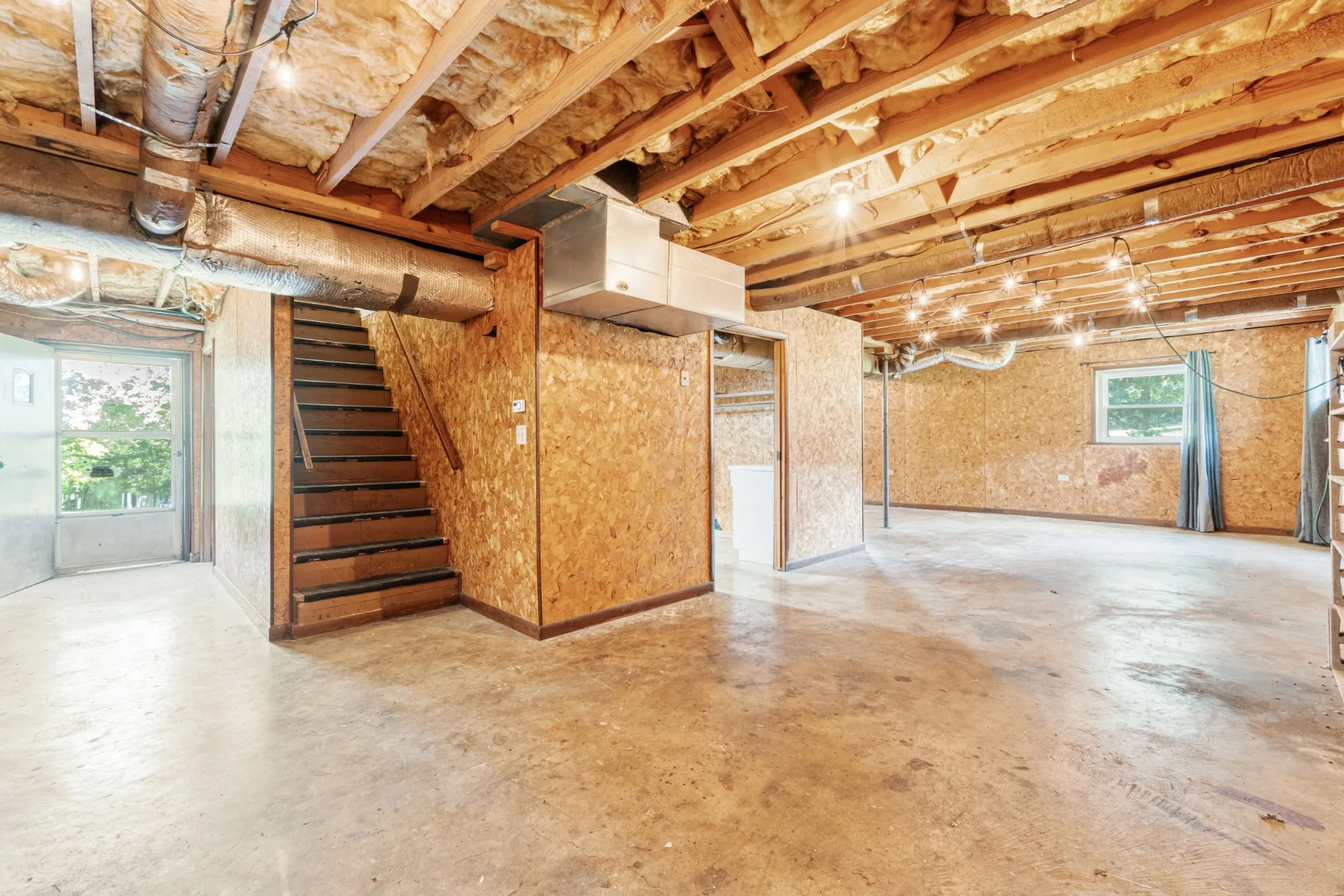 The daylight basement includes a laundry area, an open space ready for your design ideas, and a large hobby room. Off the hobby room is a one-of-a-kind fallout shelter with fold-down beds, making a great storm-safe space or creative kids’ hideout.
