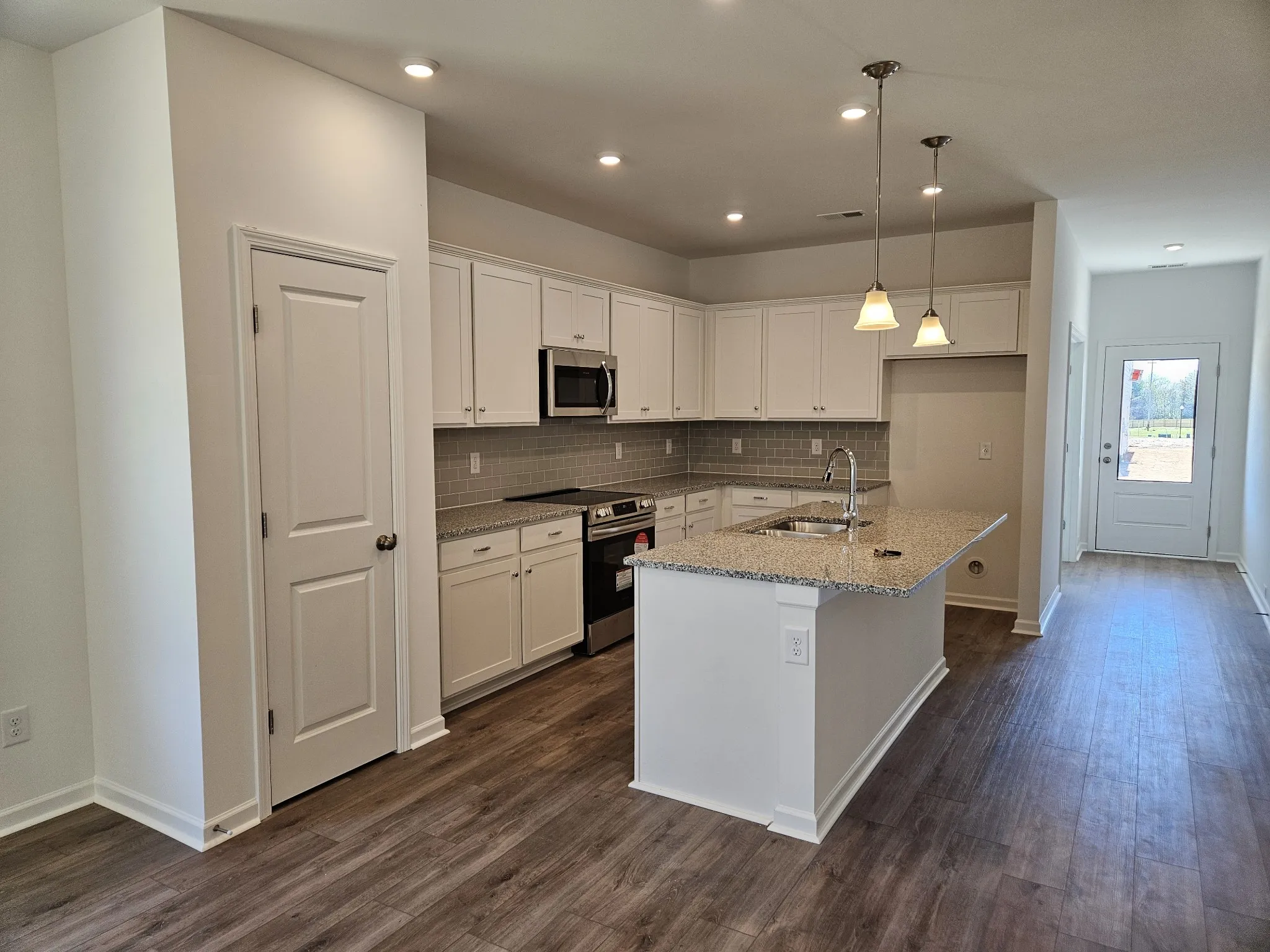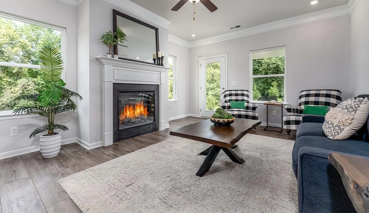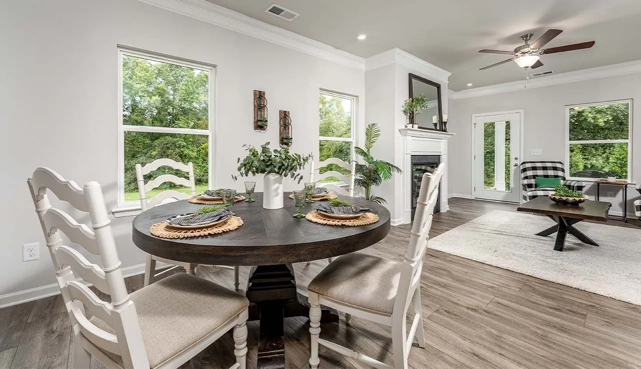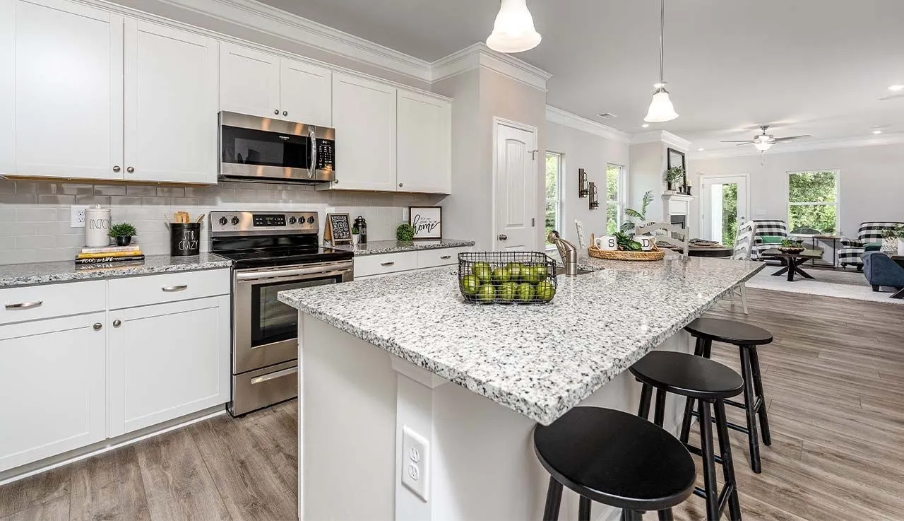 The Piedmont at Winston Place, by Smith Douglas Homes. READY MOVE-IN HOME WITH TREE LINE LOT The Piedmont is a single-level plan efficiently spaced out to get the best use of the home. This 3-bedroom 2-bath design greets you with a covered front porch that leads to an open layout with a front flex room and a large, centrally located, kitchen island. The spacious family room has direct access to the rear yard, which is also enjoyed through views from the luxurious owner’s suite. Secondary bedrooms are served by deep walk-in closets and conveniently located by the hall bath and laundry room.