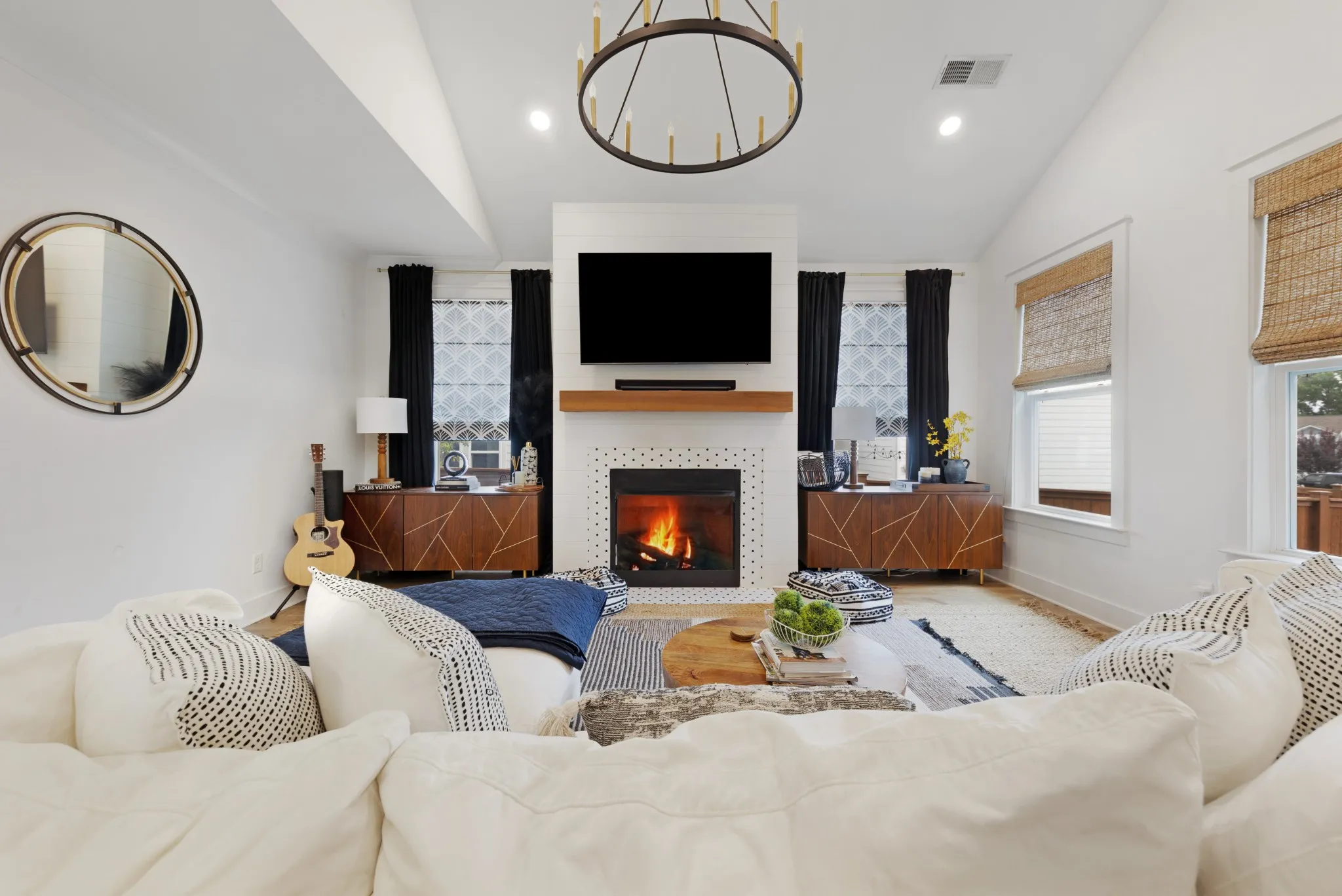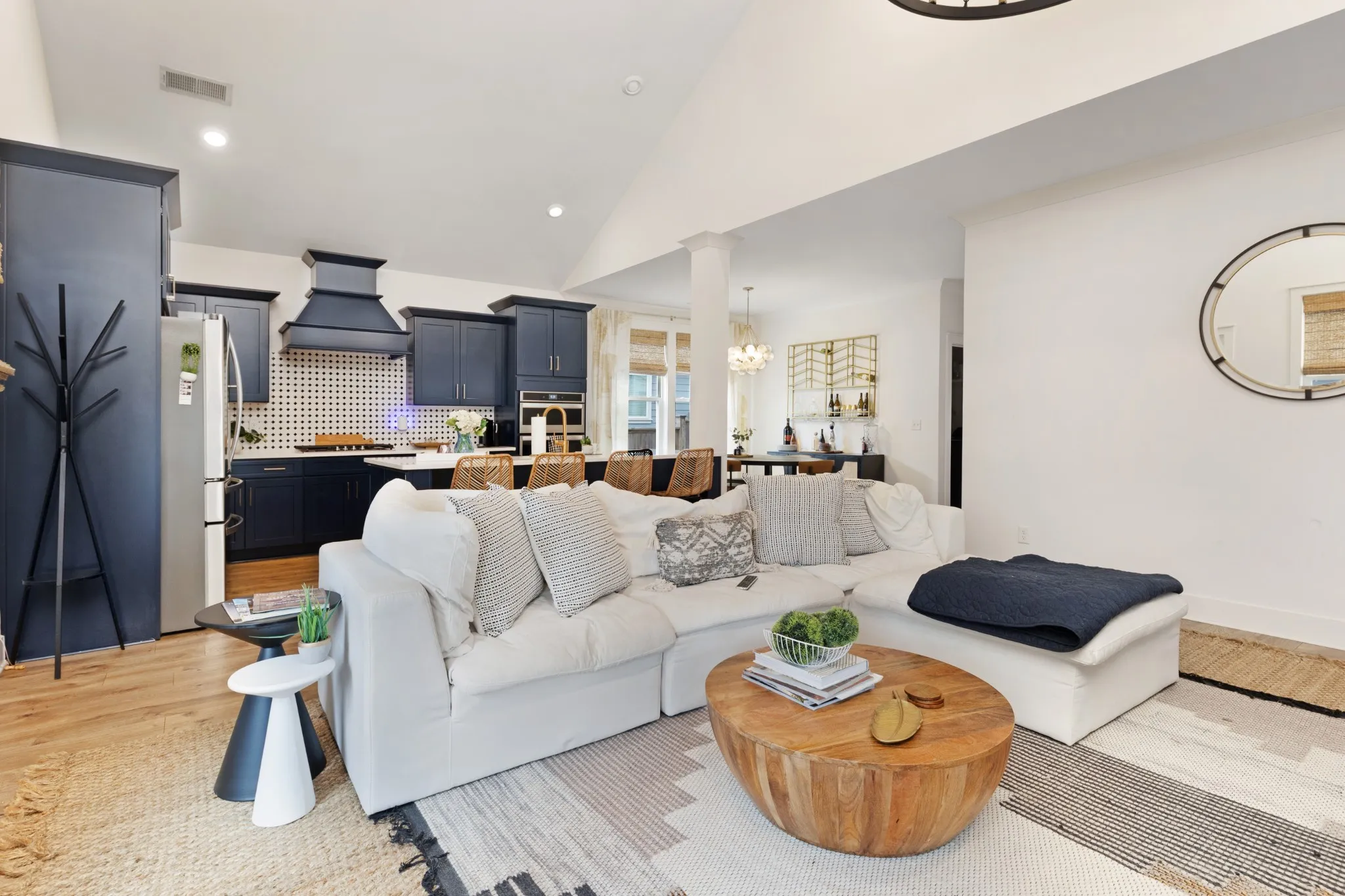 From the charming front porch to the inviting open-concept interior, every detail has been thoughtfully designed. Hardwood flooring flows throughout the main level, which features a master suite retreat, and a cozy living room with fireplace. The gourmet kitchen is a chef’s dream—complete with a spacious white quartz island, gas cooktop, double ovens, white cabinetry, glass tile backsplash, farmhouse sink, and a custom pantry with built-in shelving. Upstairs, a large bonus/flex space offers endless possibilities—home office, gym, media room, or playroom.\n
