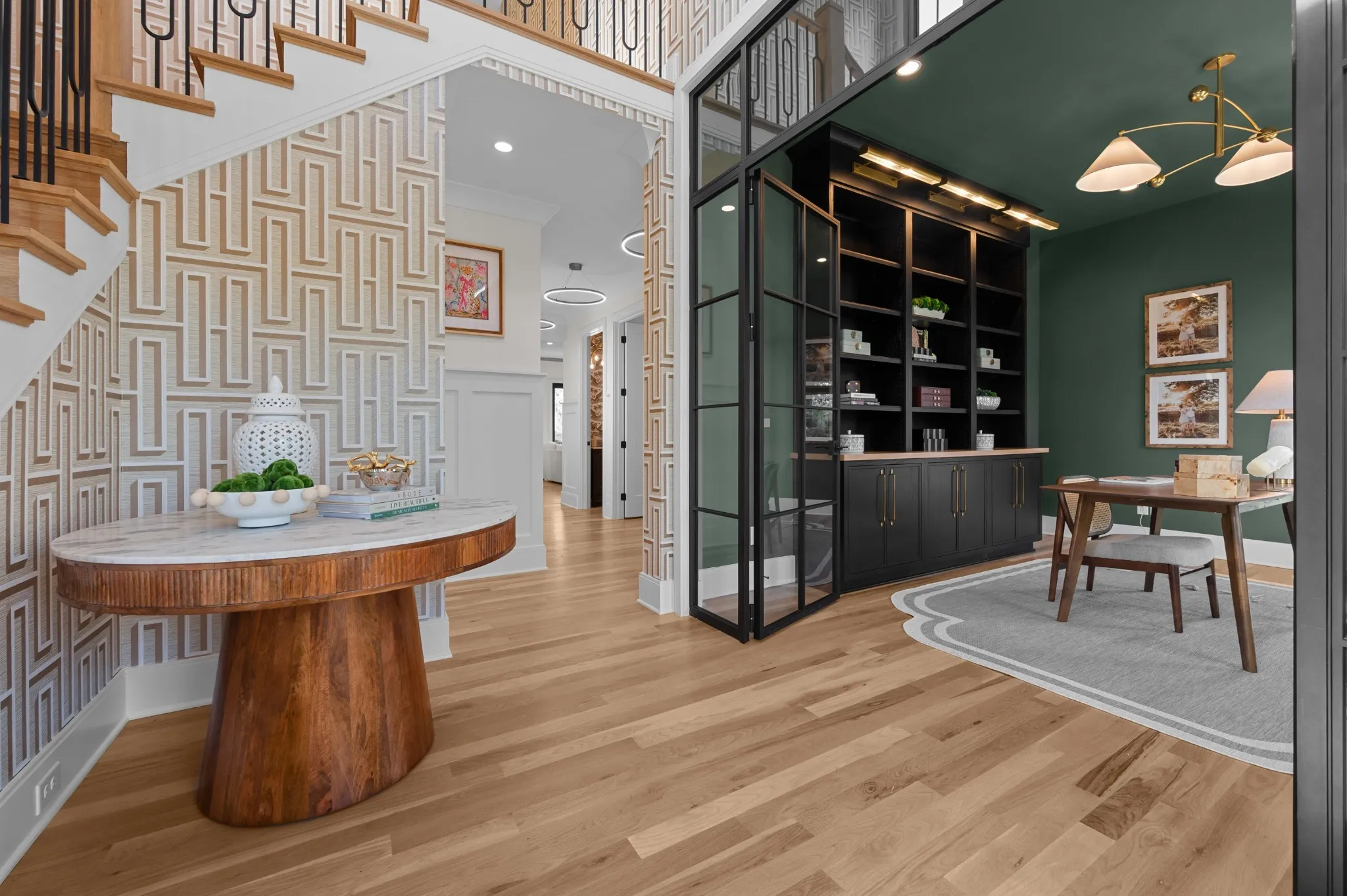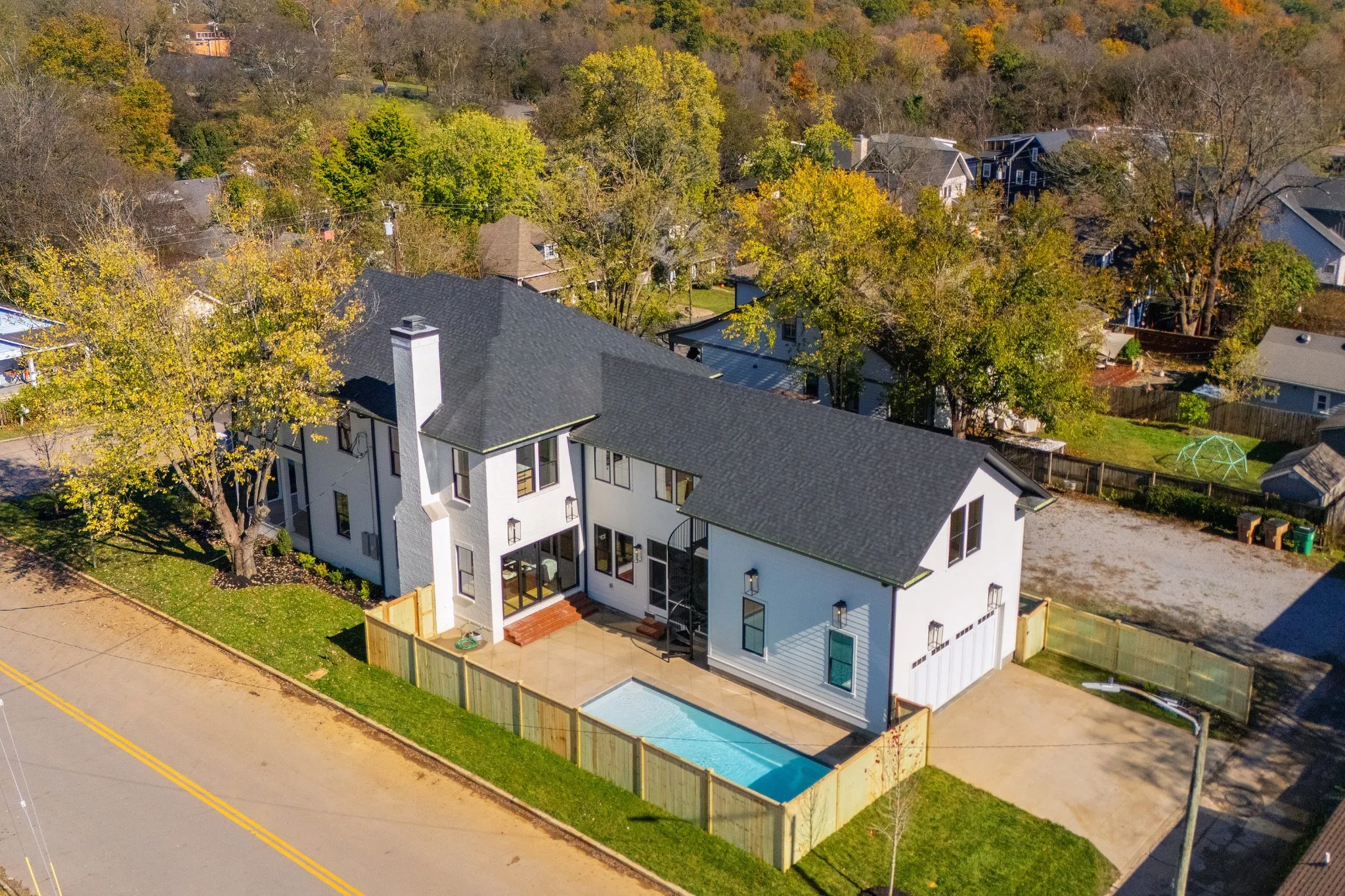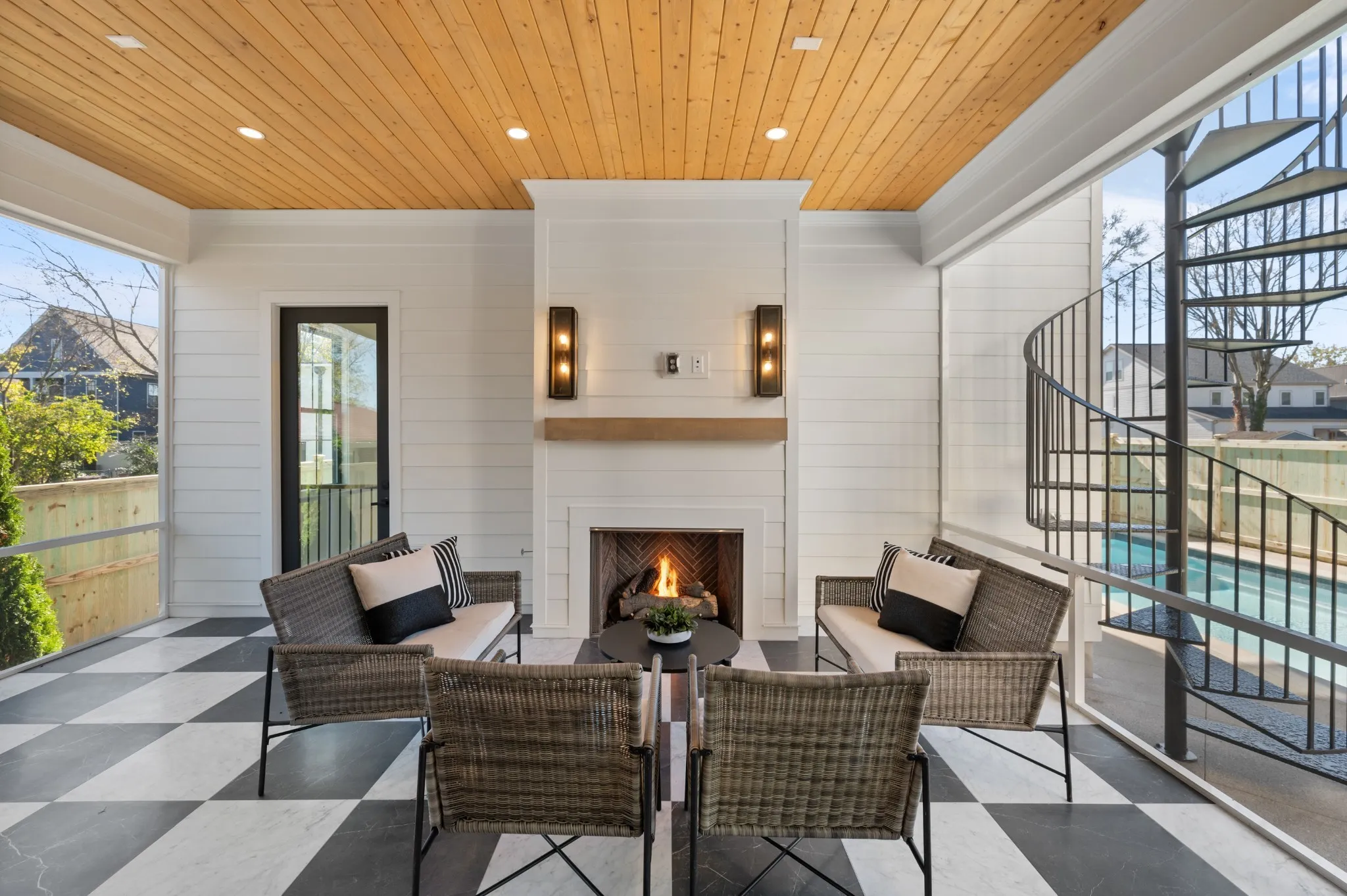Southern elegance meets modern convenience in this corner lot gem. The wrap-around two-story balcony invites relaxation, while the backyard oasis features a serene pool, sun deck, and a screened-in porch with a fireplace. Inside, enjoy a chef’s kitchen with high-end Monogram appliances and a spacious living area. The office, accessible from the front porch, is ideal for remote work. The primary suite, with its French-inspired millwork and herringbone floors, offers a luxurious retreat. White oak cabinetry enhances the primary bath, and a bonus room with pool access via a spiral staircase provides additional space. Located in a walkable neighborhood, you’ll have dining and shops just steps away.