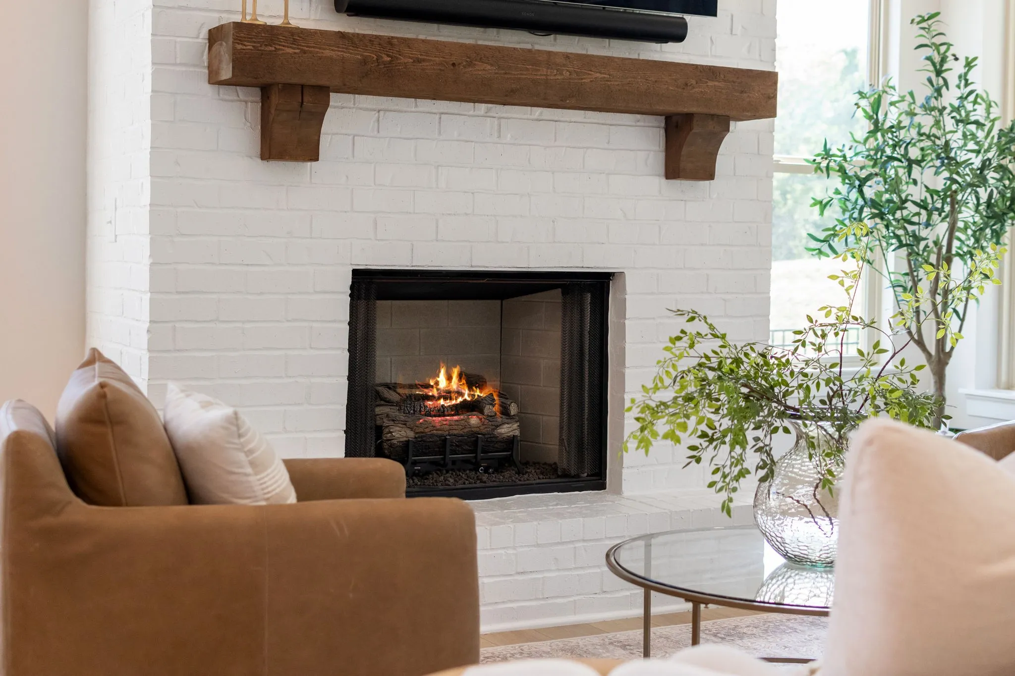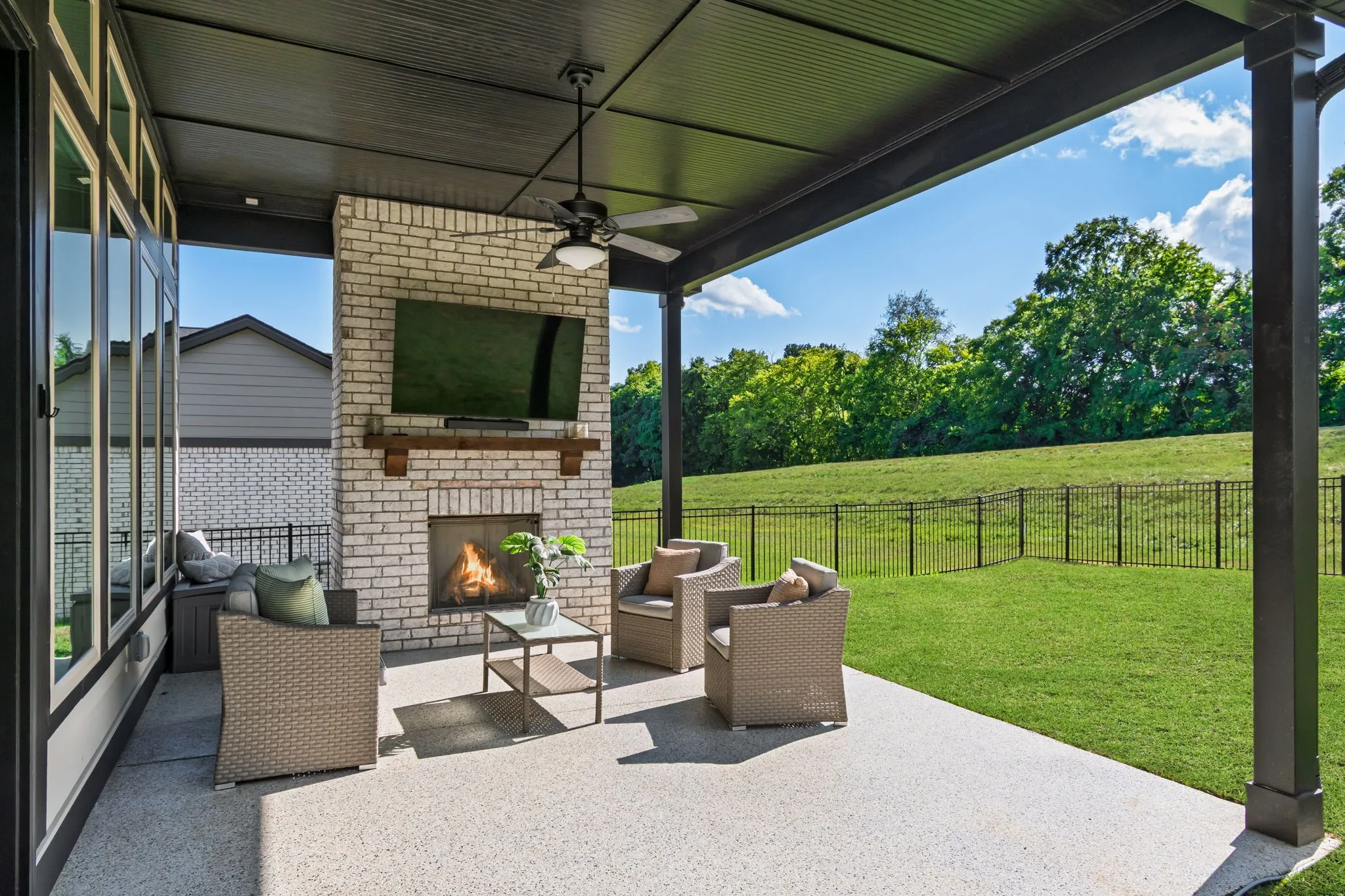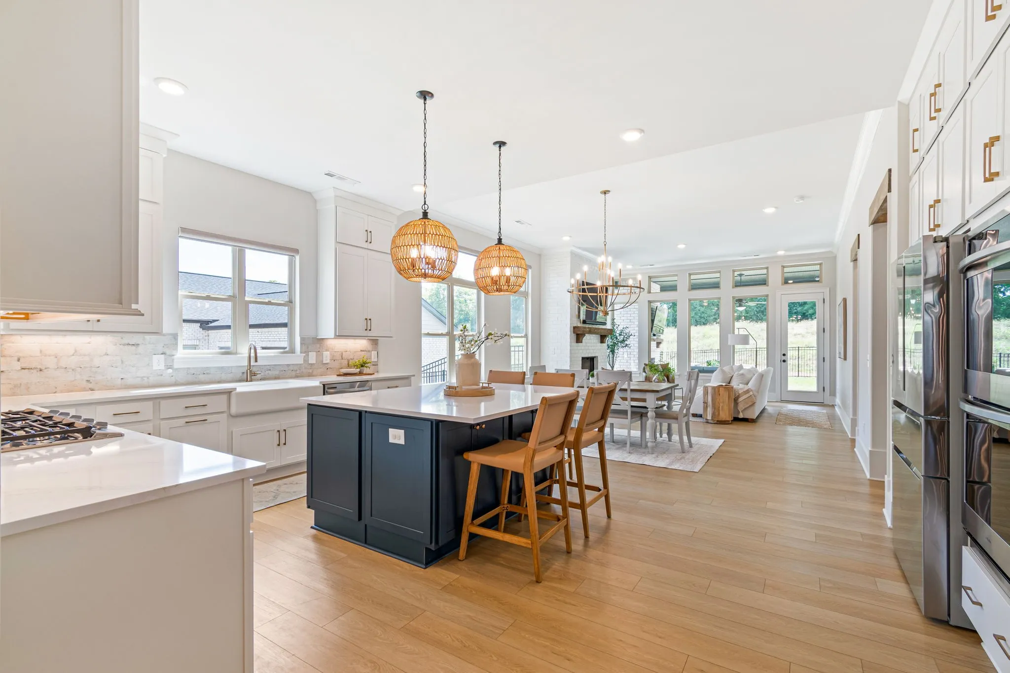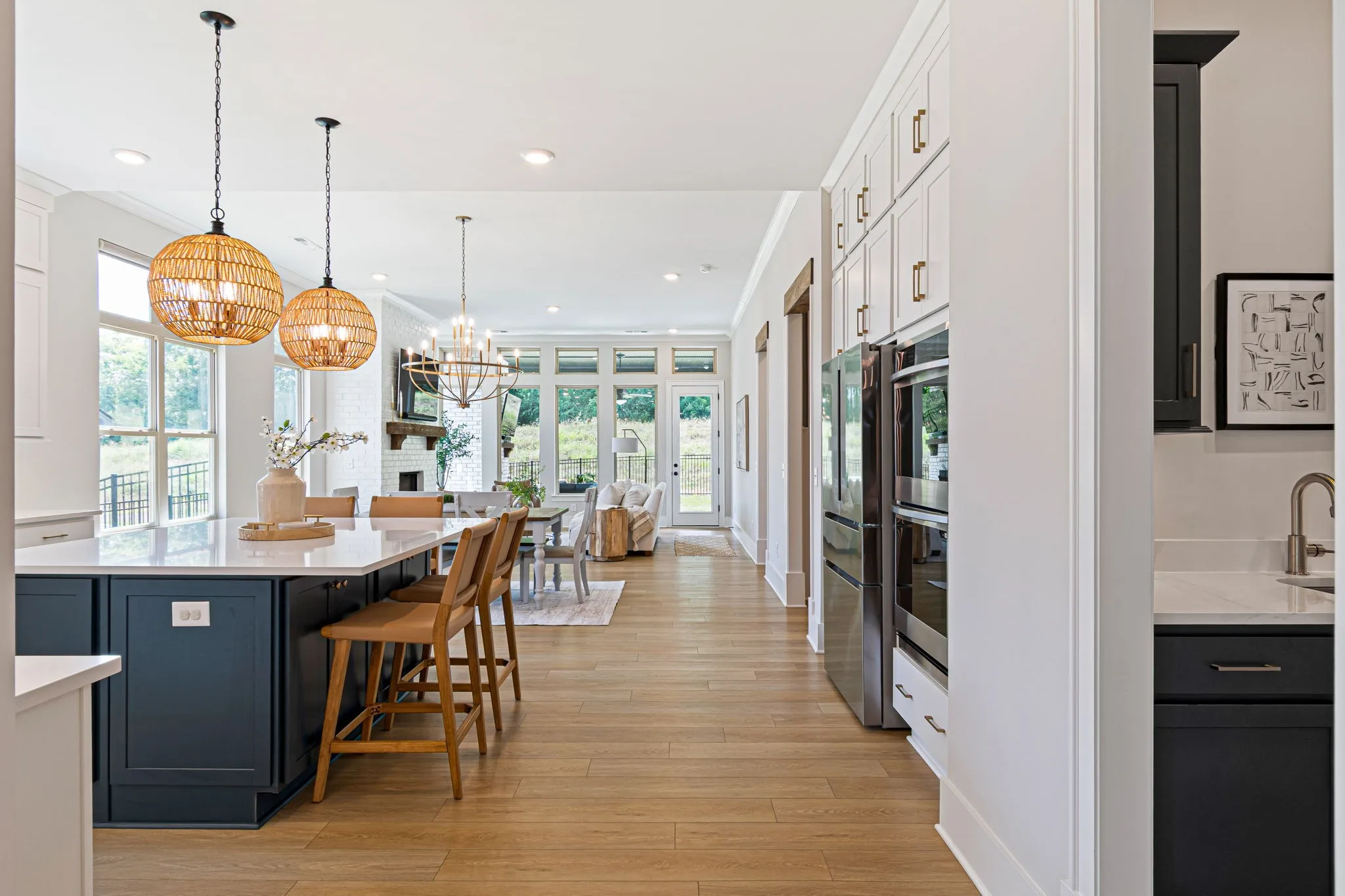 In the open family room, enjoy soaring 11’ ceilings and walls of windows with automatic shades, anchored by a beautiful brick fireplace.