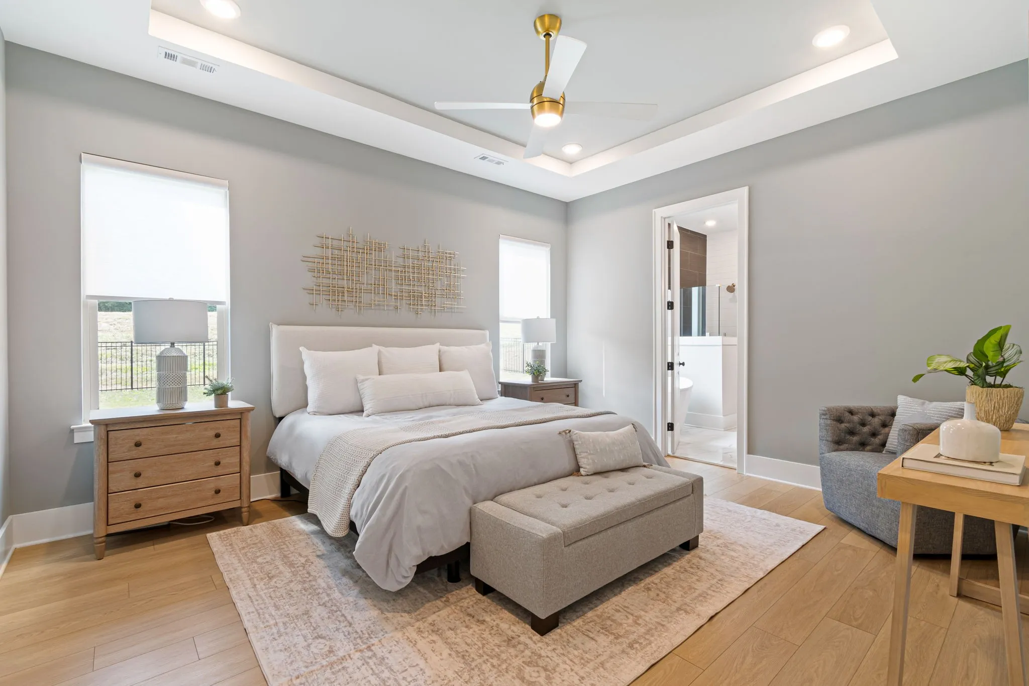 The primary suite is a true retreat with a tray ceiling, spa-like bath, and custom closet system. Upstairs, find a spacious bonus room and two additional bedrooms. LVP flooring throughout home as well as custom closet systems and window treatments.
