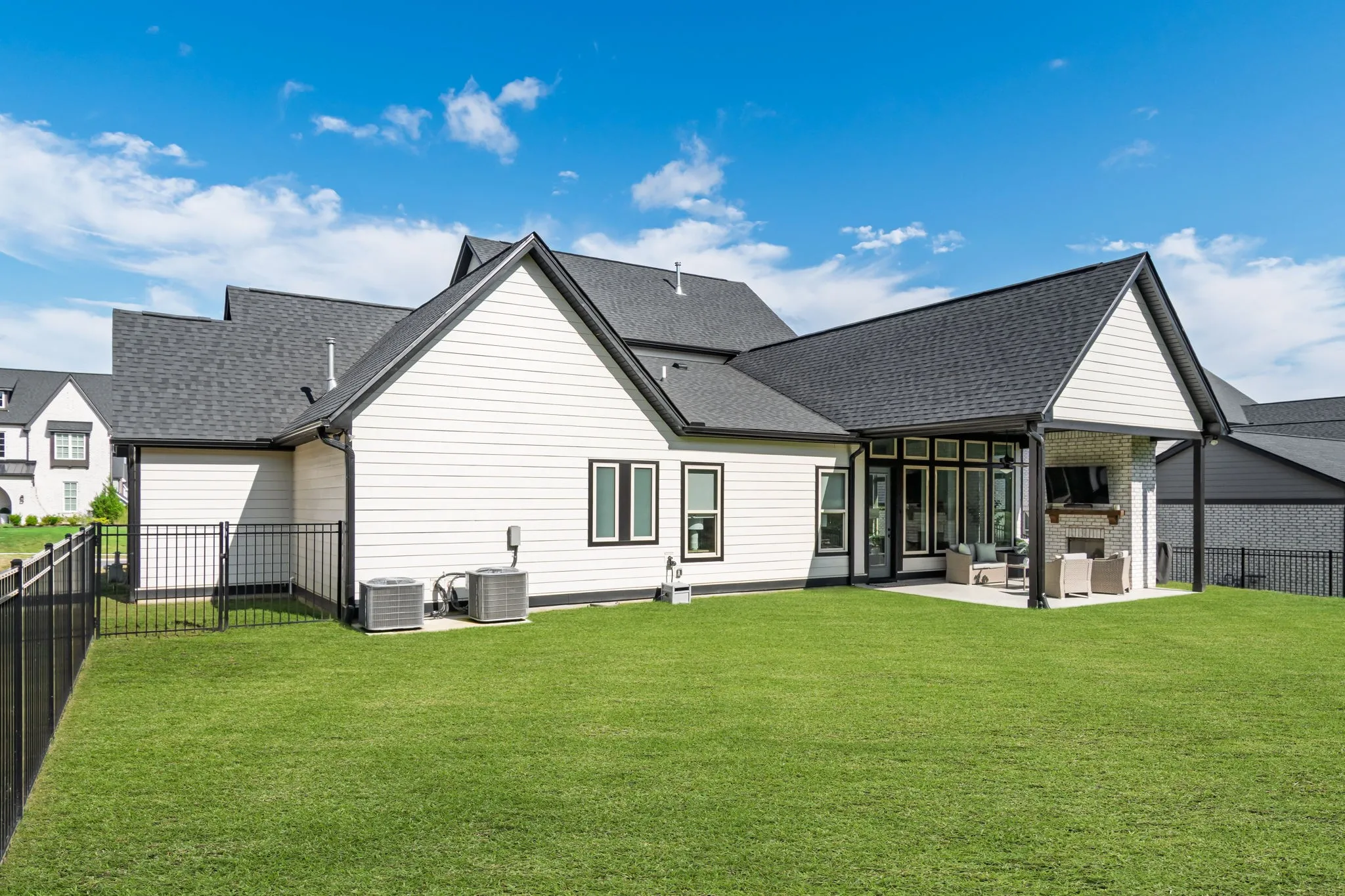 The oversized 2+ car garage includes epoxy floors and extension for storage or a golf cart. Relax year-round on the large covered back porch with fireplace, overlooking a fully fenced yard, peaceful trees, and a neighboring farm with sunset views. Front porch with swing adds charm and curb appeal.