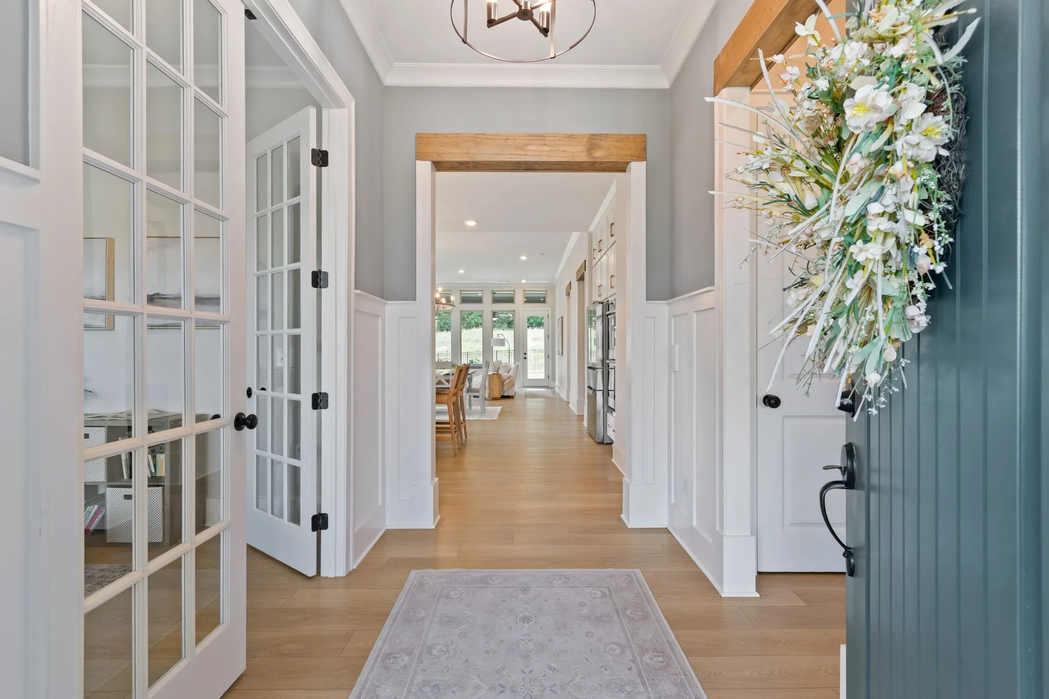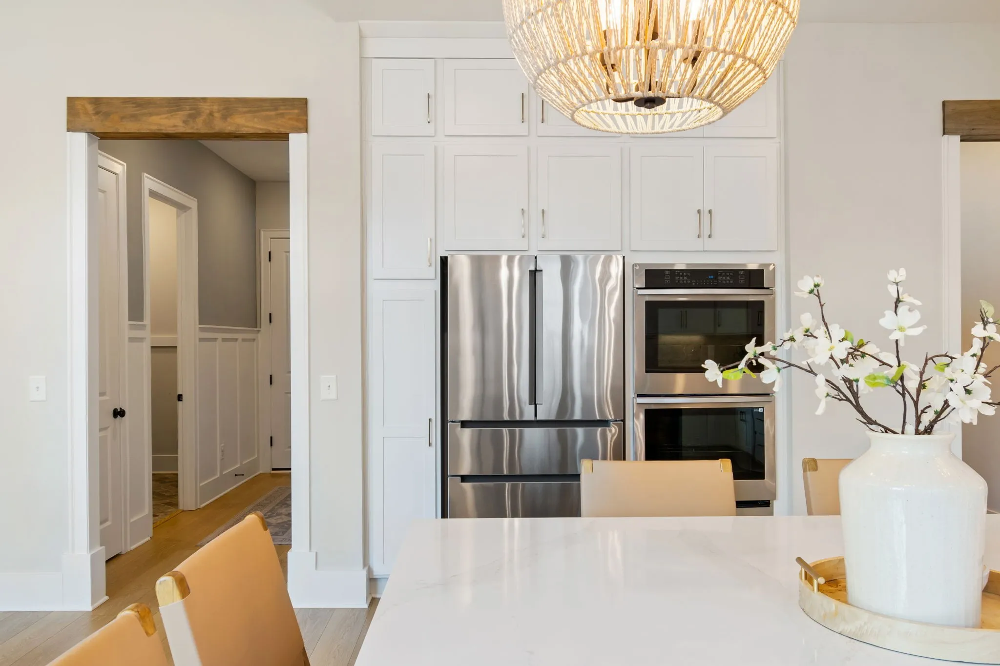 Immaculate and fully upgraded, this stunning 2024-built home offers timeless style and thoughtful finishes throughout. With 4 bedrooms (including 2 on the main level) plus a dedicated office, the layout is ideal for both everyday living and entertaining. The light-filled kitchen is a showstopper—featuring an expansive island, ceiling-height cabinetry, under-cabinet lighting, gas cooktop, double ovens, walk-in pantry, and a chef’s pantry with beverage cooler.