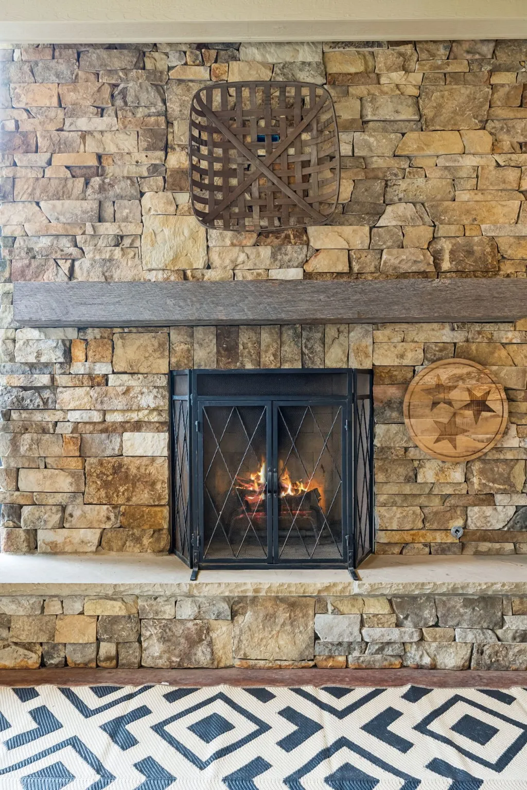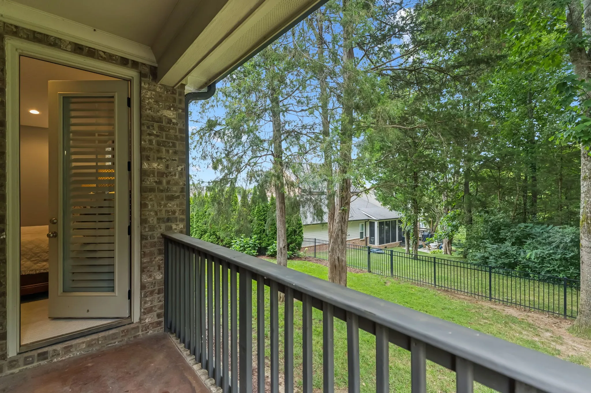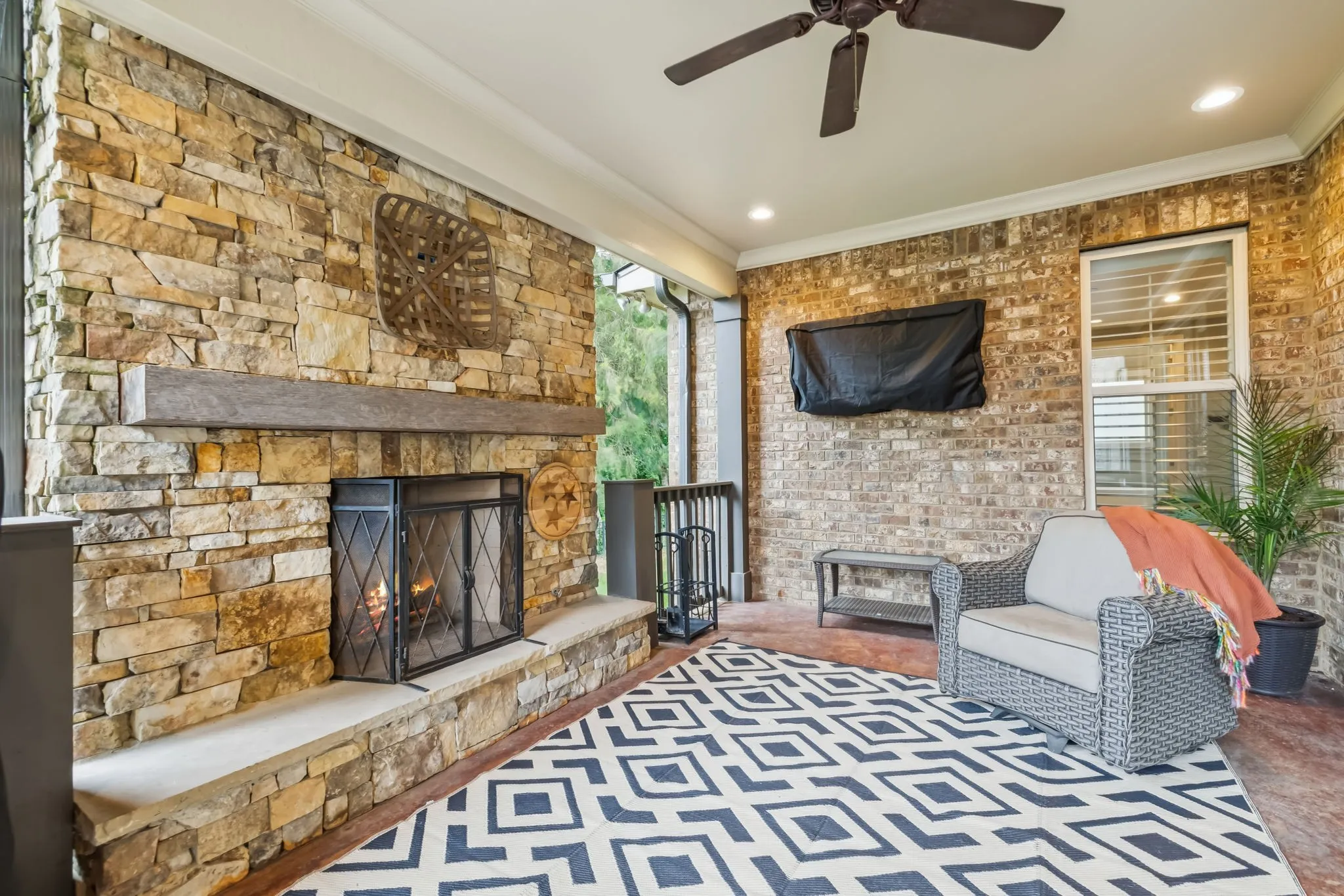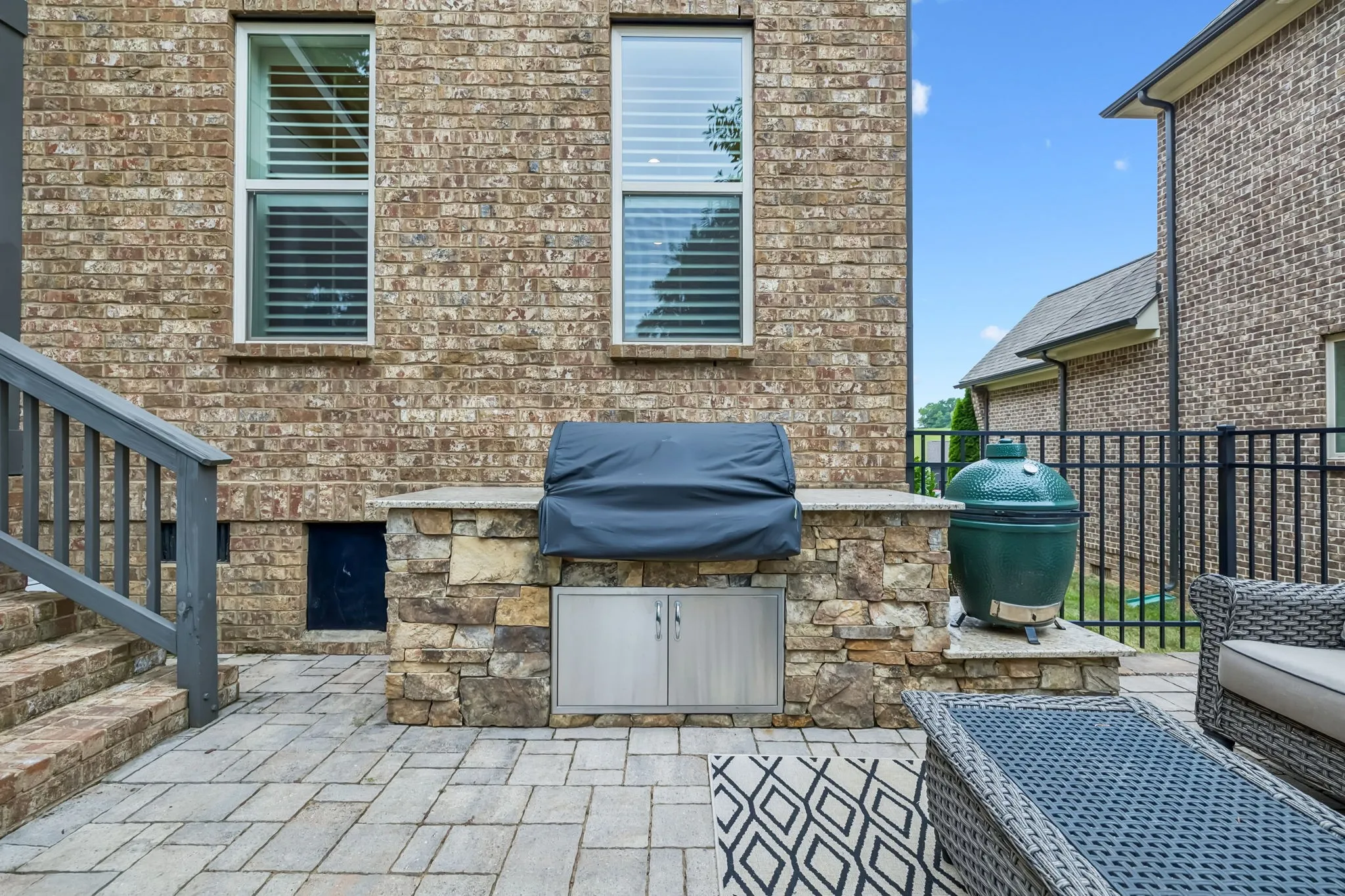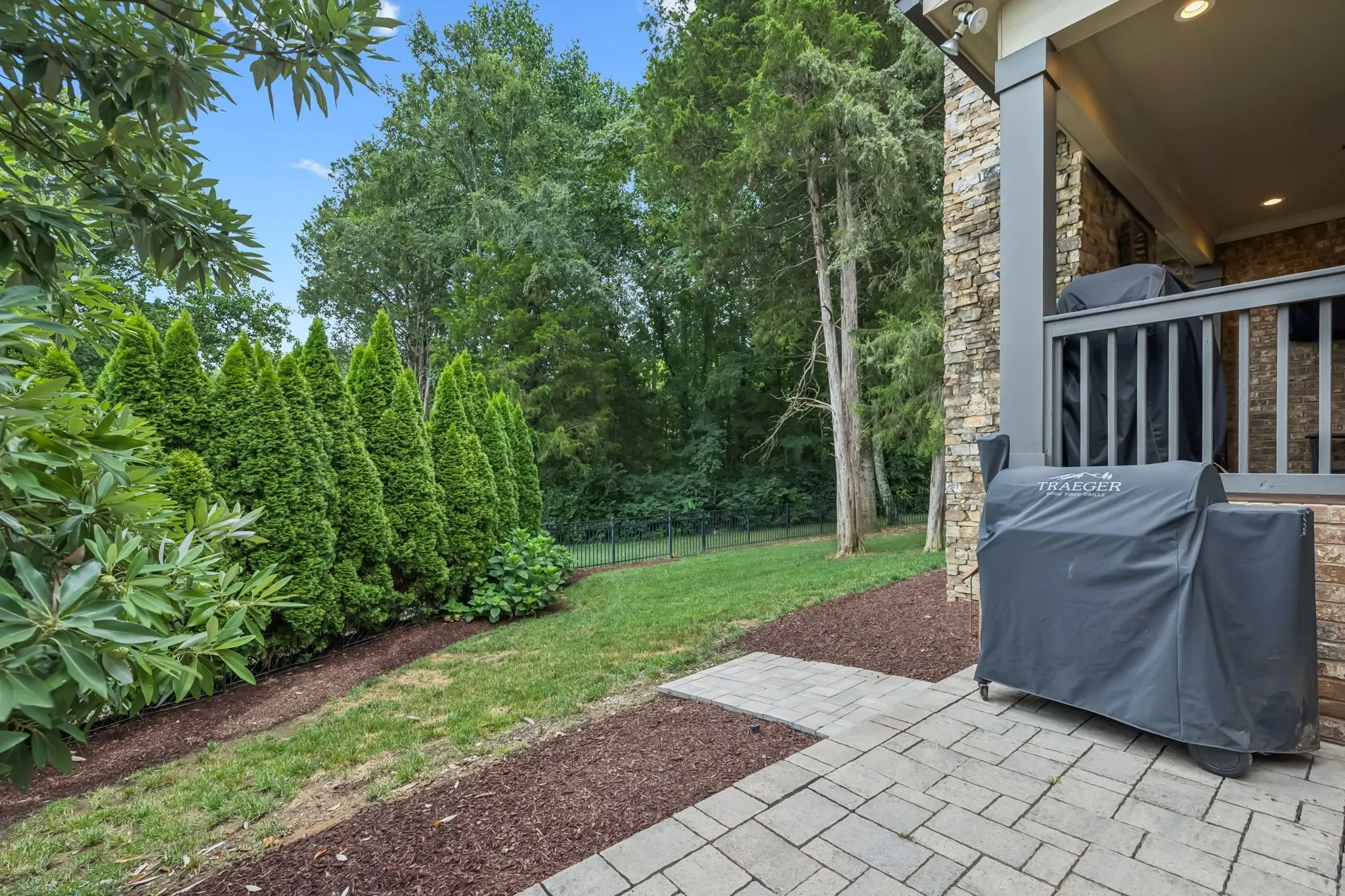 Enjoy outdoor living year-round with a covered porch, wood-burning fireplace (with gas starter), built-in outdoor kitchen, gas grill, and paver patio — all surrounded by lush landscaping, irrigation, and aluminum fencing.\n