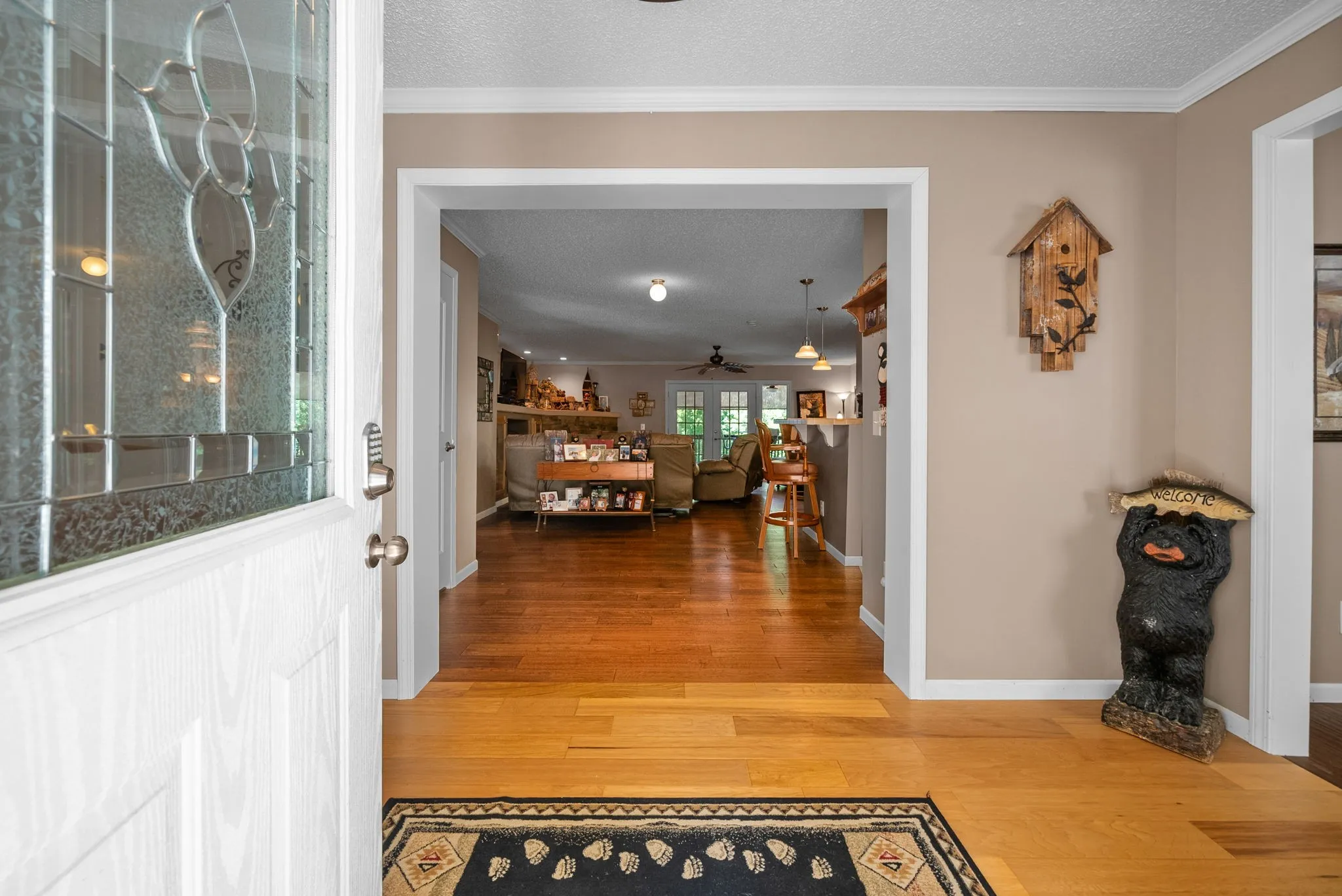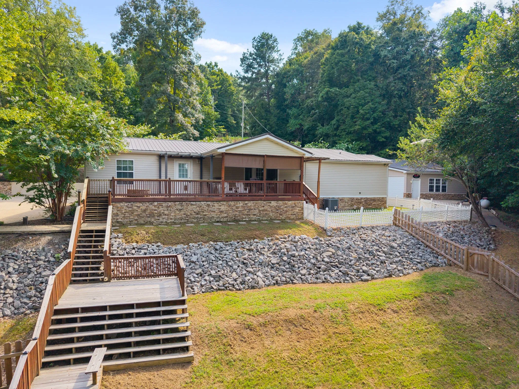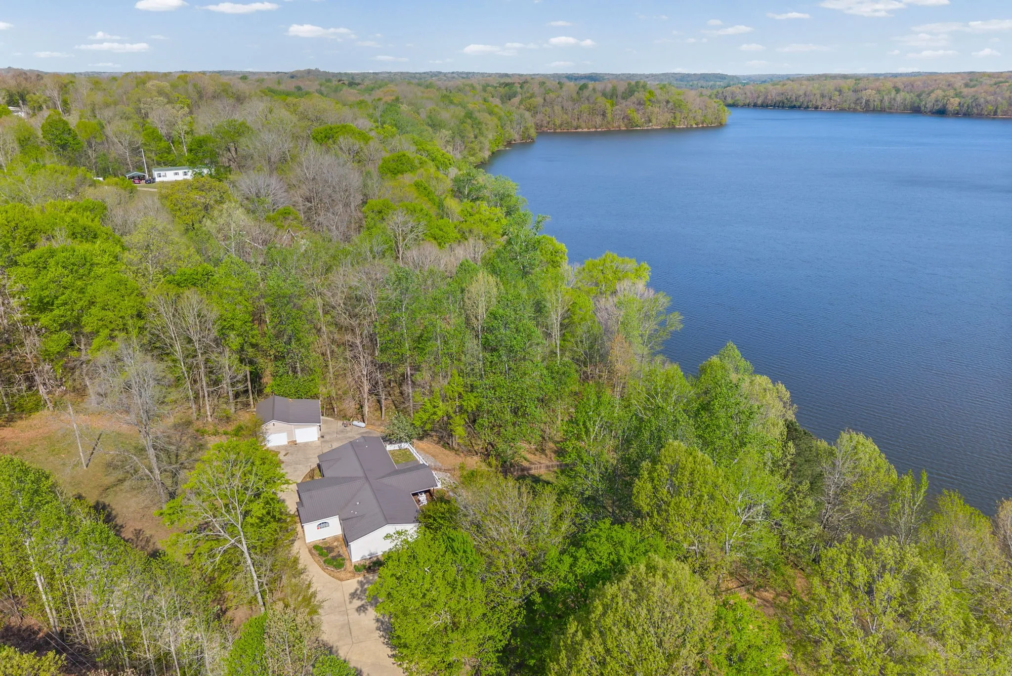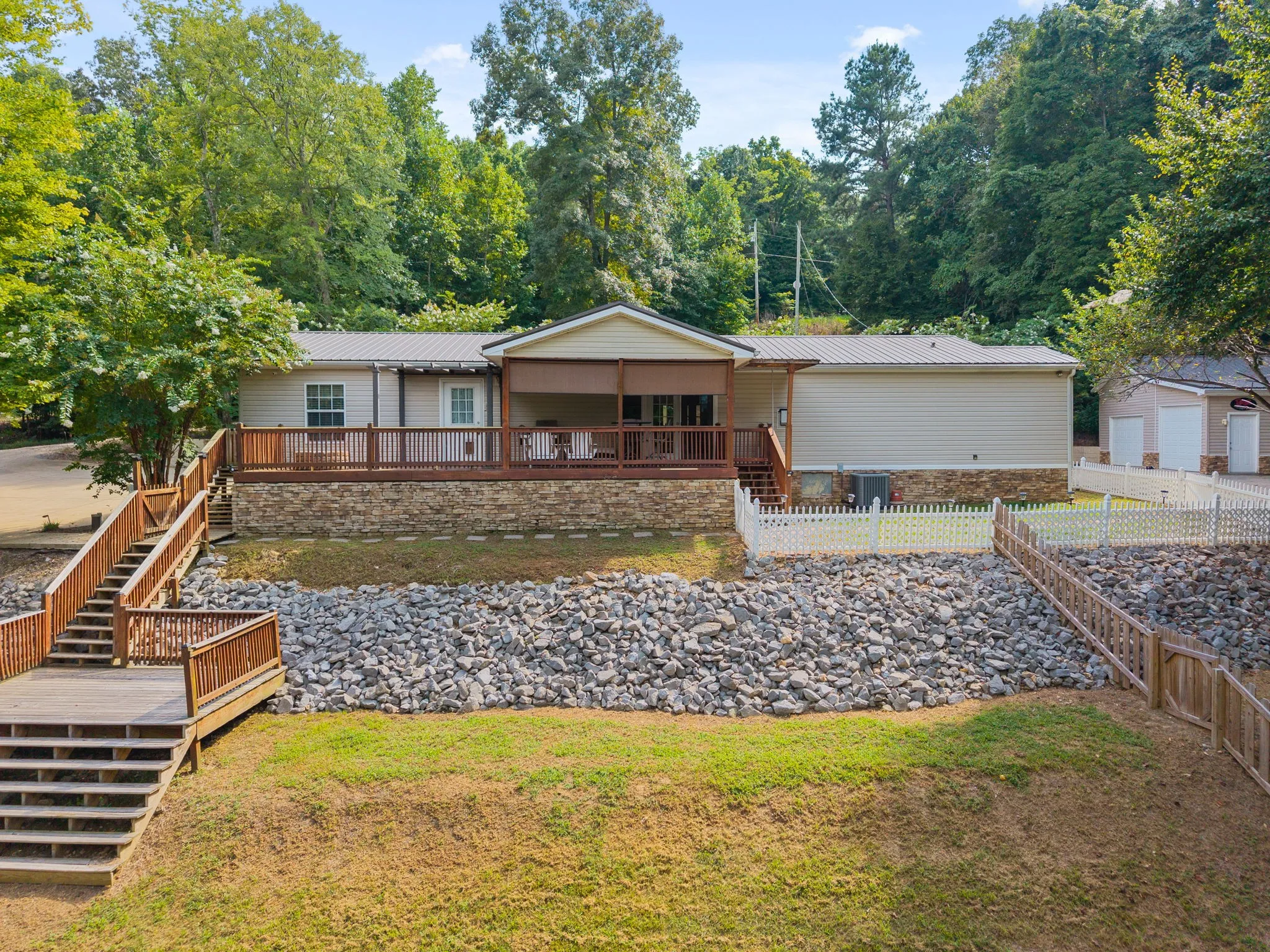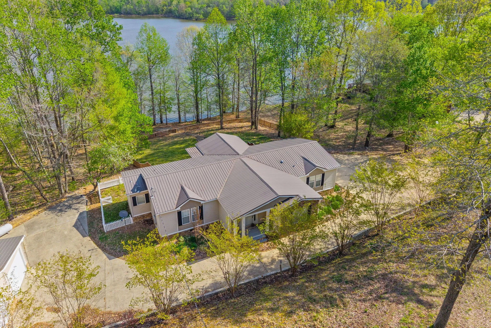 Escape to the tranquility of rural waterfront living! This beautiful home offers an open concept floor plan, precisely placed to enjoy the water view. Gathering room with side built in section with gas logs fireplace-divider bar to the spacious kitchen then leading to the dining room. Master bedroom features a spacious bath and walk in closet. Unique office space in the hallway leading to the 2 guest bedrooms. Laundry room offers a separate door to the back deck. Easy flow floor plan and spacious layout. The back deck is the spot with part covered and part open decking, firepit to the side and steps down to driveway or mid-deck and leading to the back lawn and walkway toward the water. Fenced back lawn is ready for the pets, You find a generous driveway space beyond the front of the home and to the detached garage. Garage is a 2 section connecting setup ; 24 x 11 with back door to additional space and a side 25×16 w/ ample cabinets and storage racks. A storage area is found behind the garage, as well.