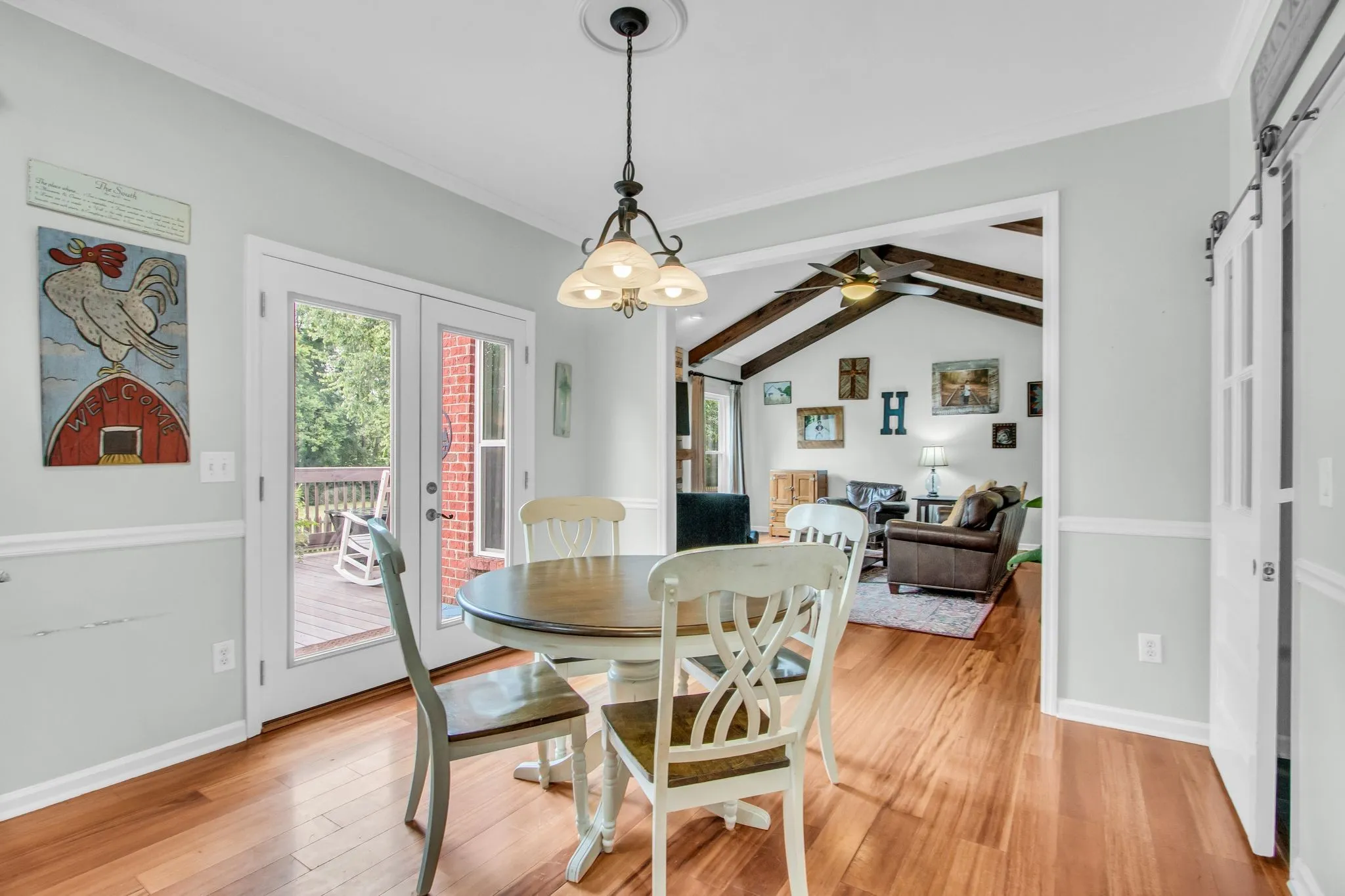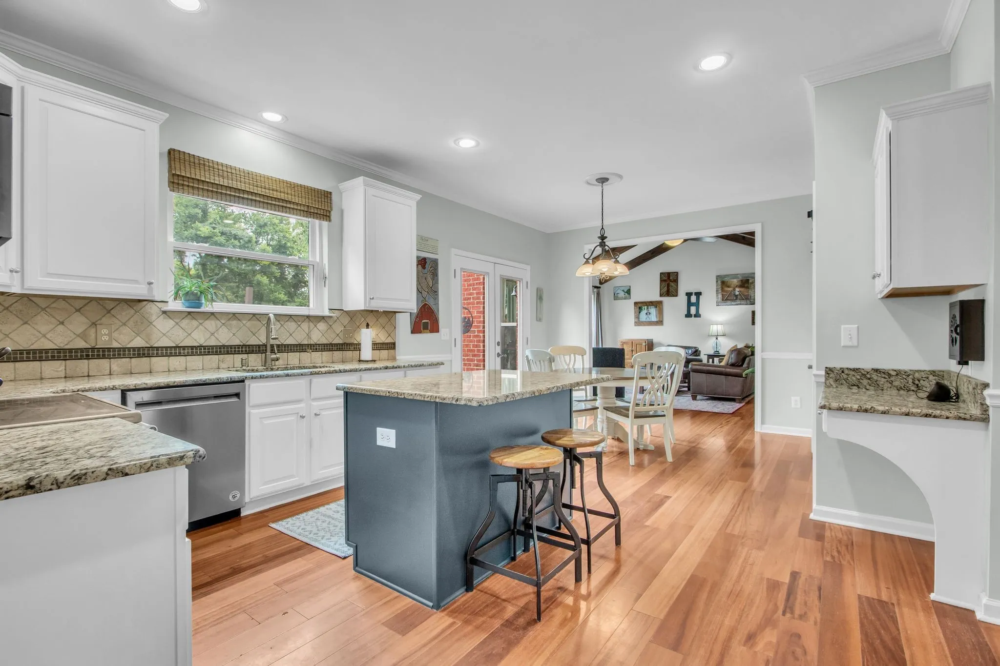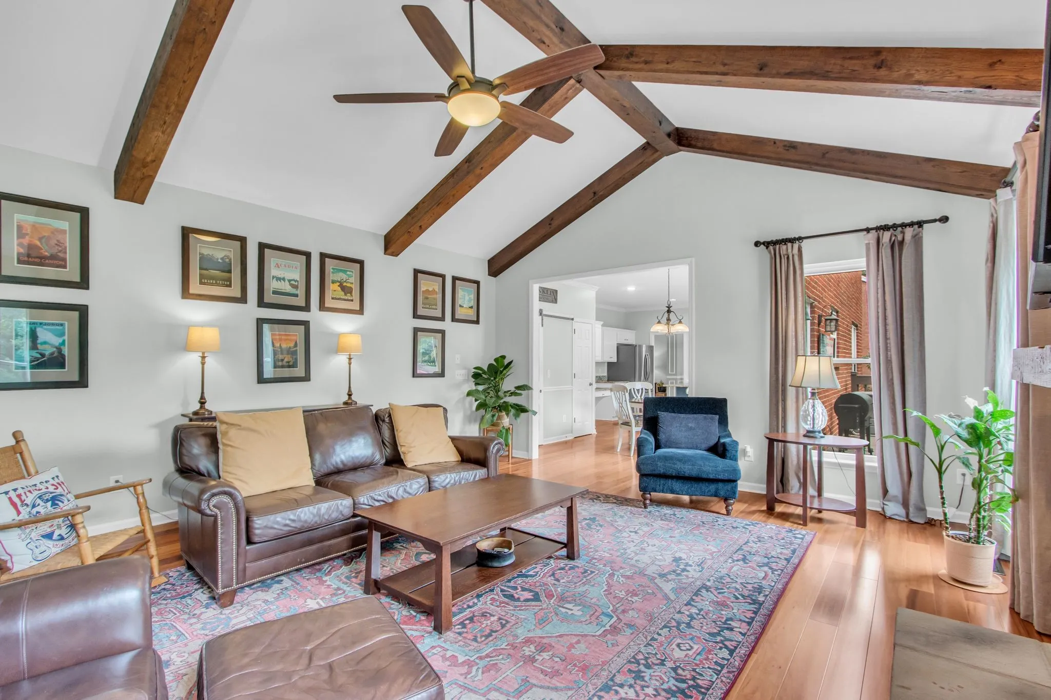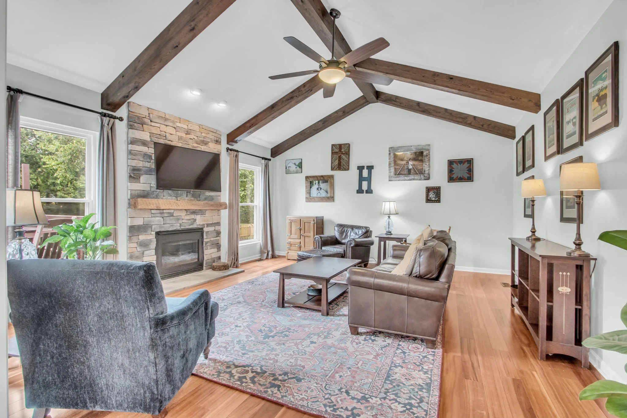 Inside, you’ll find hardwood floors, granite countertops, and a cozy den with a beamed ceiling and fireplace perfect for relaxing or entertaining. Upstairs, the primary suite provides a peaceful retreat, accompanied by three additional bedrooms and a generous bonus space.