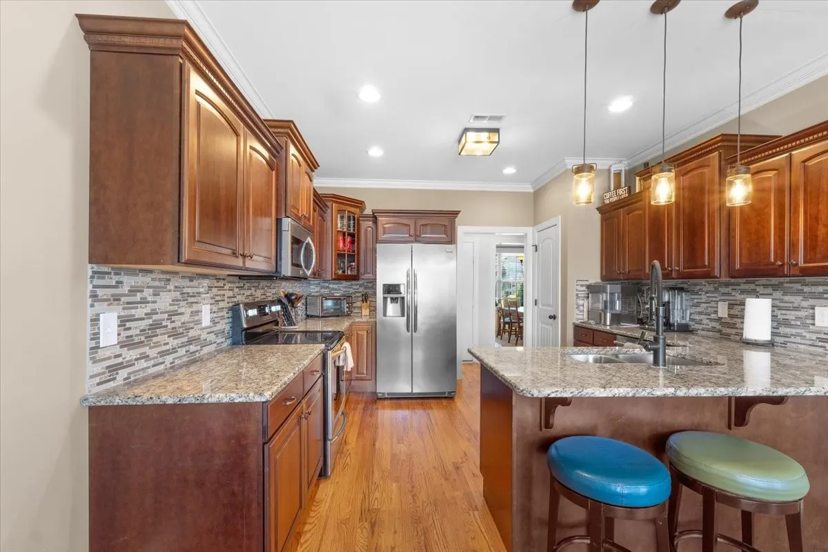 Inside, you’ll find 4 bedrooms, 3 full bathrooms, and a spacious bonus room, providing flexibility for any lifestyle. The main living areas feature real hardwood flooring, while the bedrooms and upstairs include plush carpet for added comfort. The kitchen is designed to impress with granite countertops and an open flow perfect for entertaining.