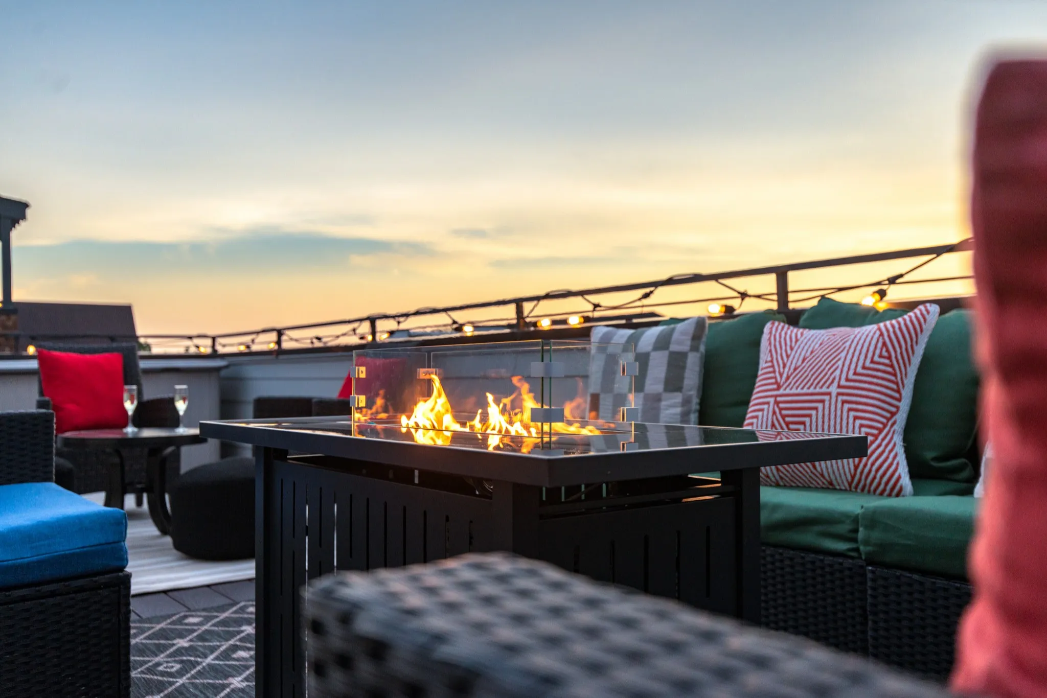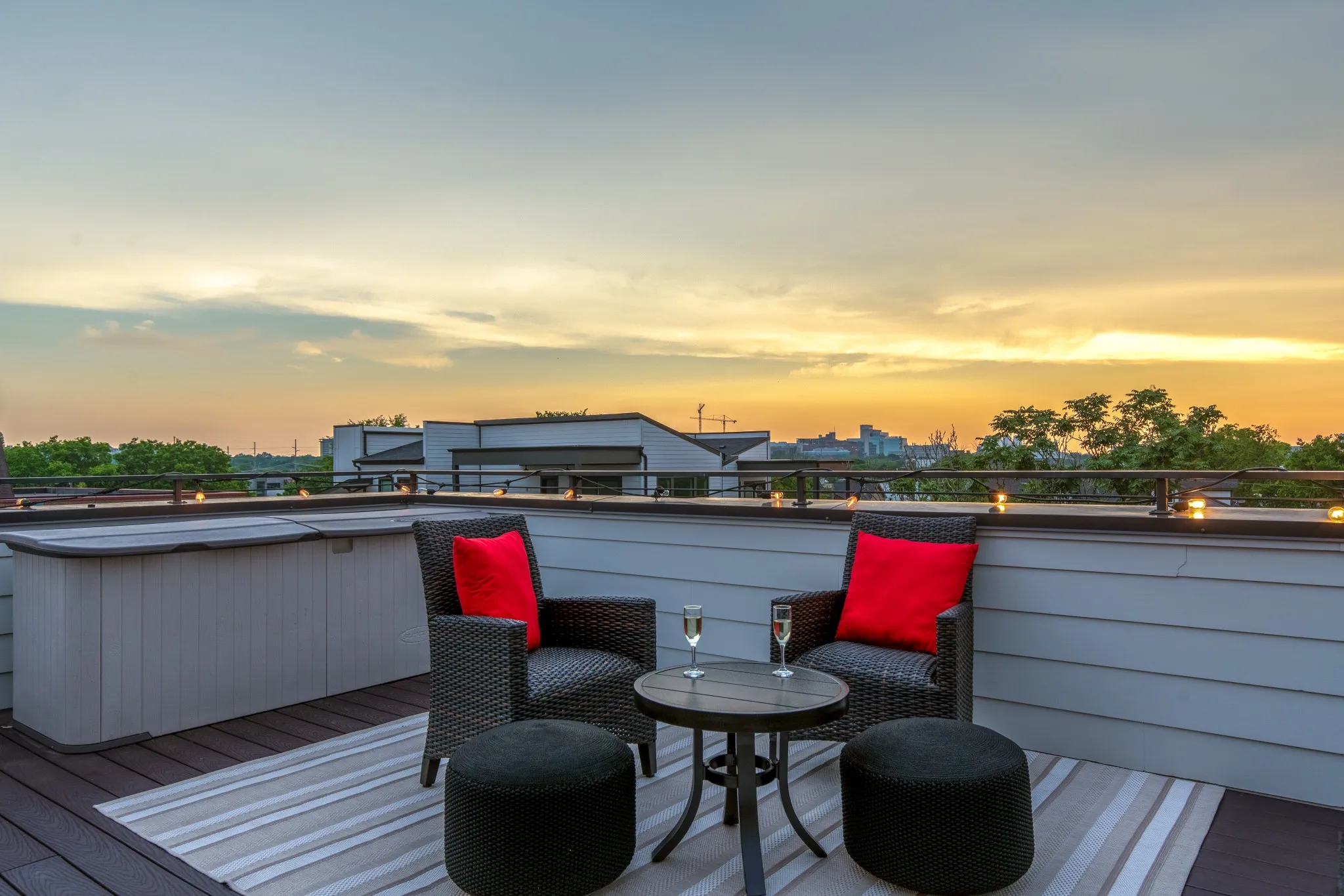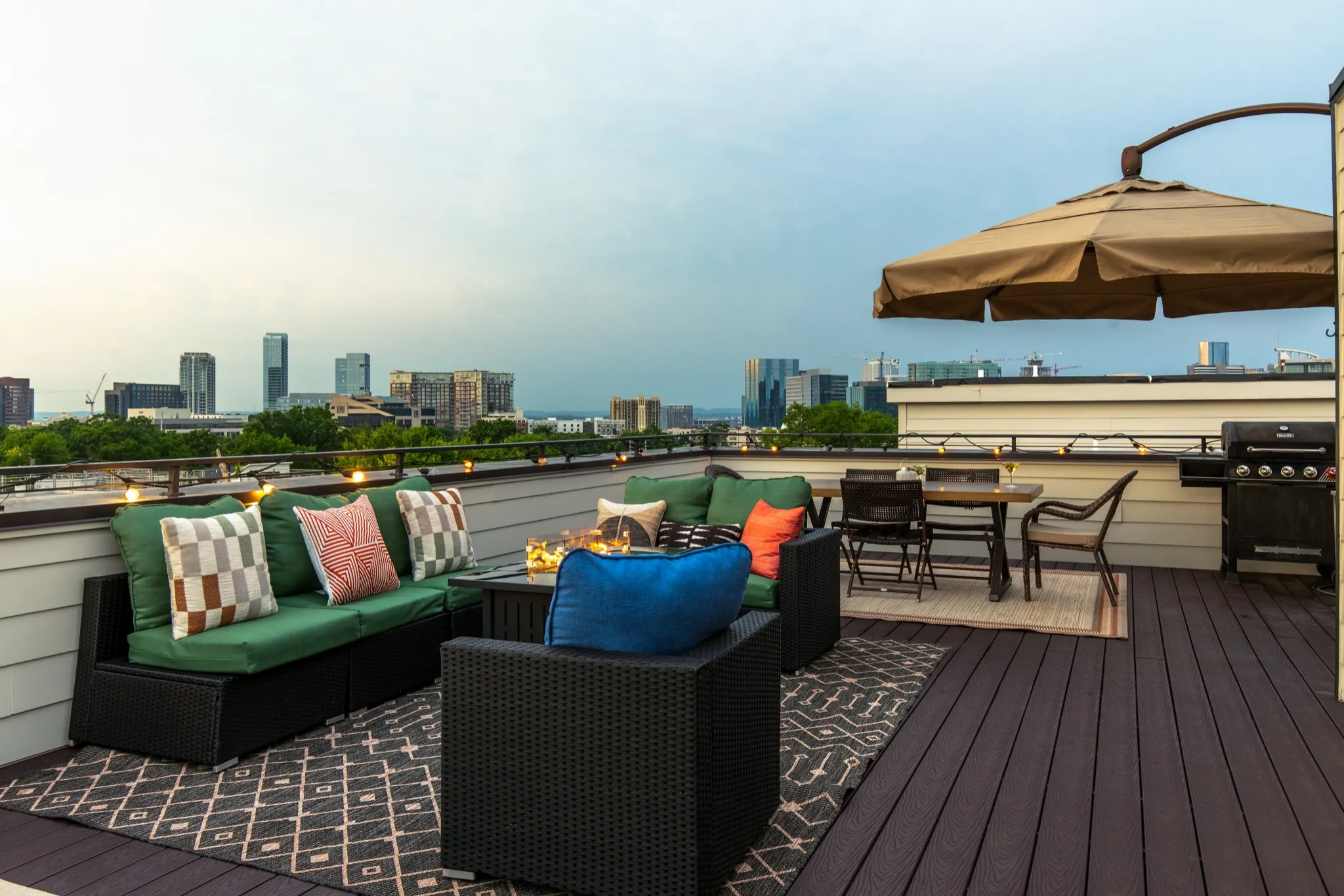 The rooftop deck is a standout feature, offering panoramic skyline views, lounge seating, dining area, and outdoor BBQ—perfect for gatherings or relaxing evenings under the stars.