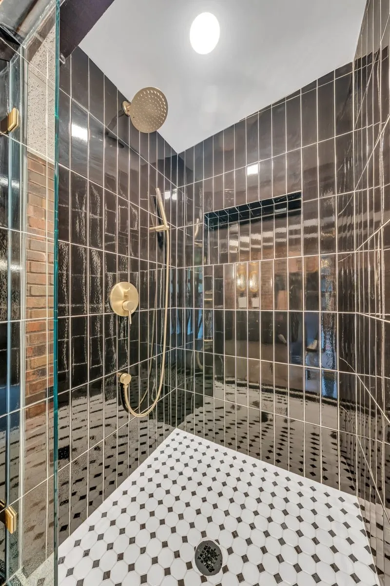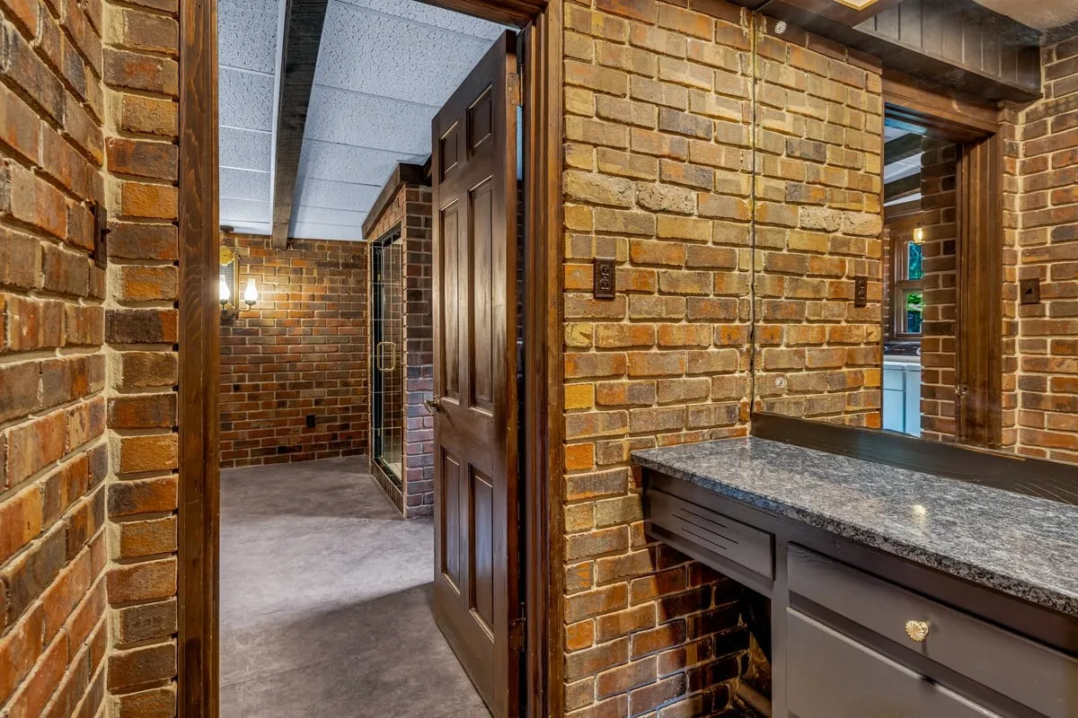 Primary suite with 2 closets, built-in vanity, brick-walled bath with double granite vanity and custom tile shower