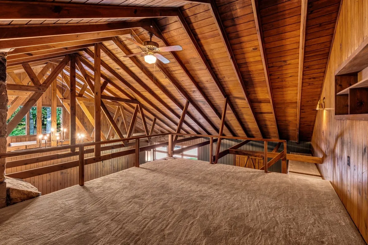 Loft overlooking living room with stone wood-burning fireplace & second fireplace in kitchen