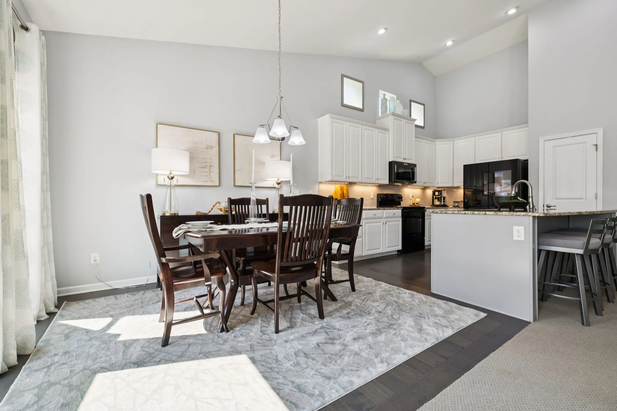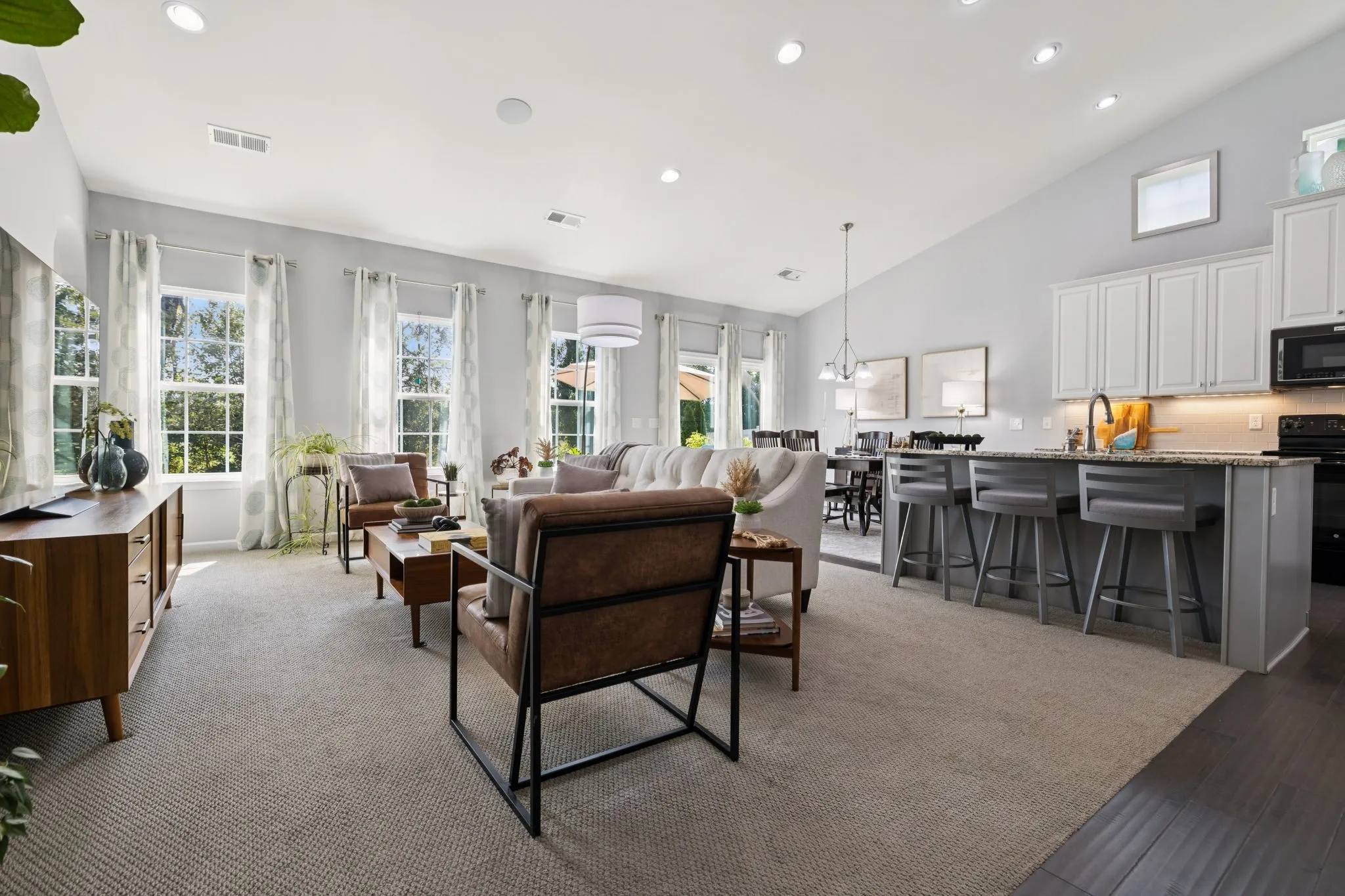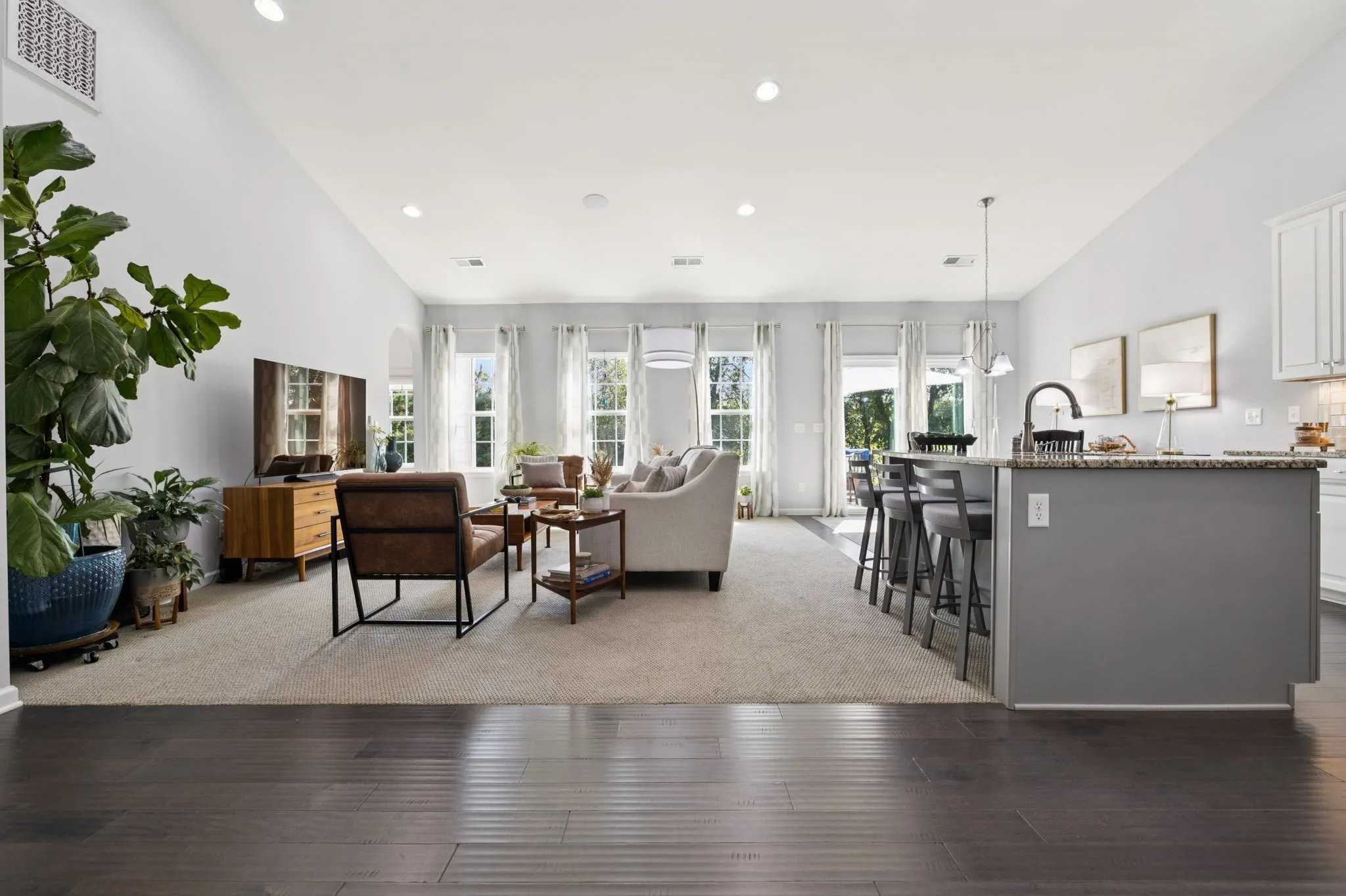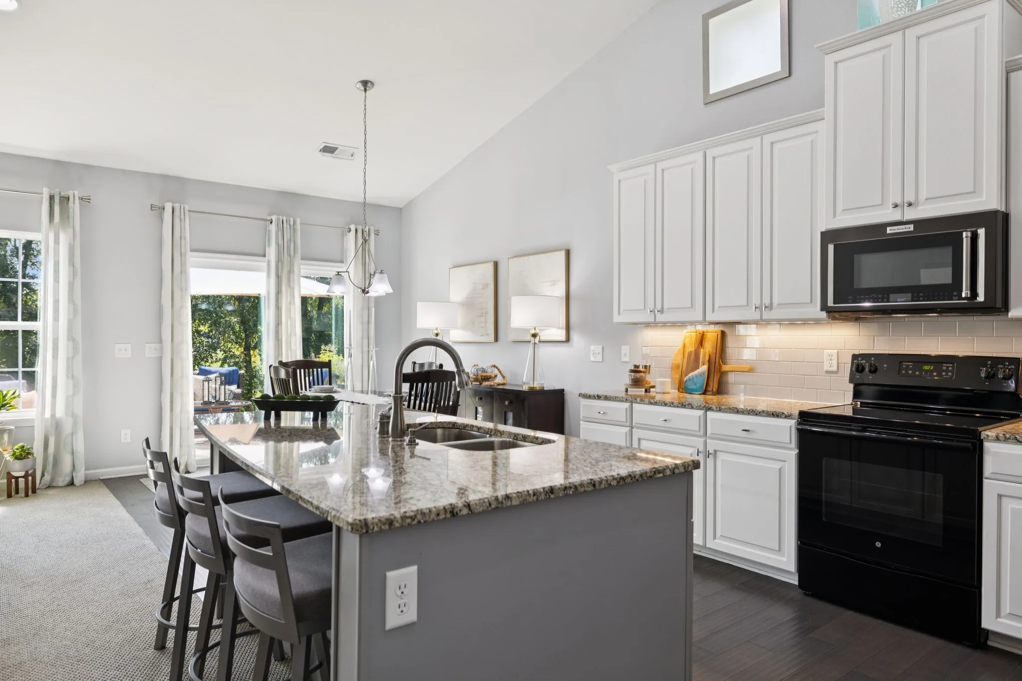 The gourmet kitchen features sleek granite countertops, stainless steel appliances, brand new fancy fridge and a large island/breakfast bar overlooking the living and dining areas; a seamless space for gathering with family and friends.