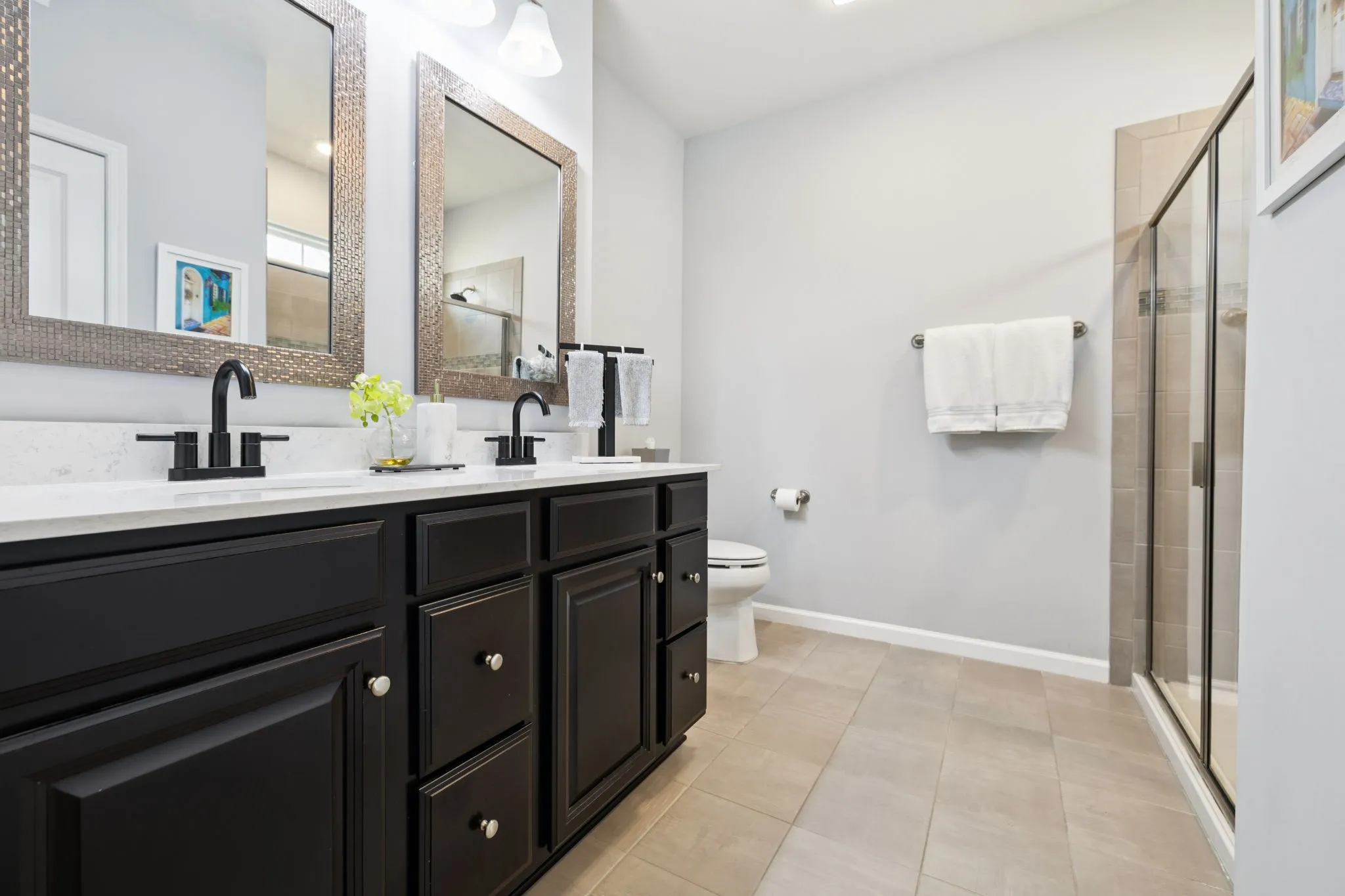 The primary suite provides a true retreat with a spa-like bathroom complete with dual vanities, a large tiled shower and big linen closet. Additional bedrooms are generously sized, offering plenty of flexibility for guests, a home office, or a playroom.