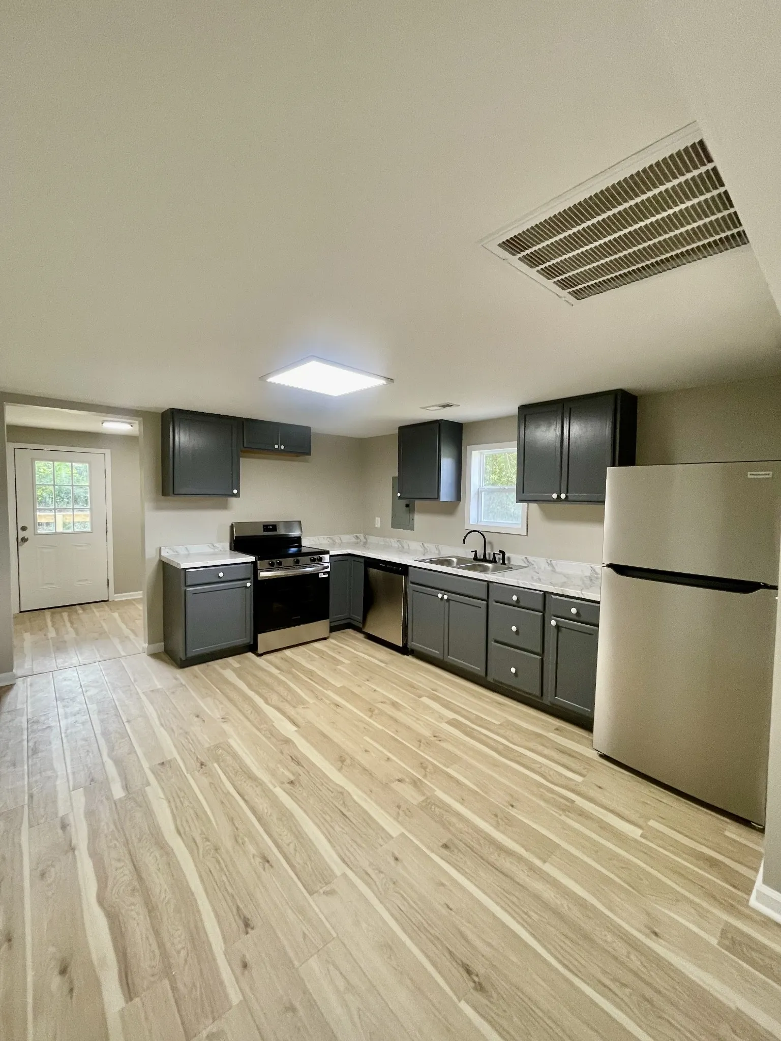 What a perfect starter home! This 2 bedroom, 1 bath home has been completely gutted and renovated. The open floor plan makes this home feel spacious. You will enjoy a separate laundry room and a large deck on the back of the house. Brand new unit, roof, windows, stainless appliances, hot water heater, are just a few of the bonuses in this like new, functional home.