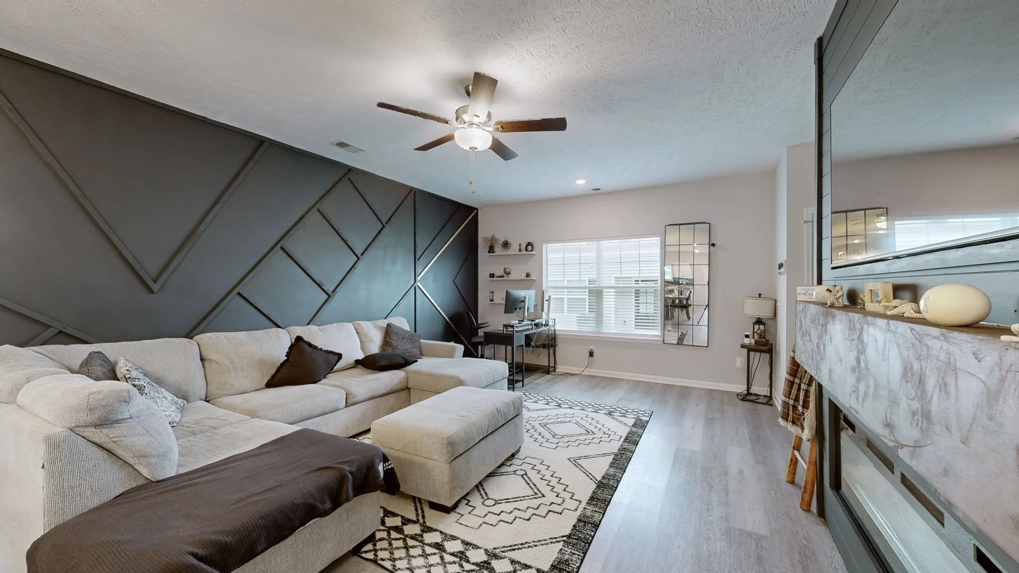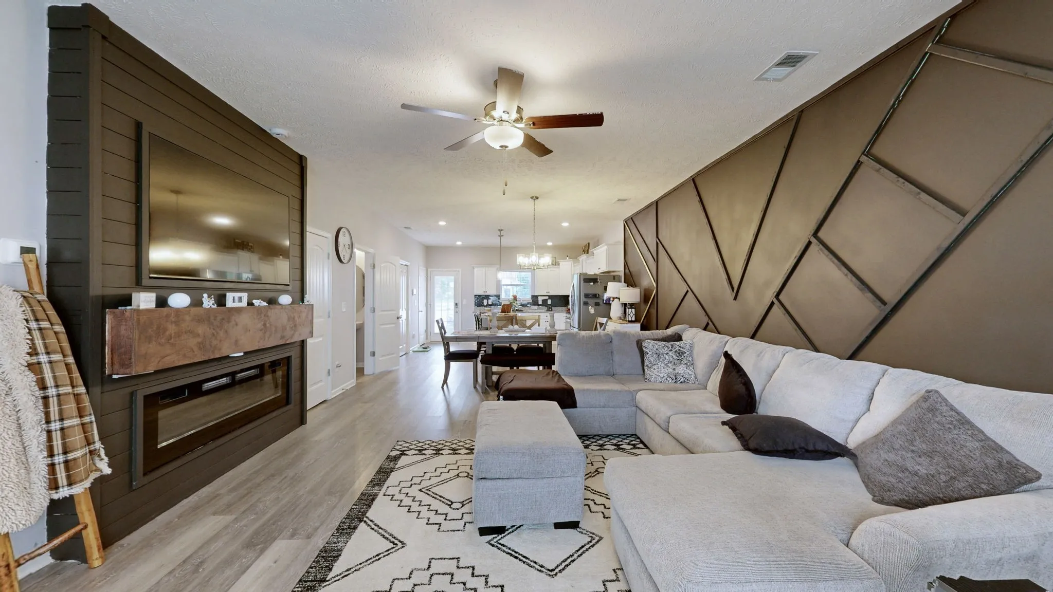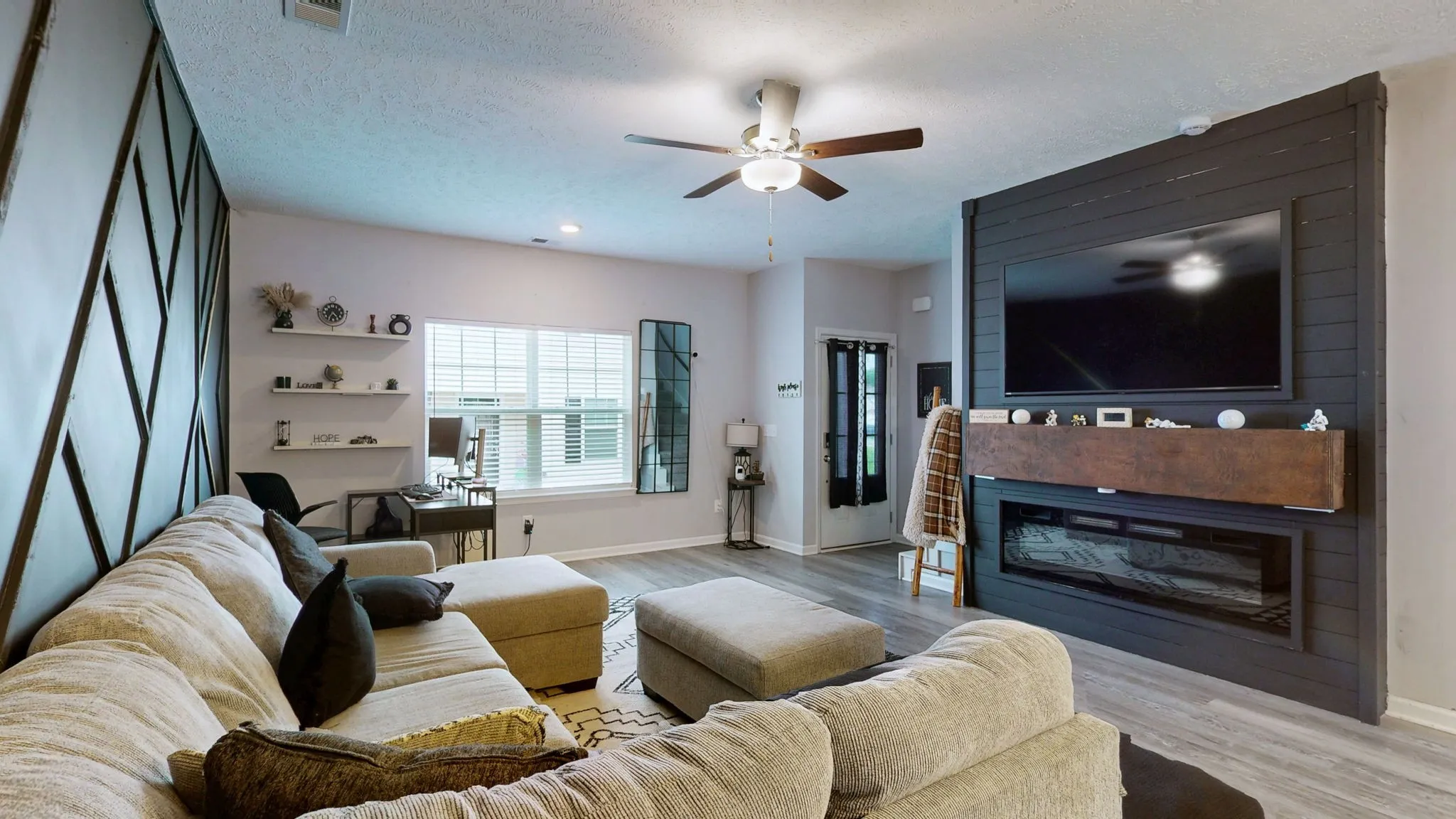 Cozy electric fireplace with custom chimney and accent wall in the living area
