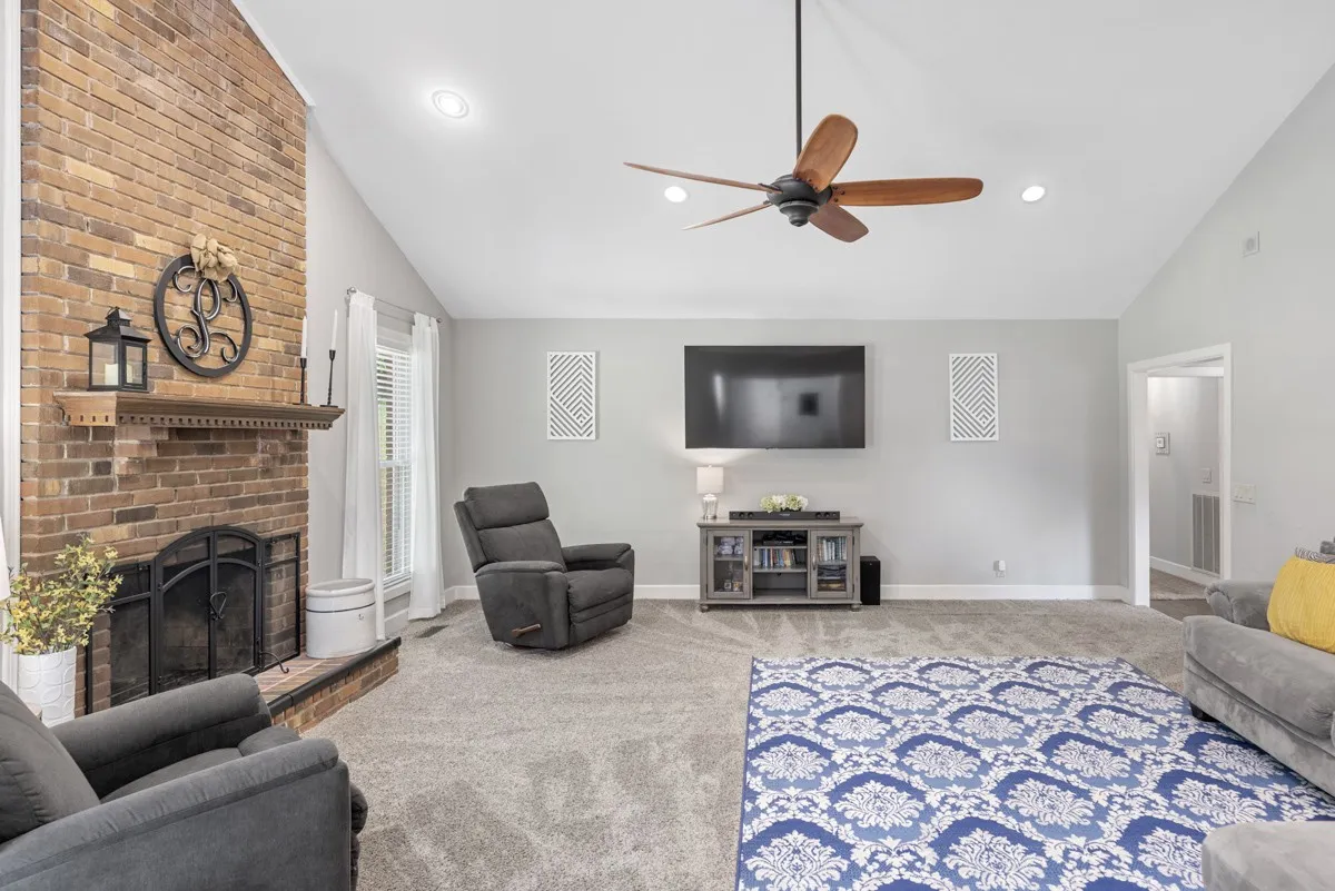 Step inside to discover four spacious bedrooms, all conveniently located on the main floor, and three full bathrooms. The home boasts an open-concept floor plan with a vaulted ceiling in the living room and a stunning brick wood-burning fireplace—perfect for cozy evenings.