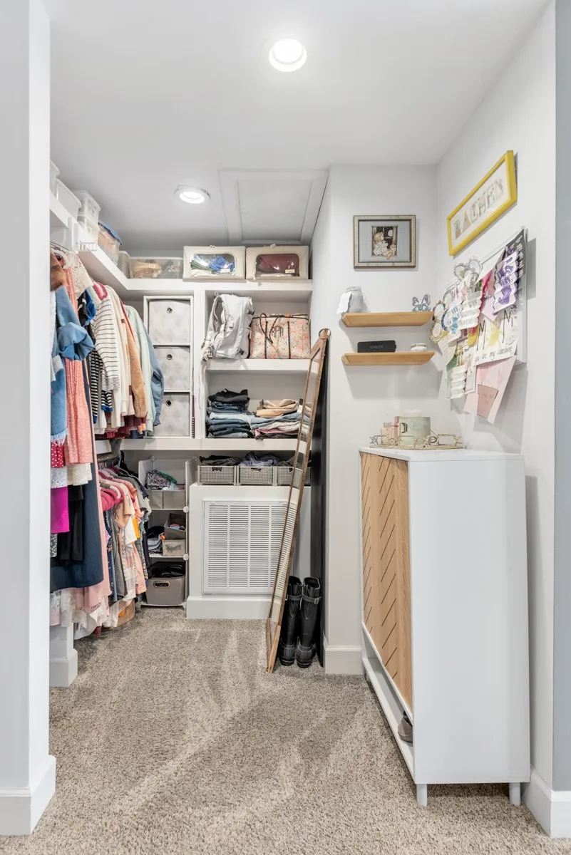 The primary suite is a true retreat, complete with a private full bathroom that showcases a custom tile shower and ample closet space for his and hers wardrobes.