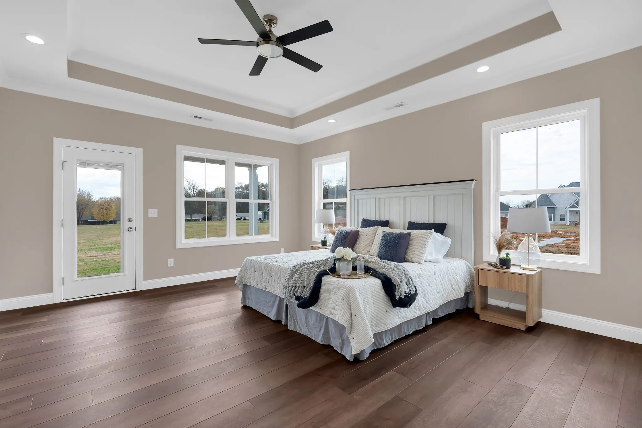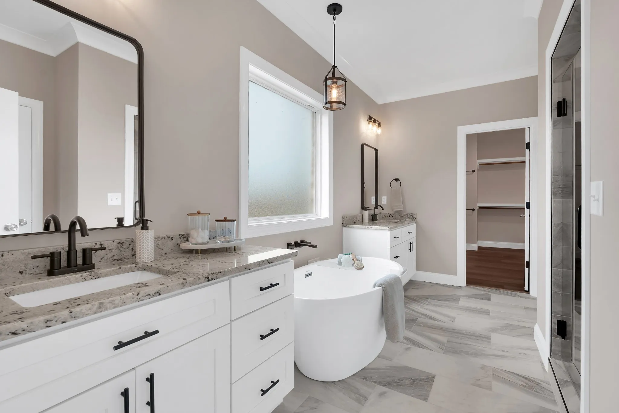 Step inside to find luxury vinyl plank flooring throughout the main level, a spacious living area, and a gorgeous kitchen with an electric range, a complete LG appliance package, and sleek brushed nickel and black hardware. The primary suite is a true retreat, featuring a tray ceiling, a spa-inspired bathroom with a freestanding tub, separate shower, and dual vanities.