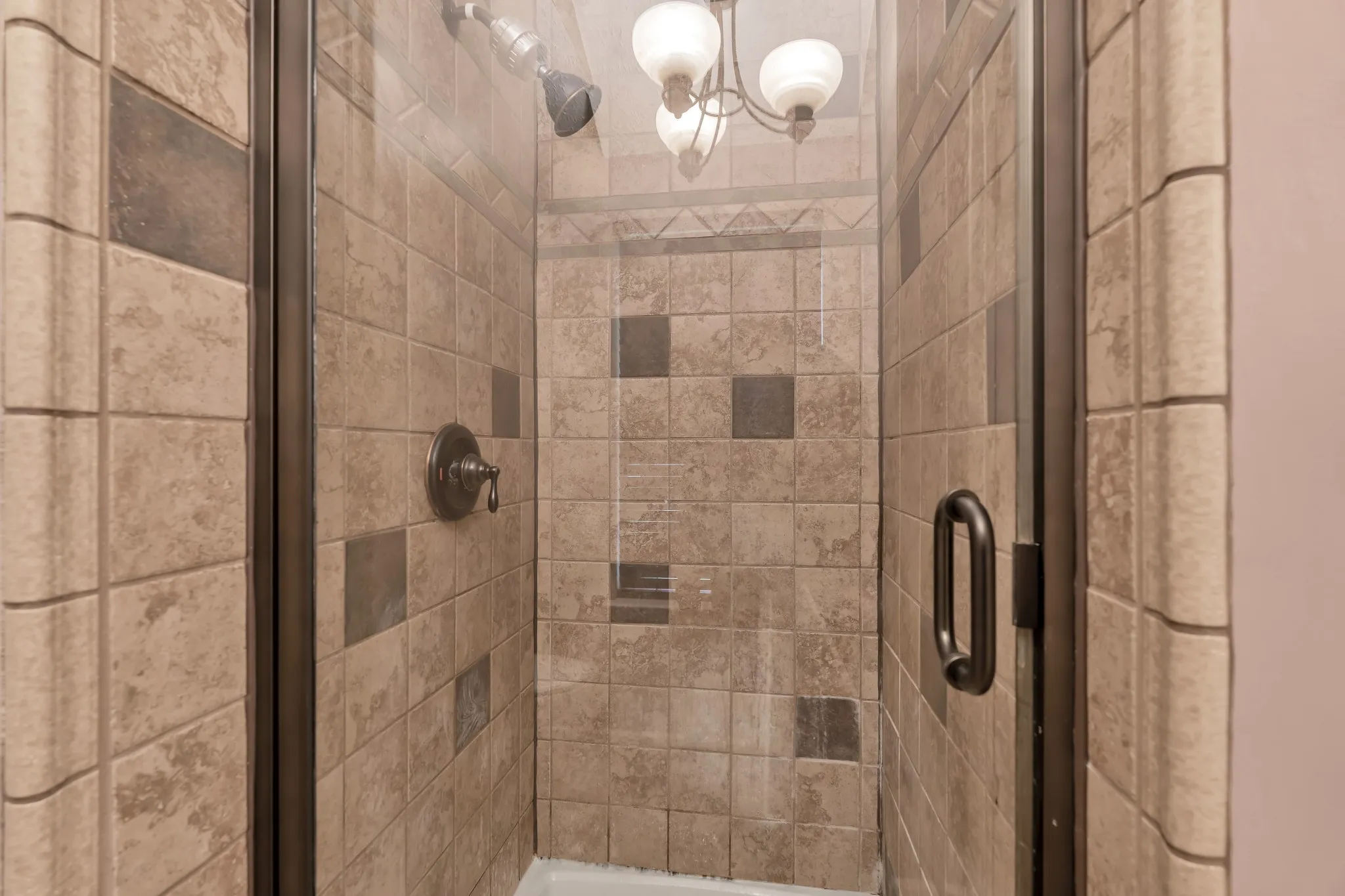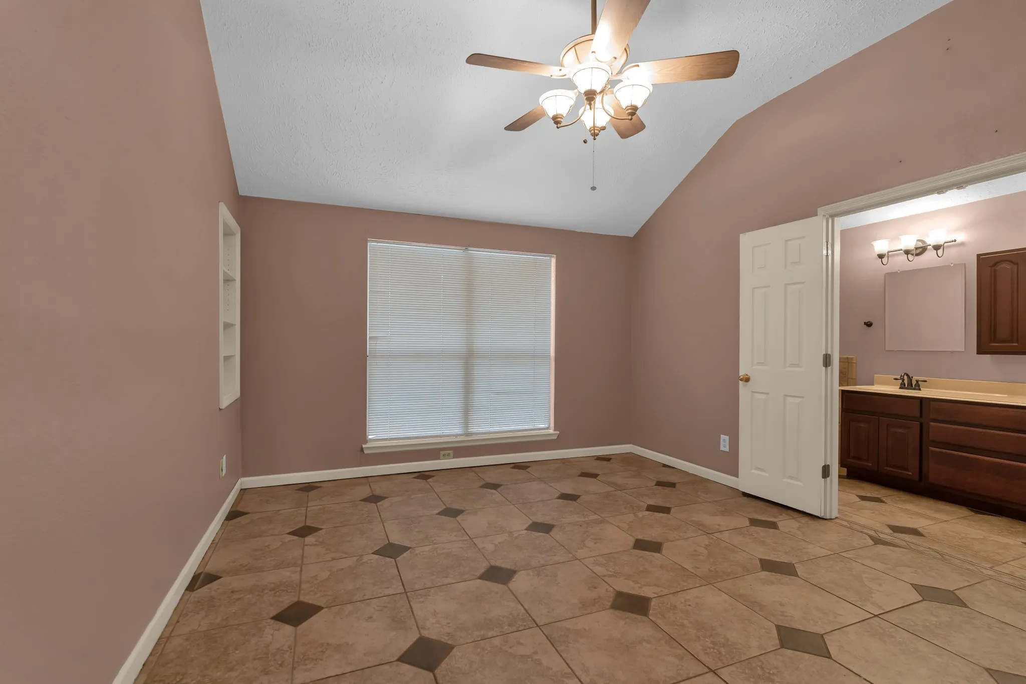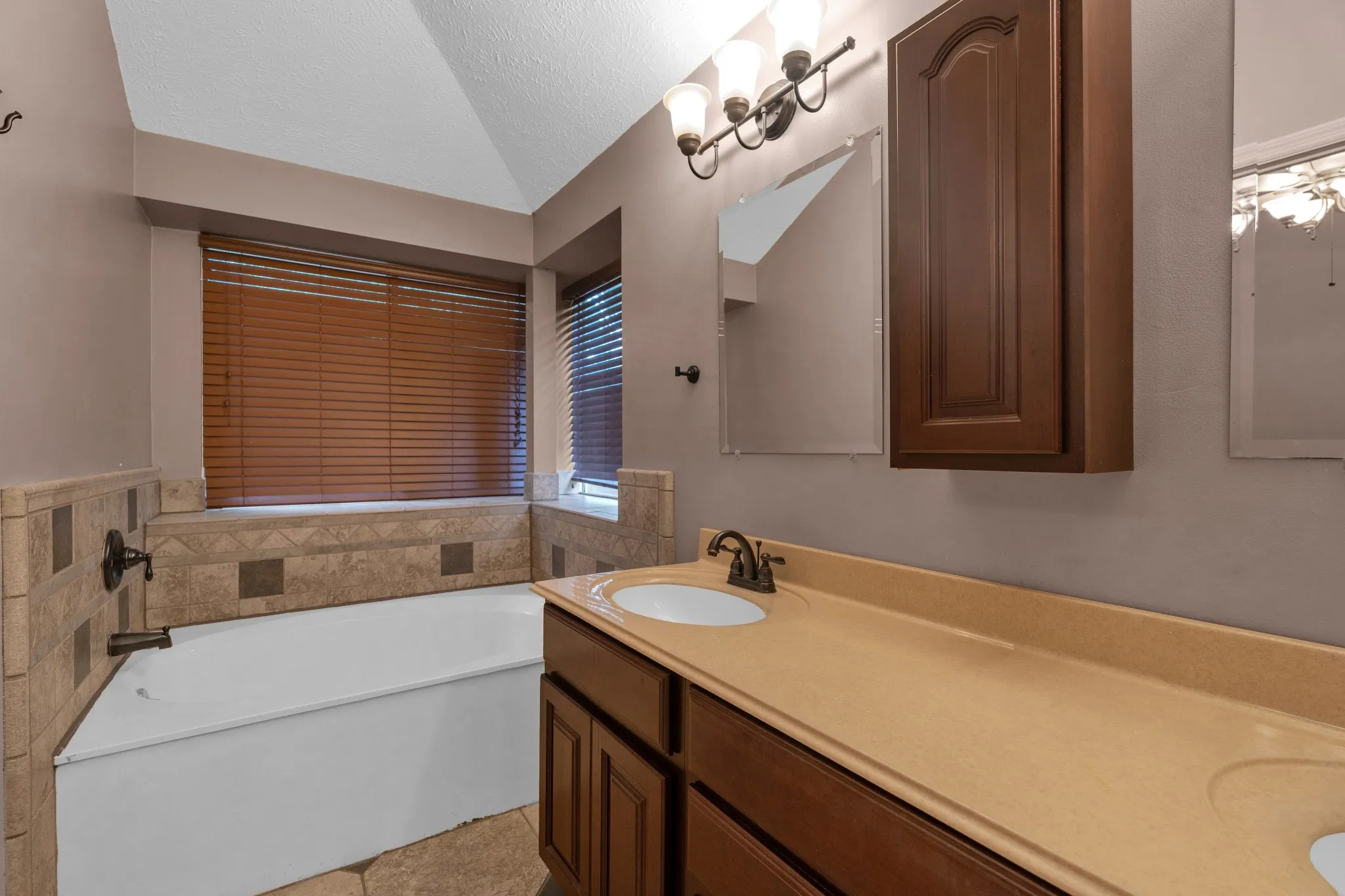 The primary suite includes dual sinks, a soaking tub, and a separate shower. Two additional bedrooms are generously sized and share a well-appointed secondary bathroom.