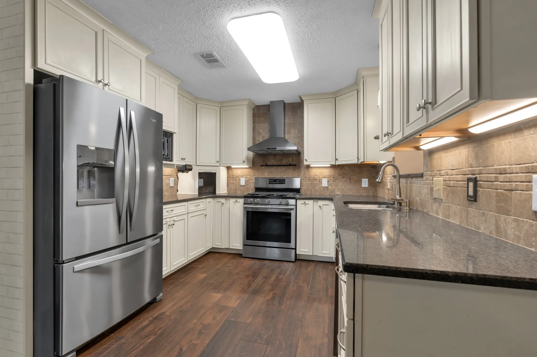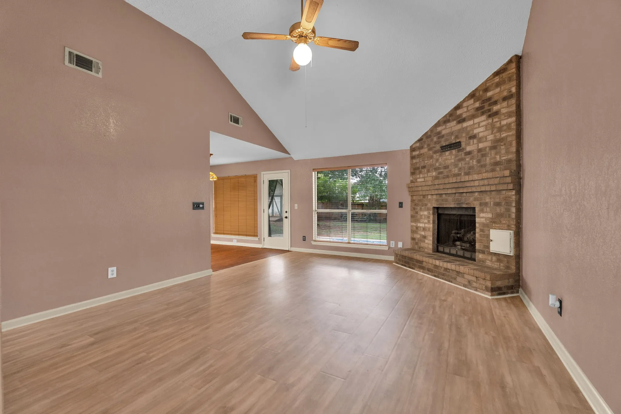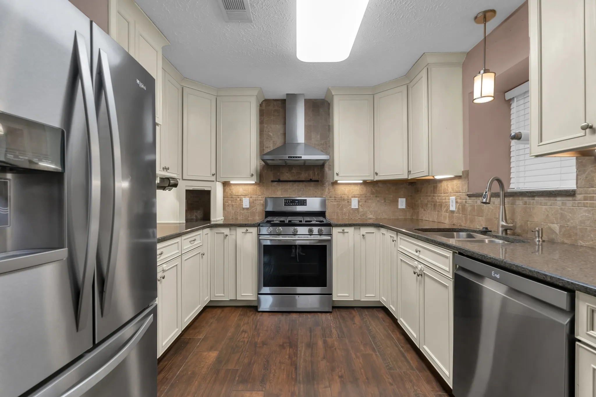 Step into the large living room with soaring ceilings and a striking brick-front fireplace — a perfect centerpiece for the space. The eat-in kitchen features updated cabinets, a stylish stone tile backsplash, and a new refrigerator and dishwasher installed in May 2024.