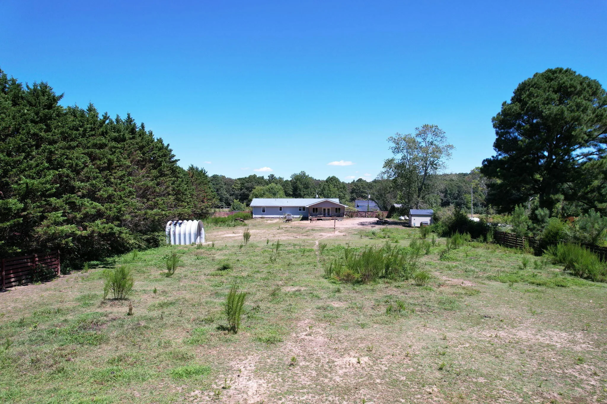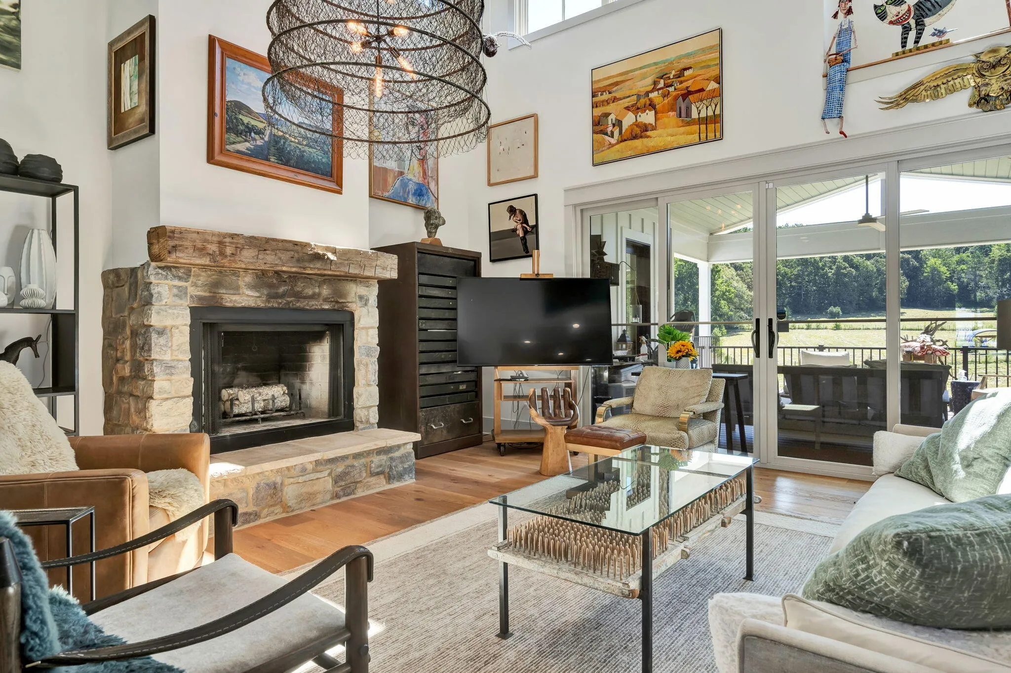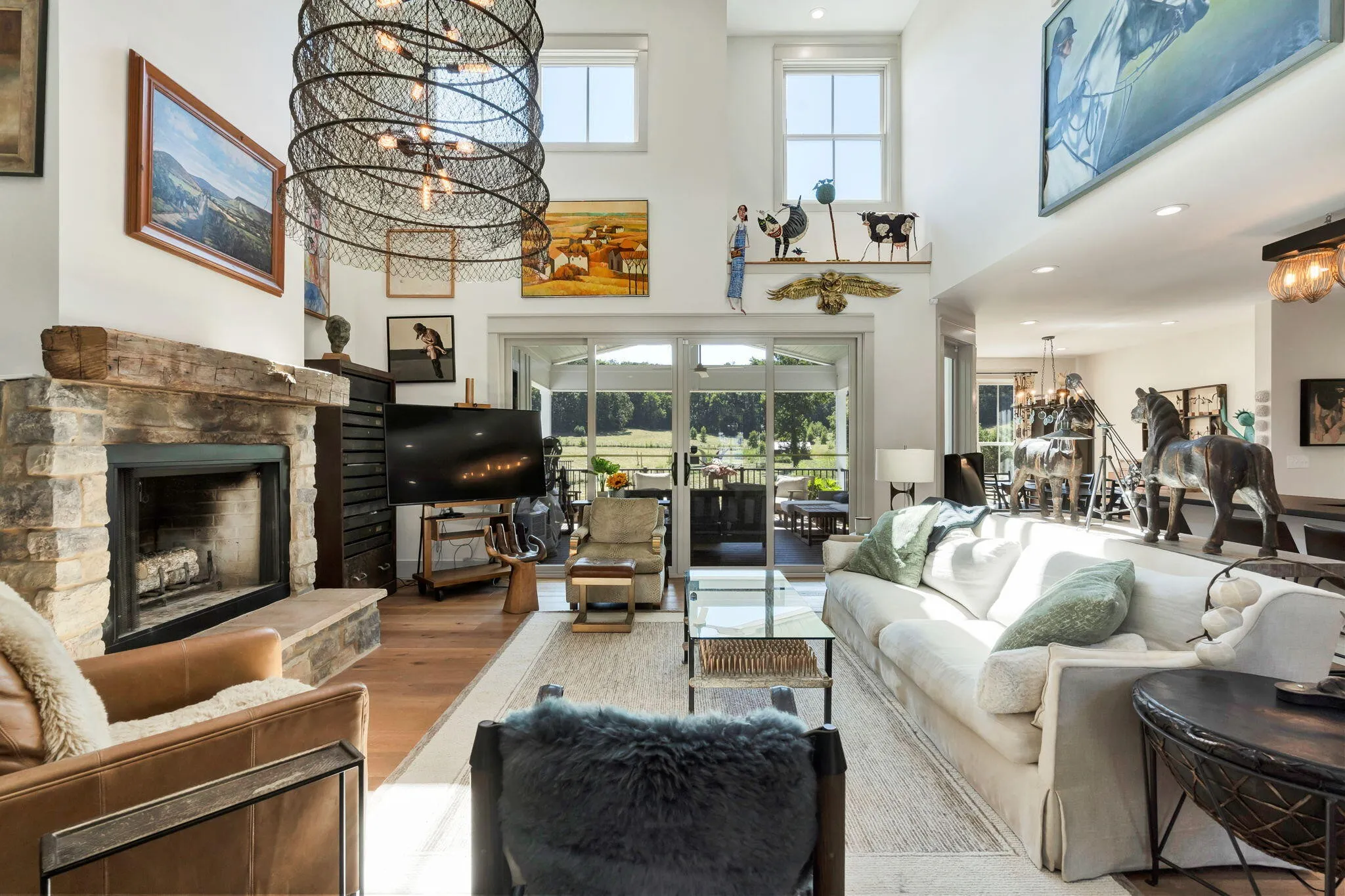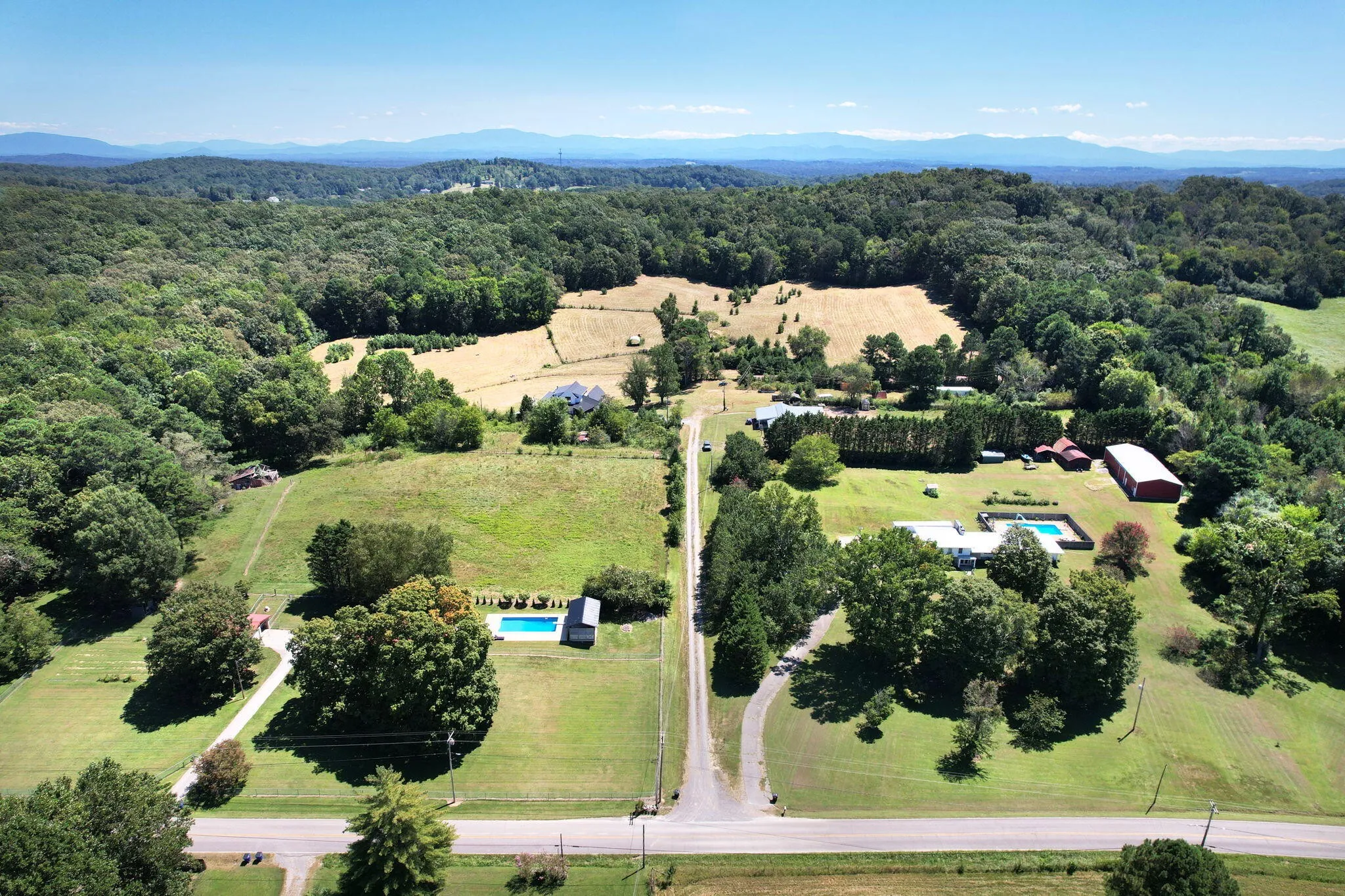 Discover a rare opportunity to own 28.62 acres of private countryside, where refined luxury and natural beauty blend seamlessly. At the heart of this estate lies a 2915 sf main residence, a showpiece of craftsmanship and elegance, complemented by a spacious secondary home and extensive outdoor amenities. The main residence is a masterpiece of design, offering three bedrooms, three and a half bathrooms, and four-zone climate control for year-round comfort. The grand great room is the home’s centerpiece, with soaring 20-foot ceilings, expansive windows, and a stone fireplace with raised hearth and gas starter. Sliding glass doors lead to a covered Trex deck overlooking the shimmering 10×20 saltwater pool and sweeping property views—an entertainer’s dream. A gourmet kitchen with top-tier appliances delights the chef, while vaulted ceilings elevate the dedicated craft room and office. Wide-plank Shaw hardwood flooring and detailed 8-inch baseboards carry a sense of understated luxury throughout. The primary suite is a serene retreat, featuring ten-foot ceilings, electric blackout curtains, and a spa-worthy bathroom with a soaking tub, oversized shower, and heated bidet toilet room. A custom-designed walk-in closet provides exceptional storage and organization. Upstairs, a charming and unique loft offers three built-in queen beds, custom shelving, and a private full bathroom—perfect for guests or family. Exterior details pair white Hardie board siding with shou sugi ban accents, approached by natural stone steps that create a striking first impression. Built to endure, this residence was engineered to withstand category three tornado conditions. Additional features include a 685 sq. ft. insulated garage with mini-split heating and cooling, plus an expansive unfinished basement offering abundant storage or future potential. The second residence provides 2,225 sf of single-level living with three bedrooms, two bathrooms, a spacious family room, and a durable metal roof.