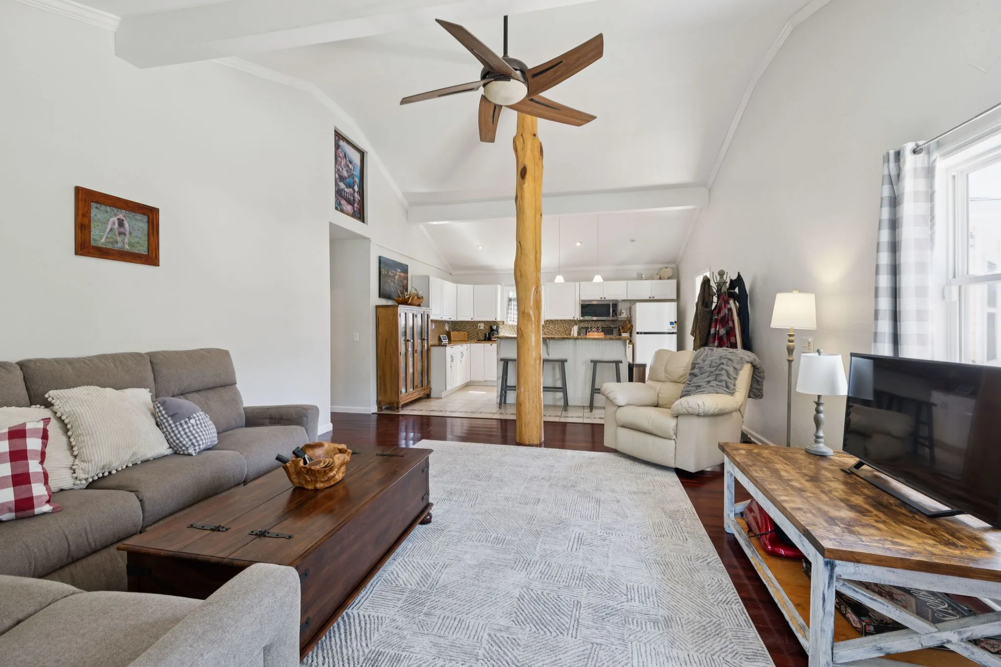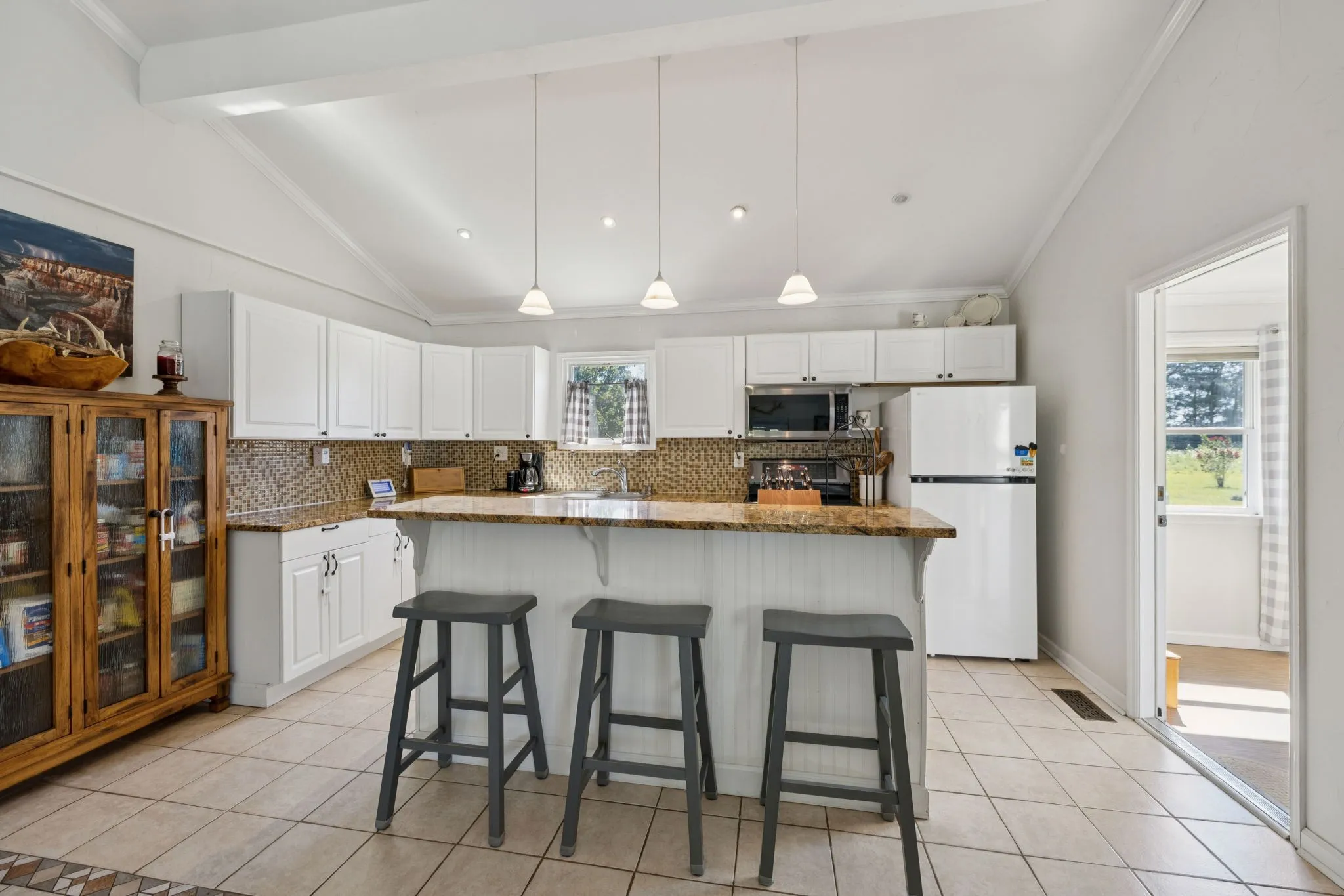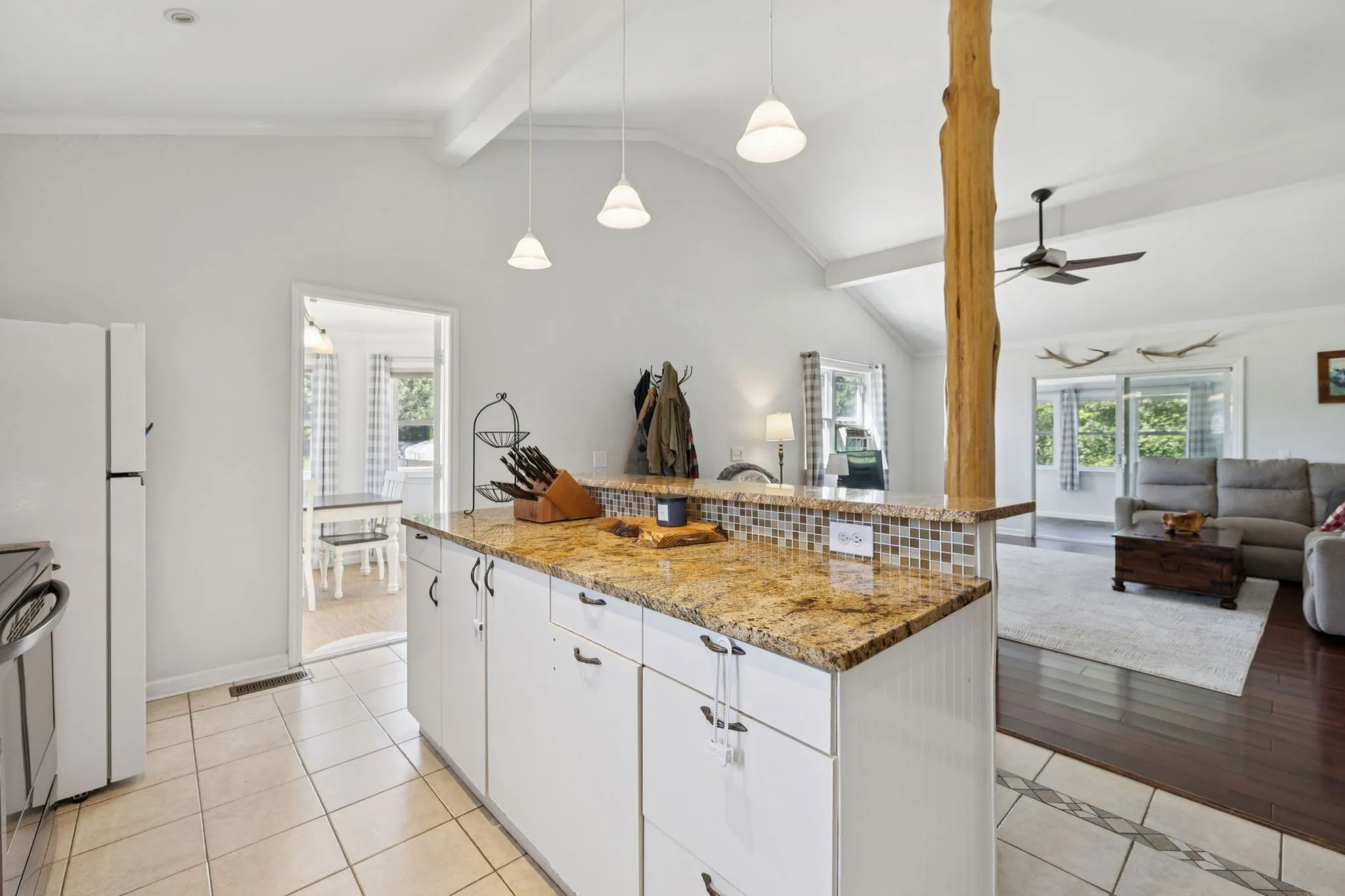 The charming home features 3 bedrooms and 2 bathrooms, designed with comfort and functionality in mind. Step inside to find a spacious living room with vaulted ceilings, filled with natural light and open to the kitchen. The kitchen is a true centerpiece, boasting a large island, and ample counter space—perfect for family meals or entertaining friends. A cozy sunroom invites you to take in the surrounding views year-round, while the expansive front deck is ideal for sitting back with a cup of coffee and soaking in the sounds of nature.\n