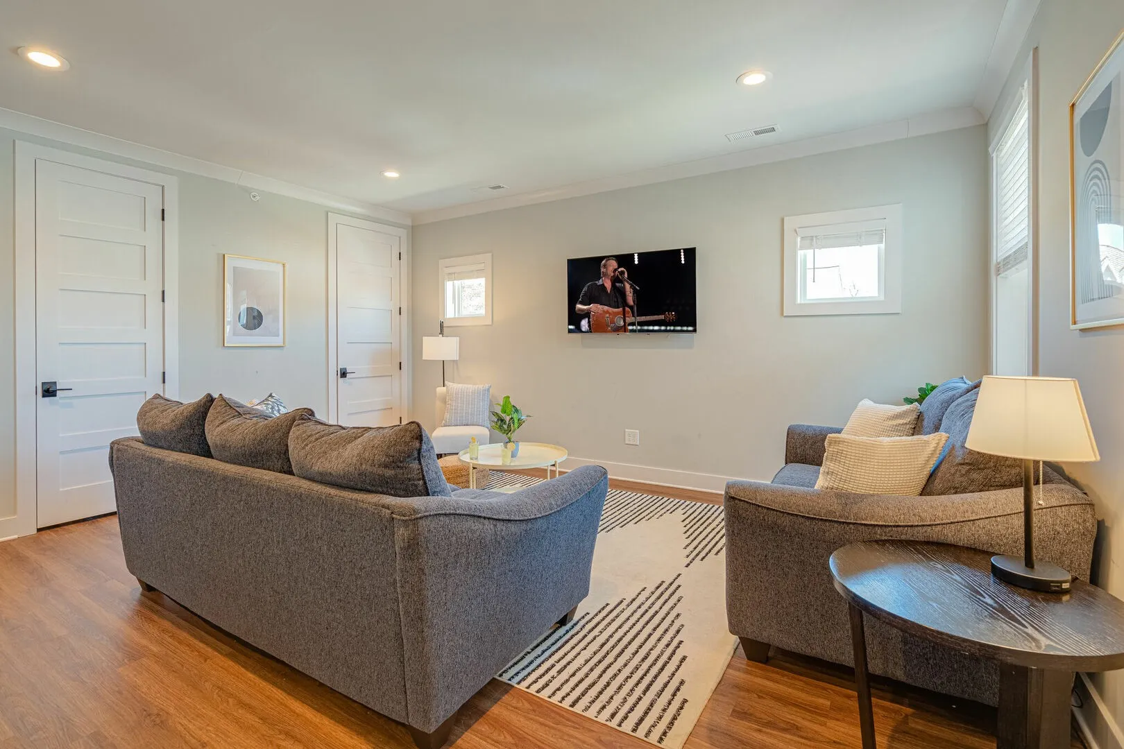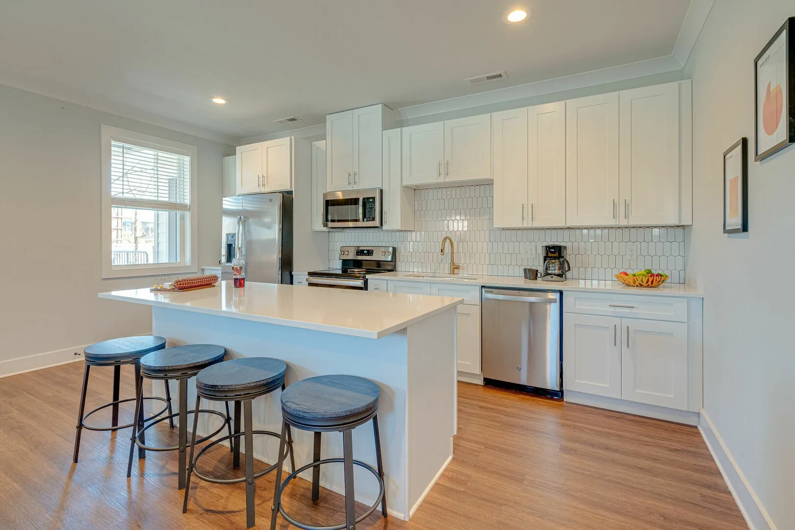The open-concept living area features a bright and welcoming atmosphere with smart TV, designer furnishings, and seamless flow into the modern kitchen. Outfitted with stainless steel appliances, ample counter space, and bar seating, the kitchen makes everyday cooking and entertaining easy.