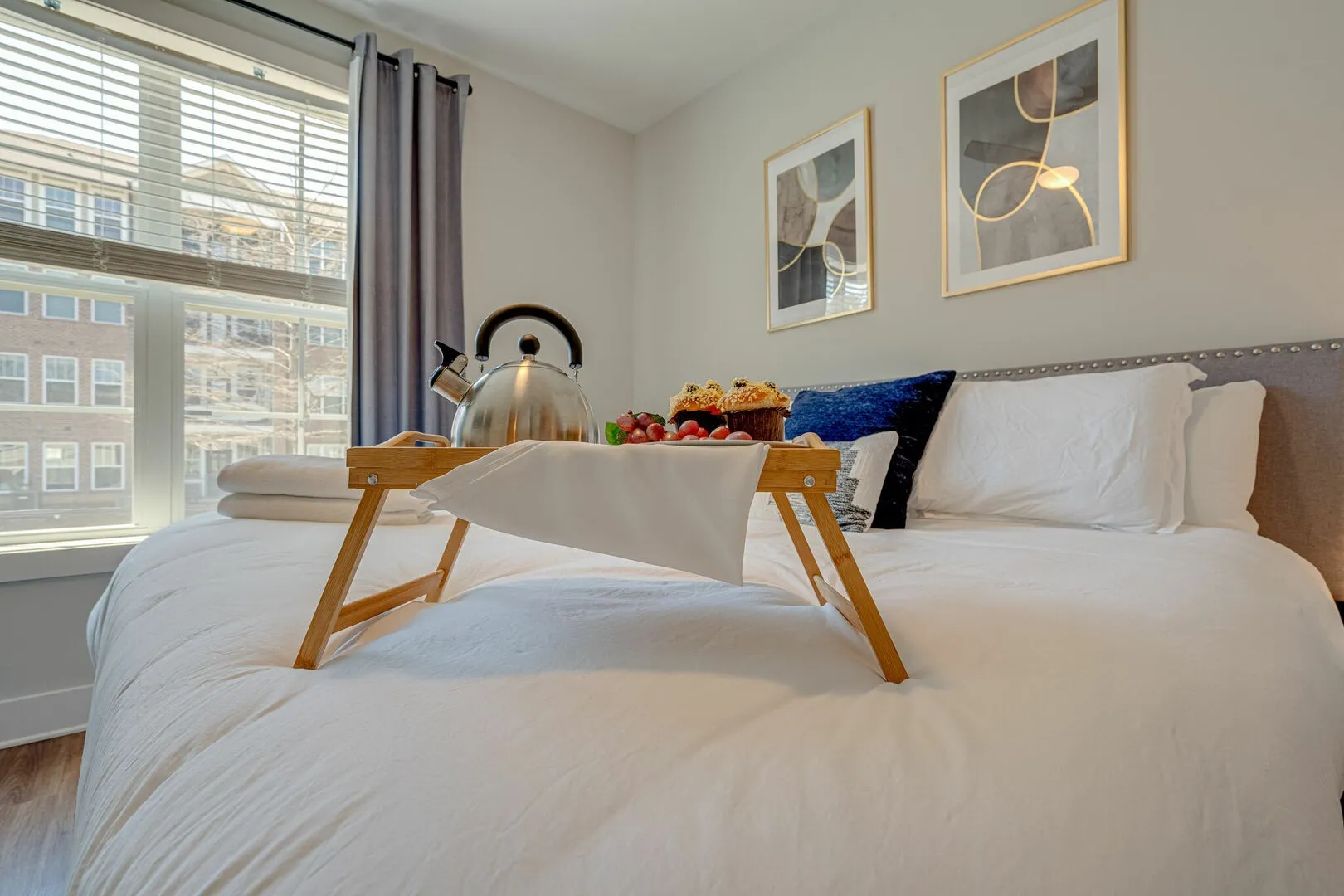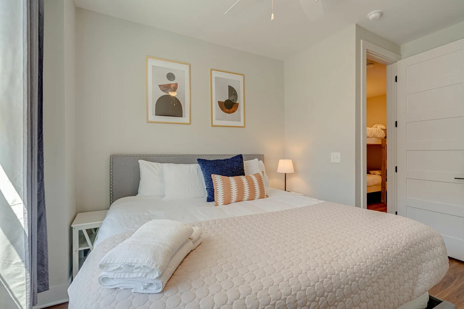 Both bedrooms are generously sized and feature king beds, closets, and smart TVs. The primary suite includes a private en-suite bath with dual vanity and walk-in shower, while the second bedroom enjoys convenient access to a well-appointed full bath.