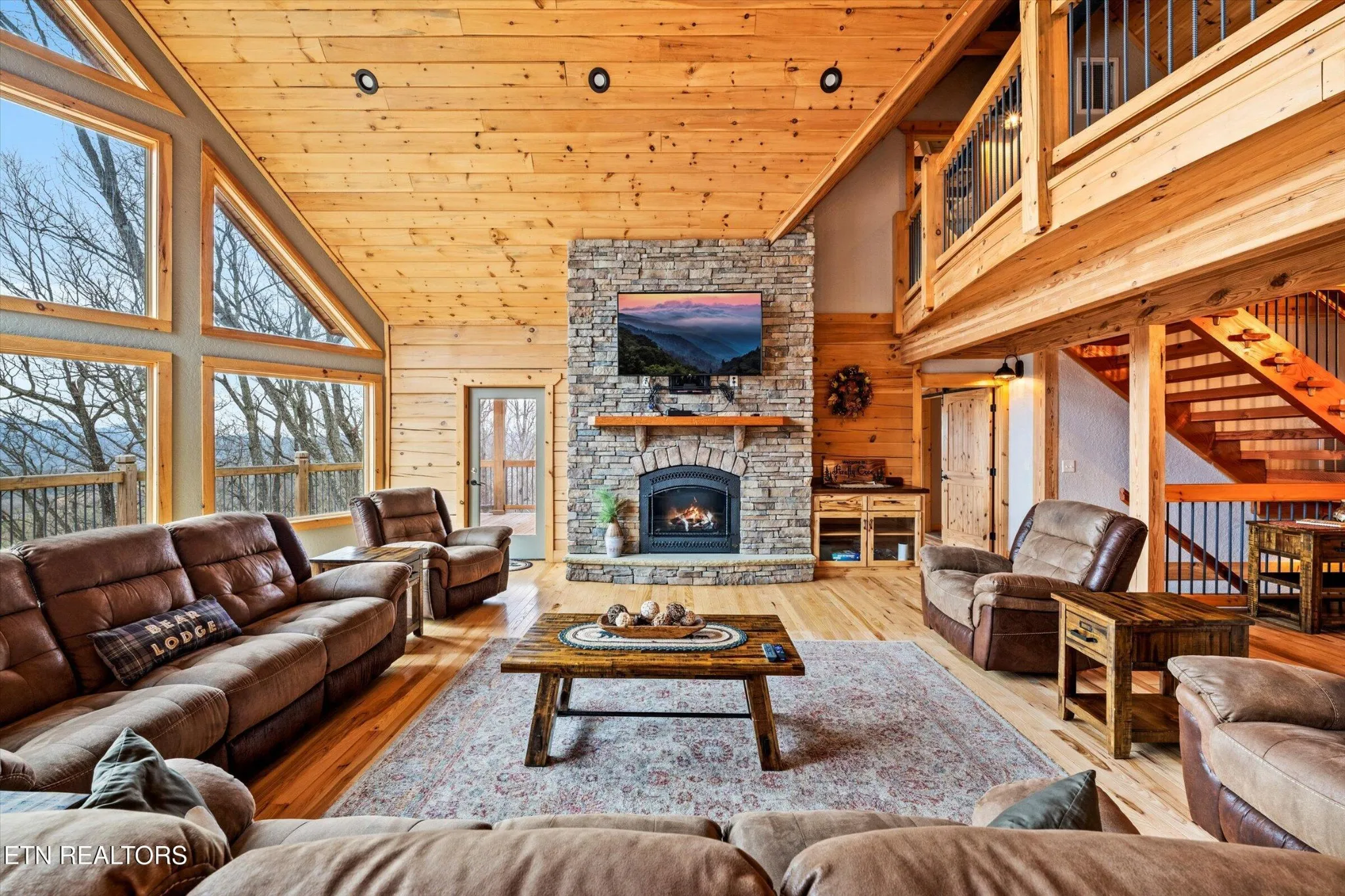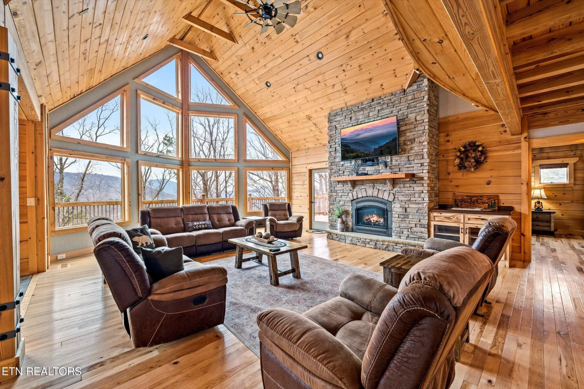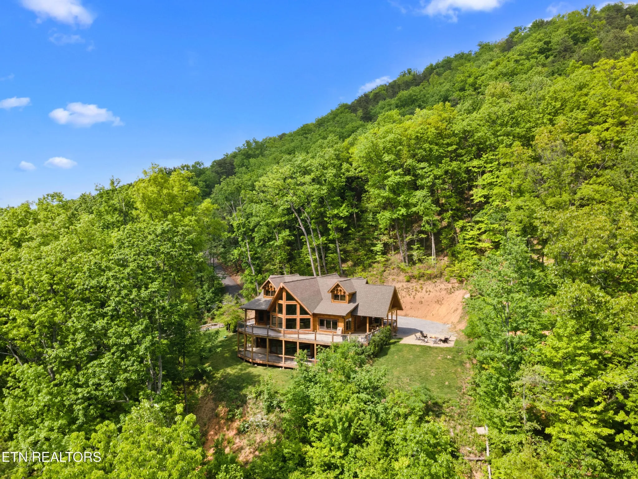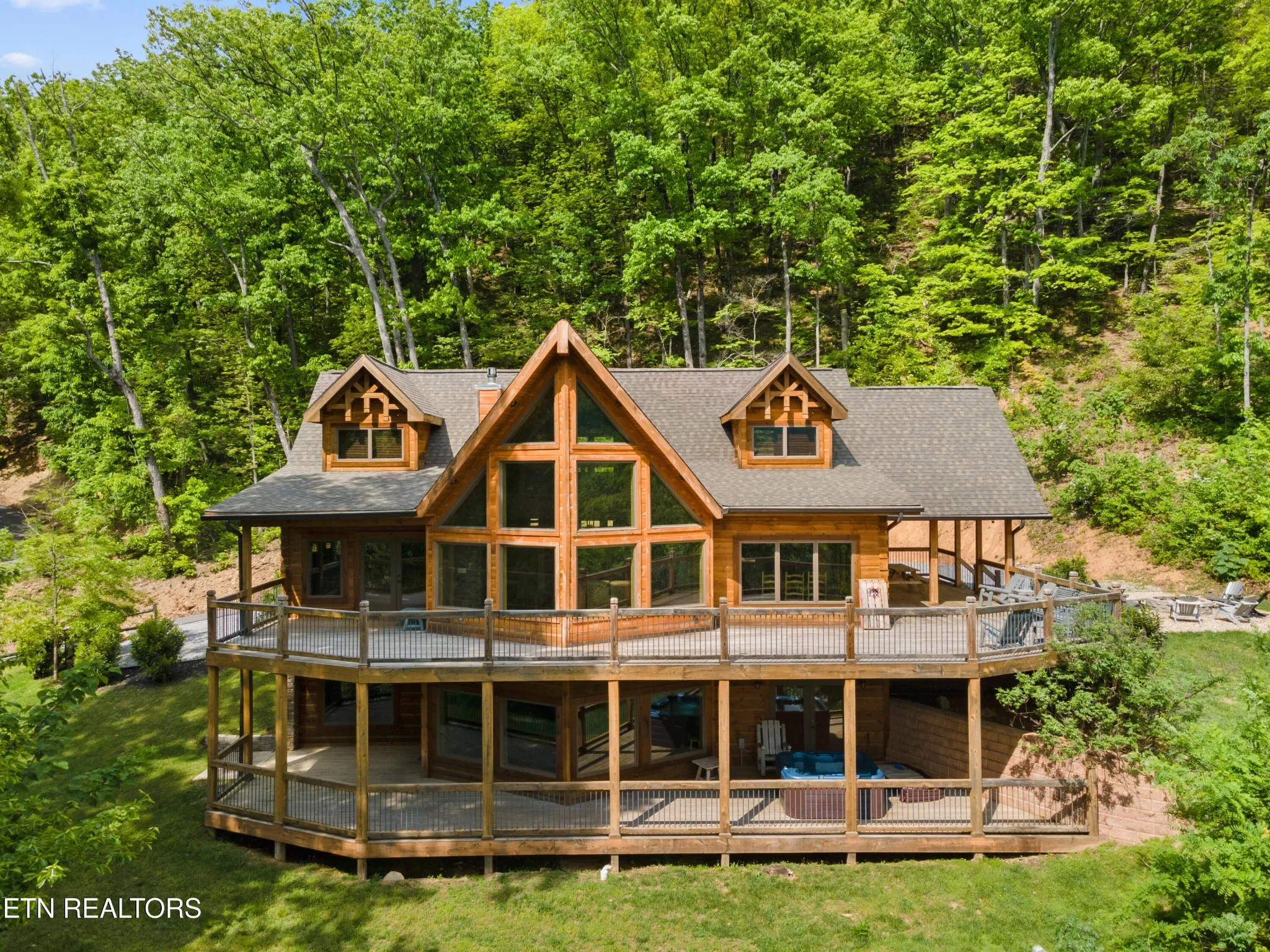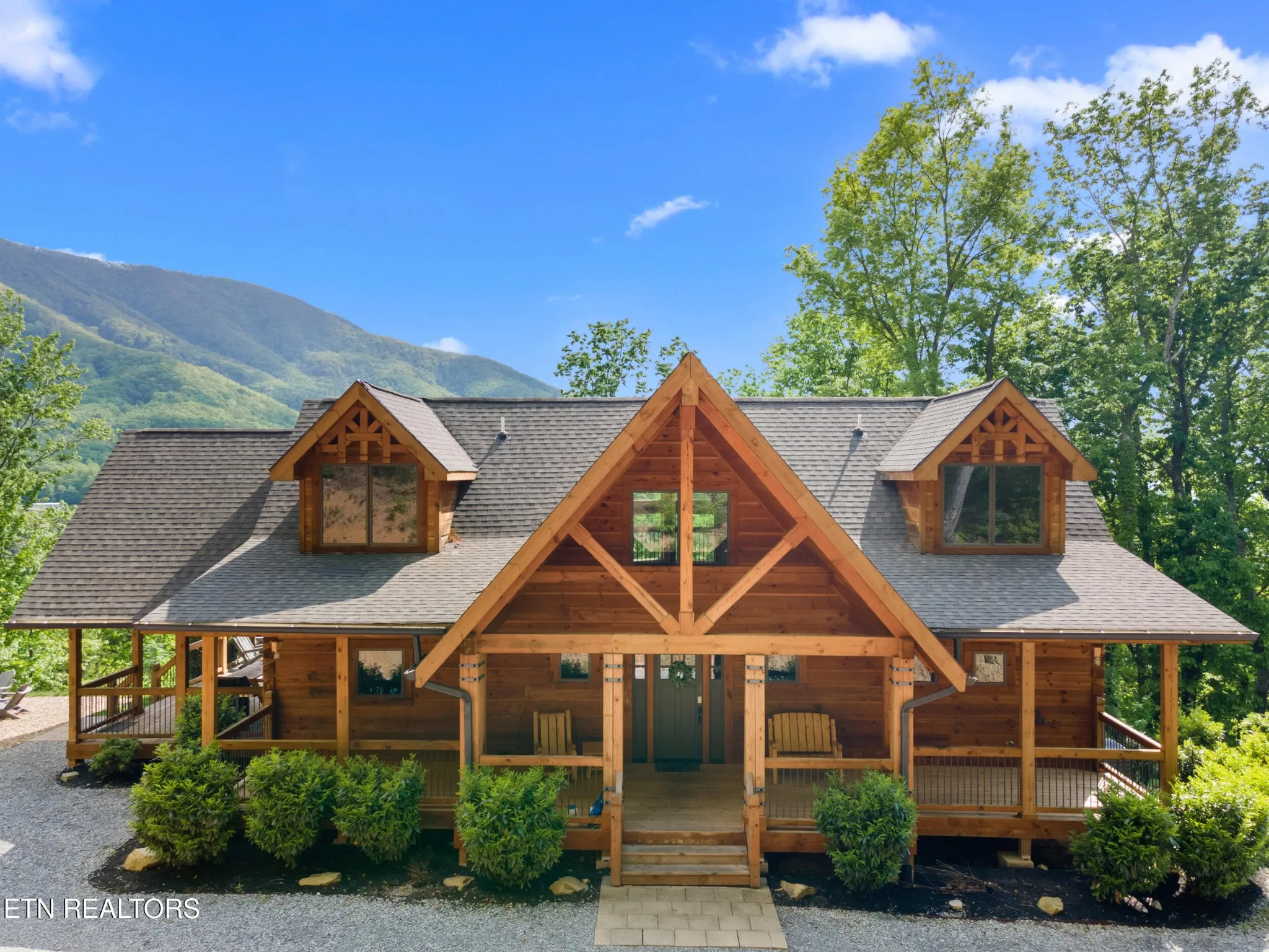 This stunning 5-bedroom, 3.5-bathroom Southland Log Timber Frame Home offers approximately 4300 square feet of luxurious living space on a private 2.89-acre lot with breathtaking, elevated mountain views. Located int eh heart of Wears Vallely, this home is just 15 minutes from Pigeon Forge, 30 minutes to Gatlinburg, and a short drive to the Wears Valley entrance of the Great Smoky Mountains National Park. Designed for both relaxation and entertainment, the home features soaring cathedral ceilings, abundant windows that fill the space with natural light, and a grand stone gas fireplace in the great room. The gourmet kitchen includes custom cabinetry, an oversized island, and premium appliances, making it ideal for hosting. a dedicated game and home theater room provide additional entertainment opportunities. The expansive wrap-around deck on the main level is perfect for outdoor living and offers space for a future outdoor kitchen. The walkout lower level features a hot tub and a scenic outdoor fire pit.