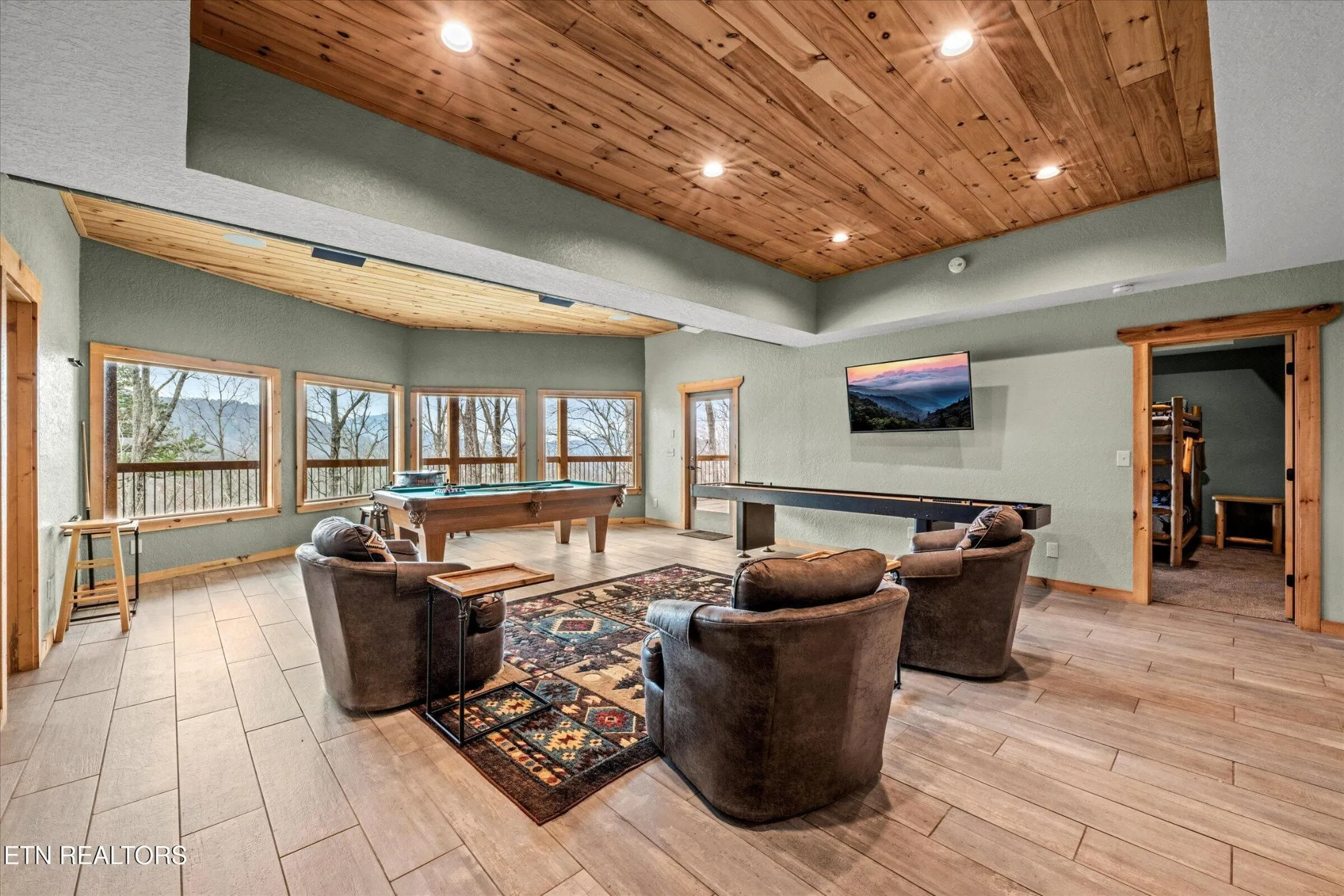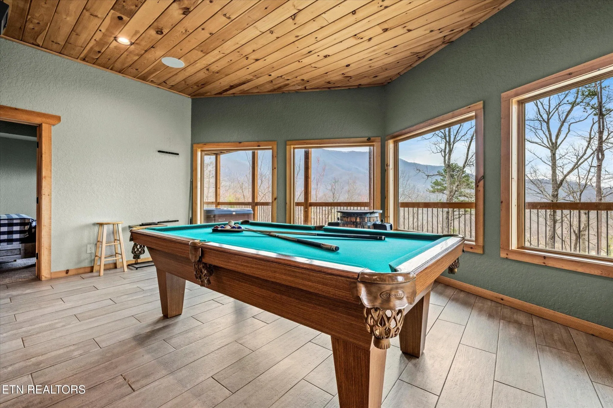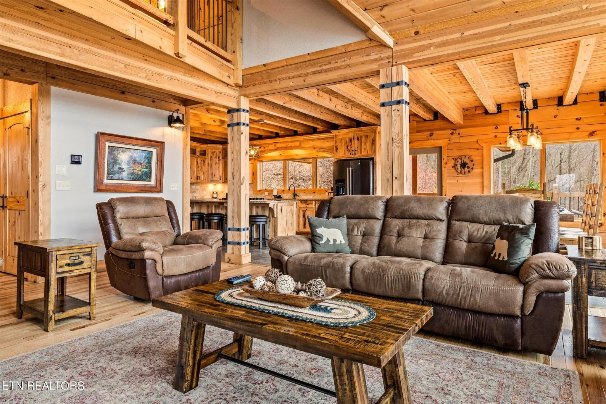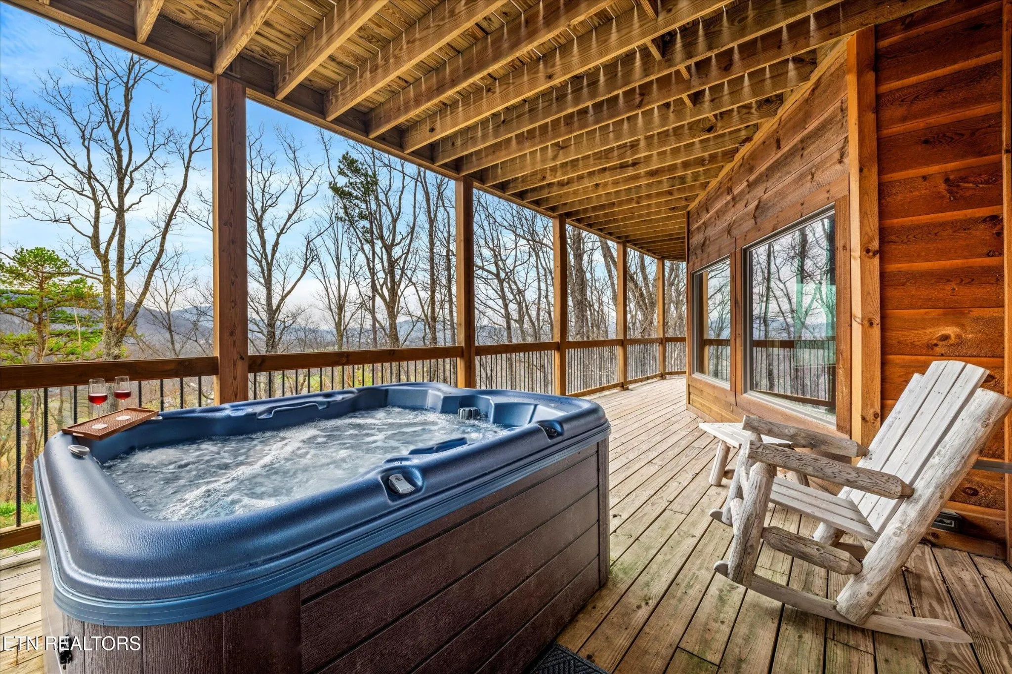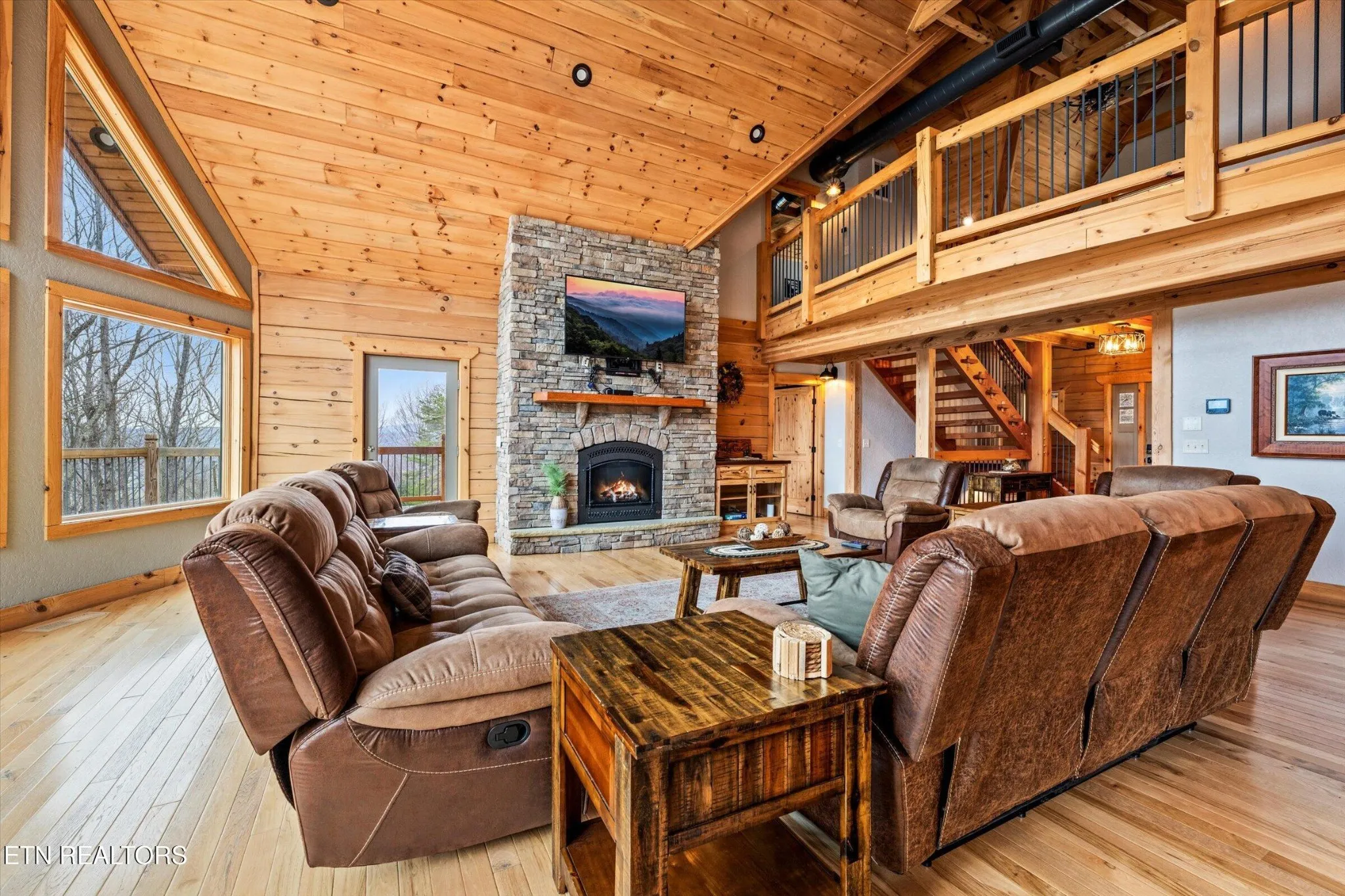 This stunning 5-bedroom, 3.5-bathroom Southland Log Timber Frame Home offers approximately 4300 square feet of luxurious living space on a private 2.89-acre lot with breathtaking, elevated mountain views. Located int eh heart of Wears Vallely, this home is just 15 minutes from Pigeon Forge, 30 minutes to Gatlinburg, and a short drive to the Wears Valley entrance of the Great Smoky Mountains National Park. Designed for both relaxation and entertainment, the home features soaring cathedral ceilings, abundant windows that fill the space with natural light, and a grand stone gas fireplace in the great room. The gourmet kitchen includes custom cabinetry, an oversized island, and premium appliances, making it ideal for hosting. a dedicated game and home theater room provide additional entertainment opportunities. The expansive wrap-around deck on the main level is perfect for outdoor living and offers space for a future outdoor kitchen. The walkout lower level features a hot tub and a scenic outdoor fire pit.
