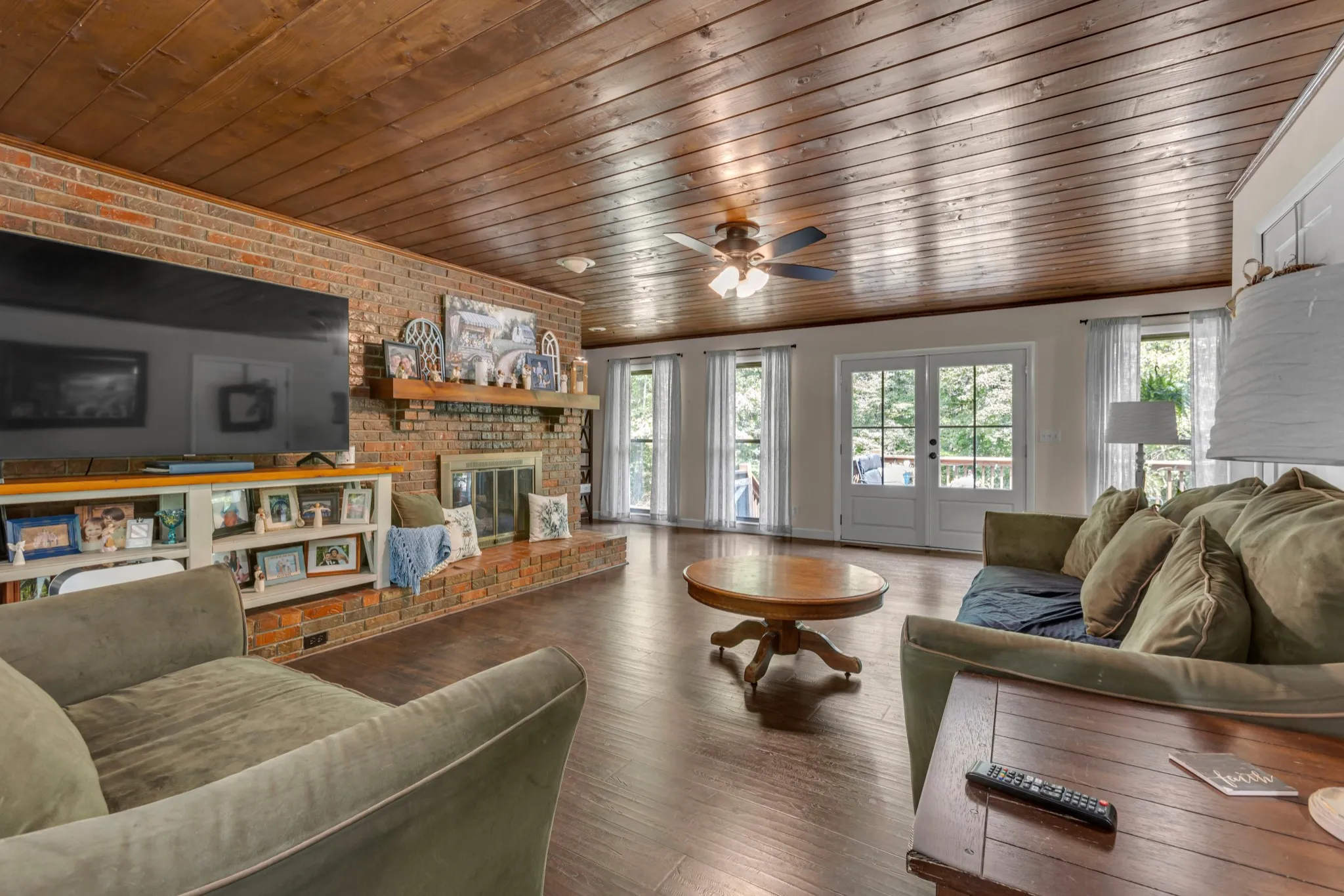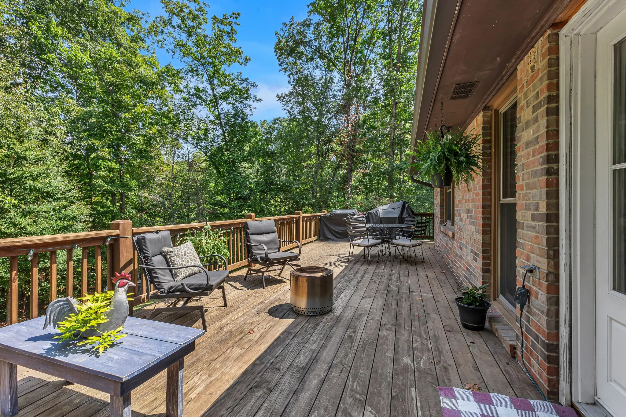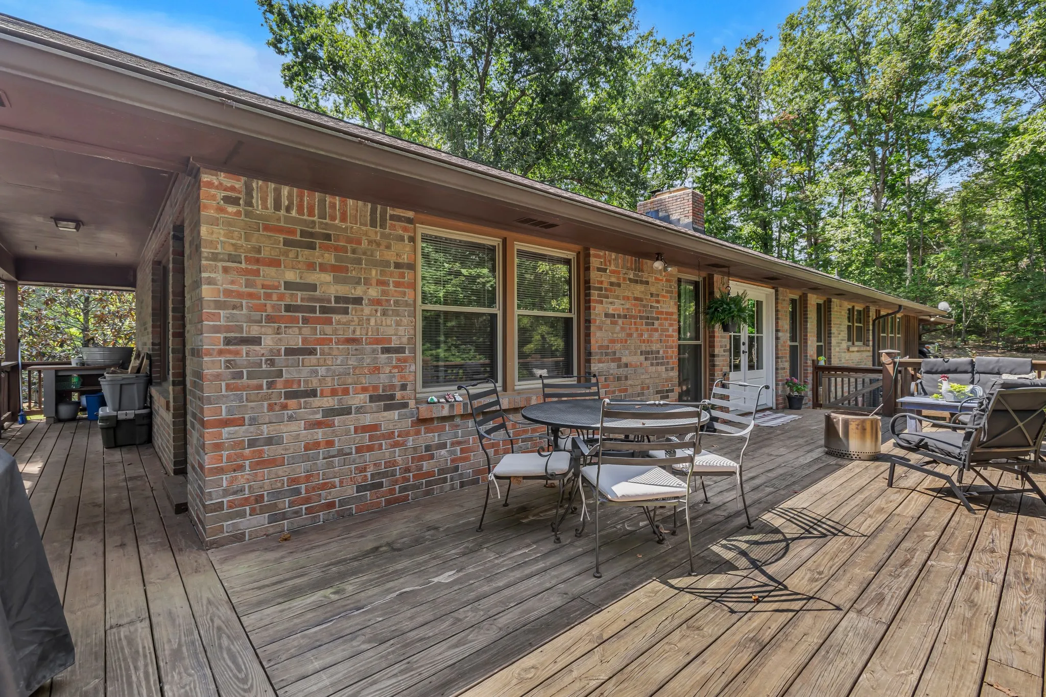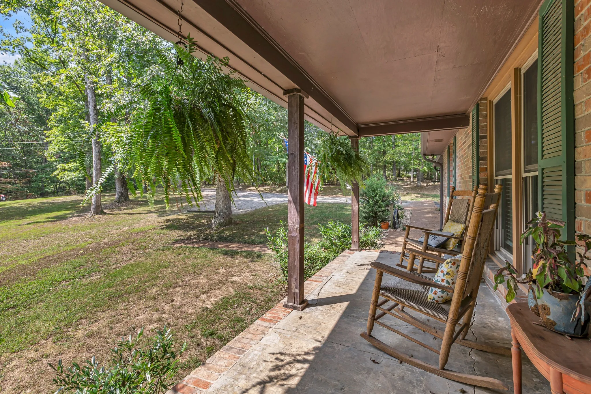 Beautifully maintained brick home with full basement, nestled on 3 acres of lush trees. Conveniently located just minutes from schools. Recent updates include windows and a roof that are approximately 3 years old. Gorgeous renovated kitchen with granite countertops. Refrigerator, oven, gas stove and dishwasher remain. Gas fireplace and beautiful wood ceiling in living room. Master bedroom features an exterior door to covered deck & his and her closets (her closet is a large walk-in closet). Laundry room on main level with cabinets, closet and storage shelves. 11×11 room by carport entrance is great for a sun room or mud room. Bedroom in basement has a fireplace and full bath with laundry connections. Heated and cooled garage and workshop area in basement. Conveniently designed with two driveways—one leading to the main level and one to the basement. Large attached carport/covered patio on main level. Covered front porch. Gutter guards. Chicken coop. High speed internet. City trash pickup.