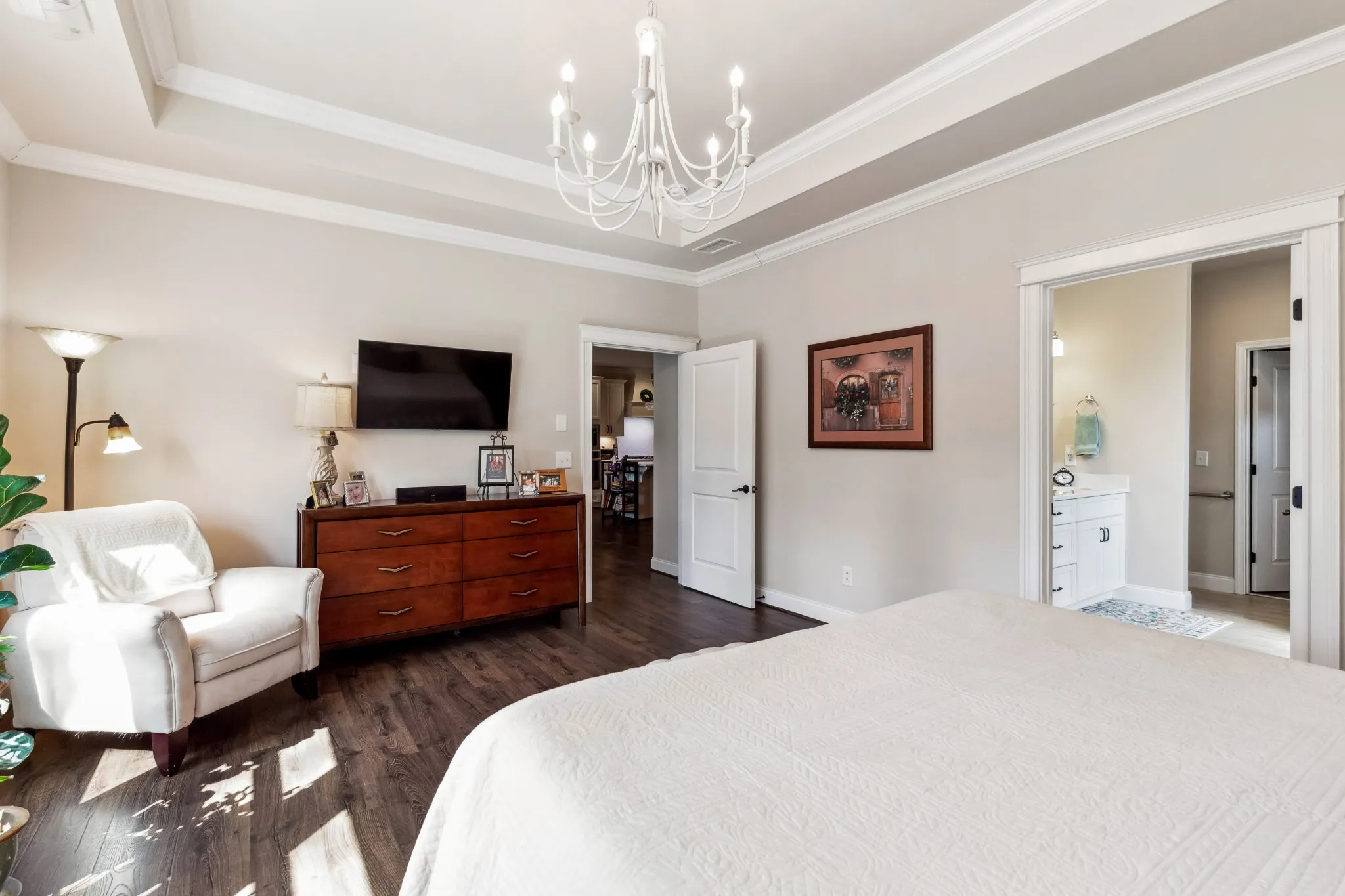 Frank Batson Built home in The Reserve at Seven Points Community. The home includes pre-finished hardwood throughout main living area, upgraded cabinets in kitchen with double ovens and gas cook-top, Quartz kitchen counter-tops, tile in all baths and utility room, a 10′ x 21′ sunroom and a 10′ x 21′ covered porch. The primary bathroom offers a double basin vanity, a separate make-up vanity, and large shower.