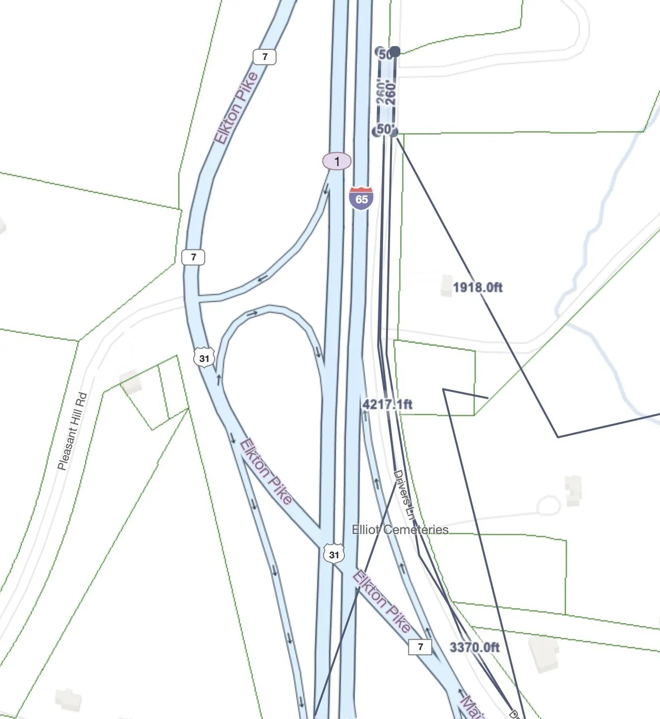 - Directions: From I65 South bound exit #1. Head east over the interstate. Make a left on Drivers Lane. Property will be on your left in ~.5 miles. In between I65 and Drivers Lane.