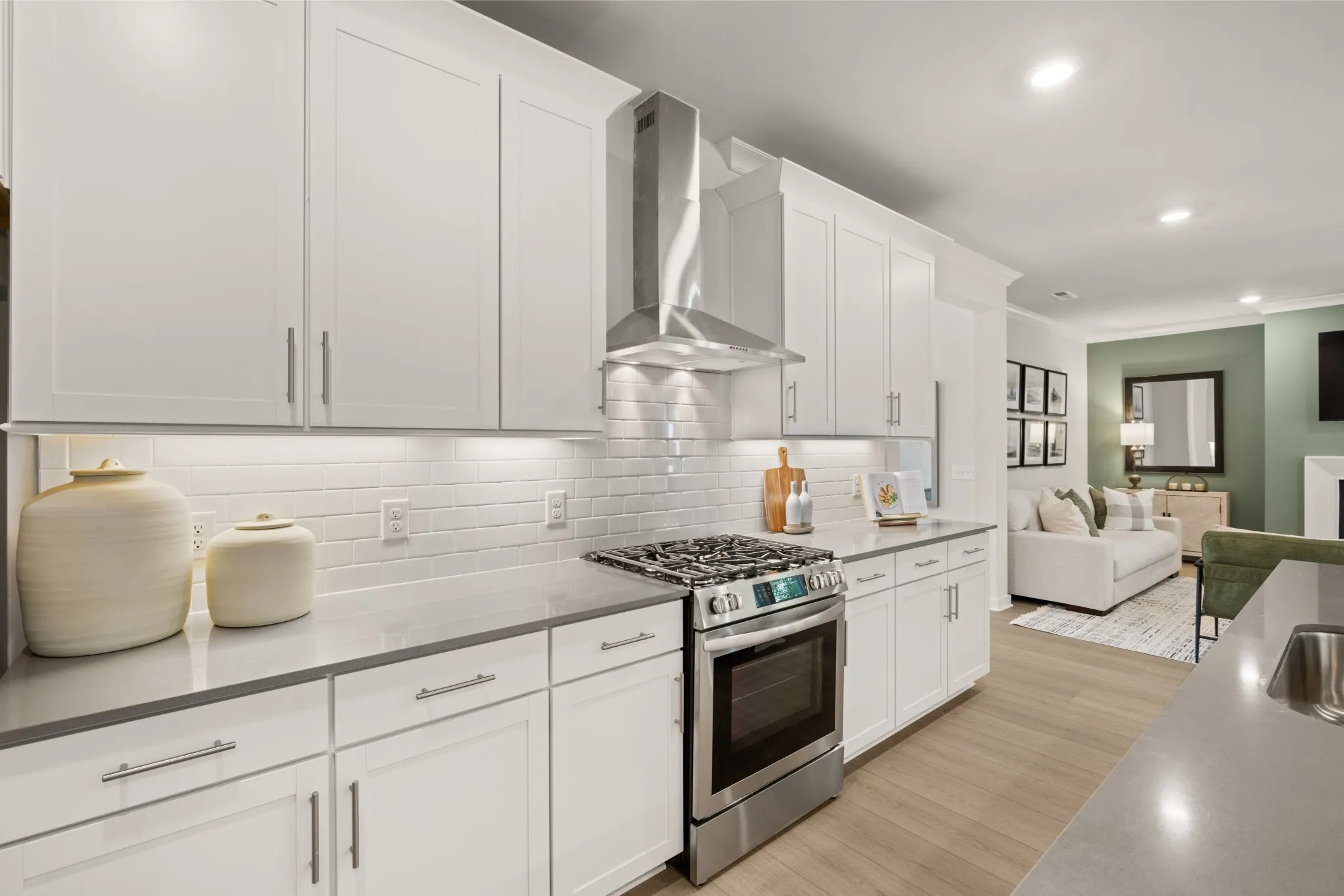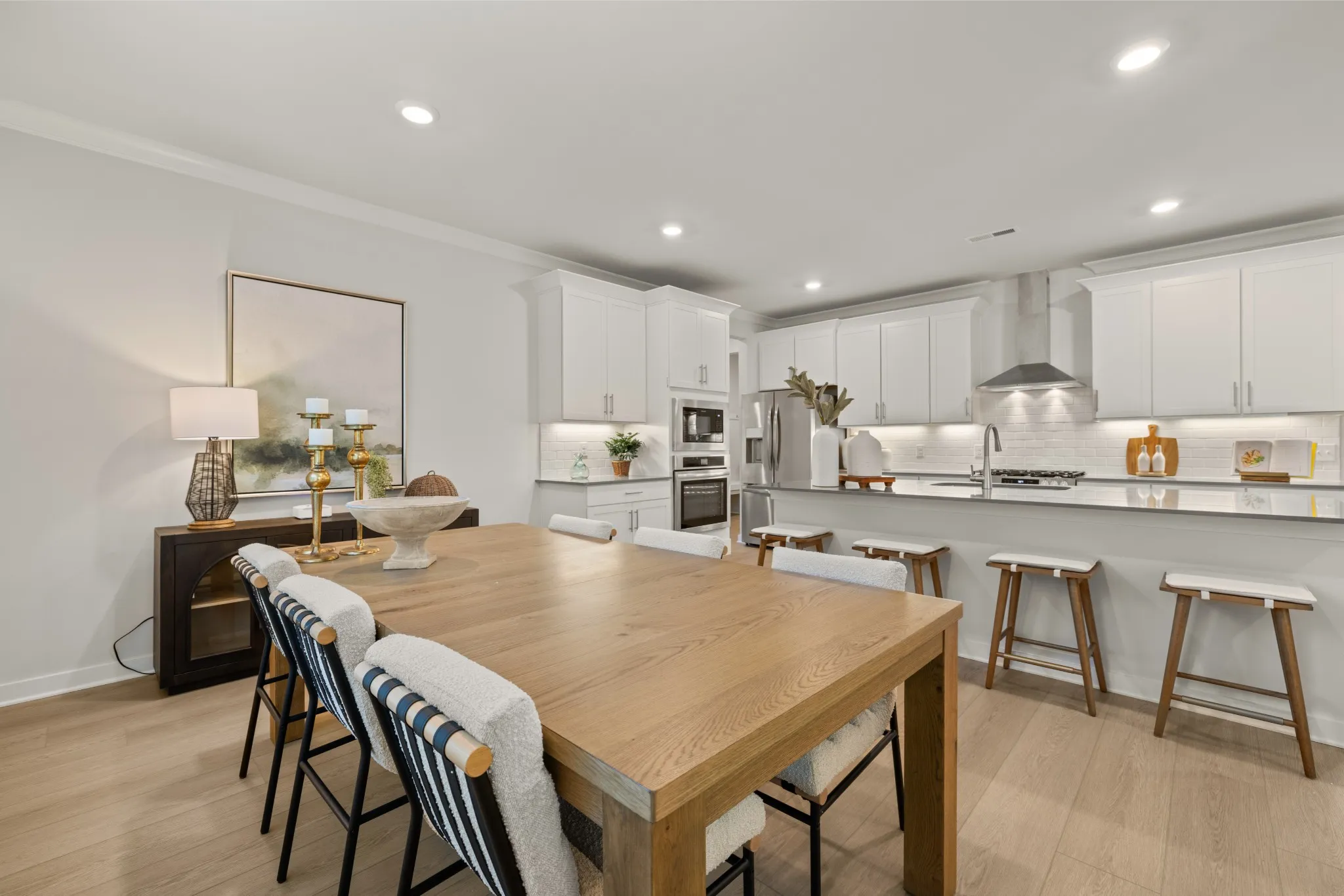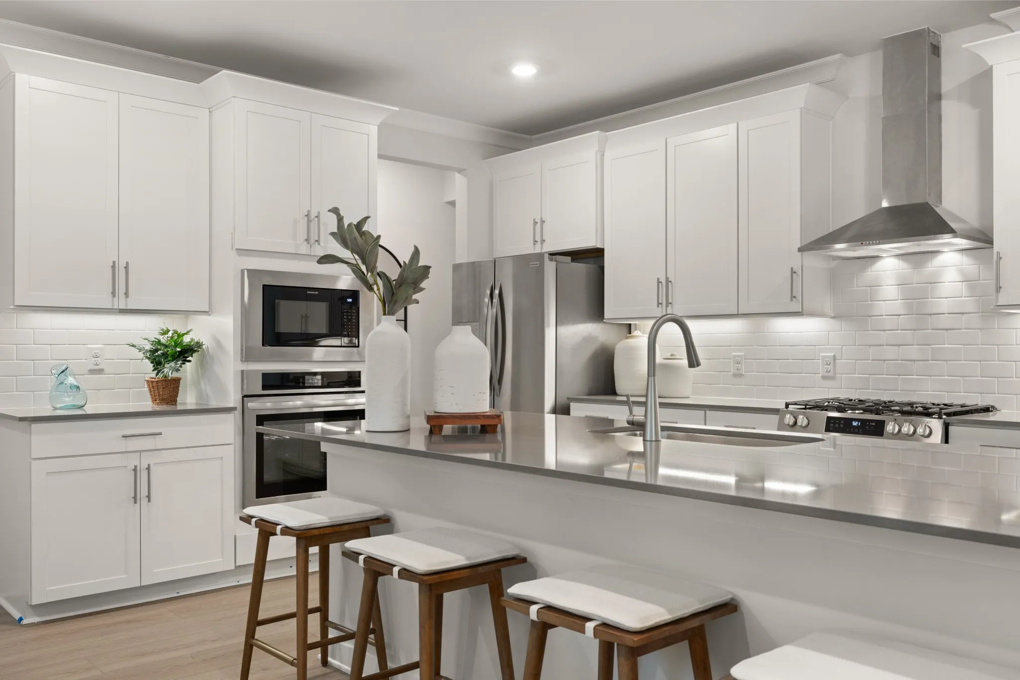LOT #61 – Winston floorplan. This expansive single-family home presents two floors designed for gracious living and entertainment. At the heart of the first floor is a welcoming family room with a center fireplace, which connects to the chef-ready kitchen, casual dining nook and a large covered patio. A private study and an upstairs loft provide additional living space. There is a total of five bedrooms, all of which boast direct access to a full-sized bathroom. Rounding out the home is a three-car side load garage. *Images from a furnished model of this home. Actual configuration and features may vary.