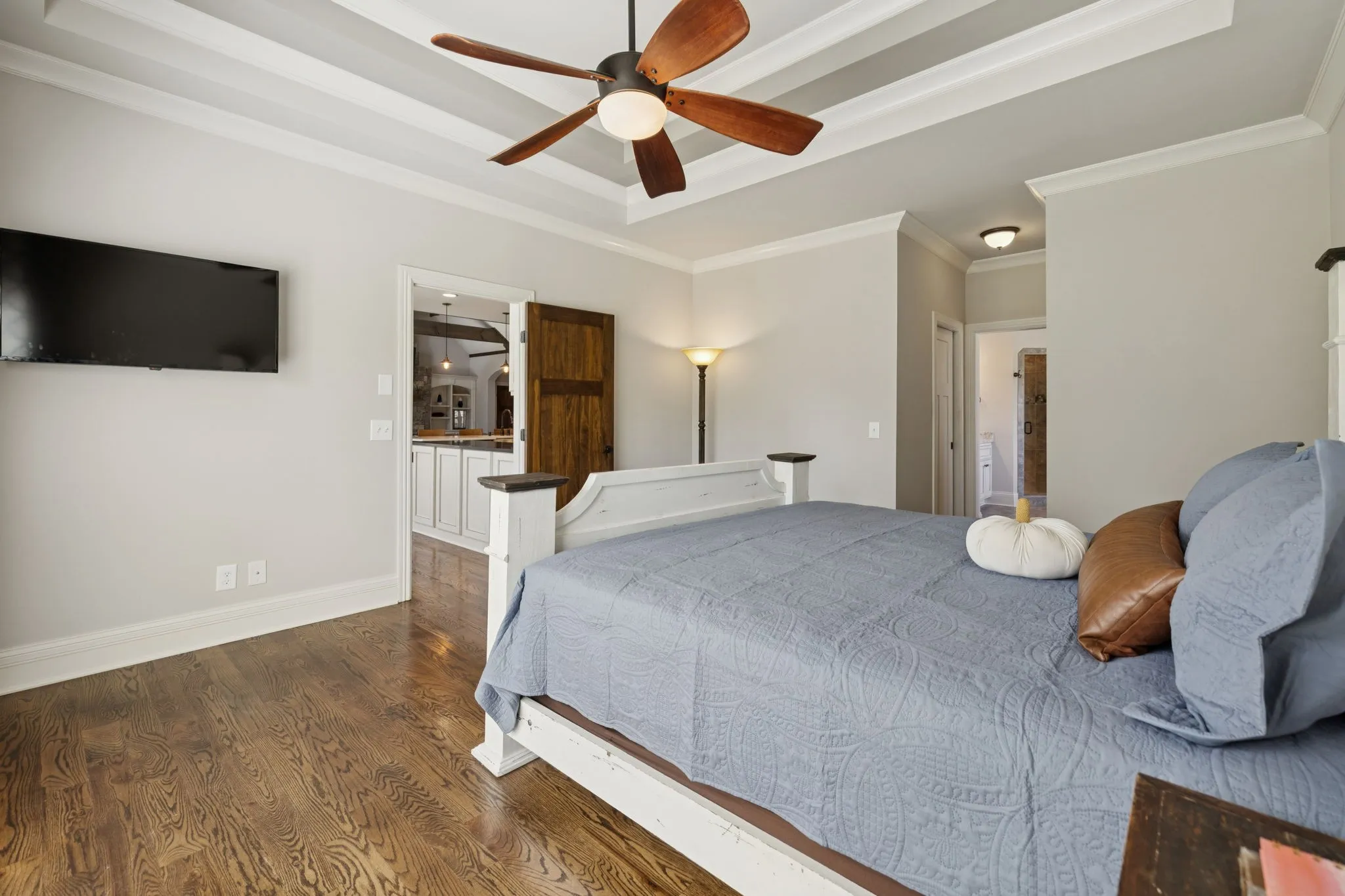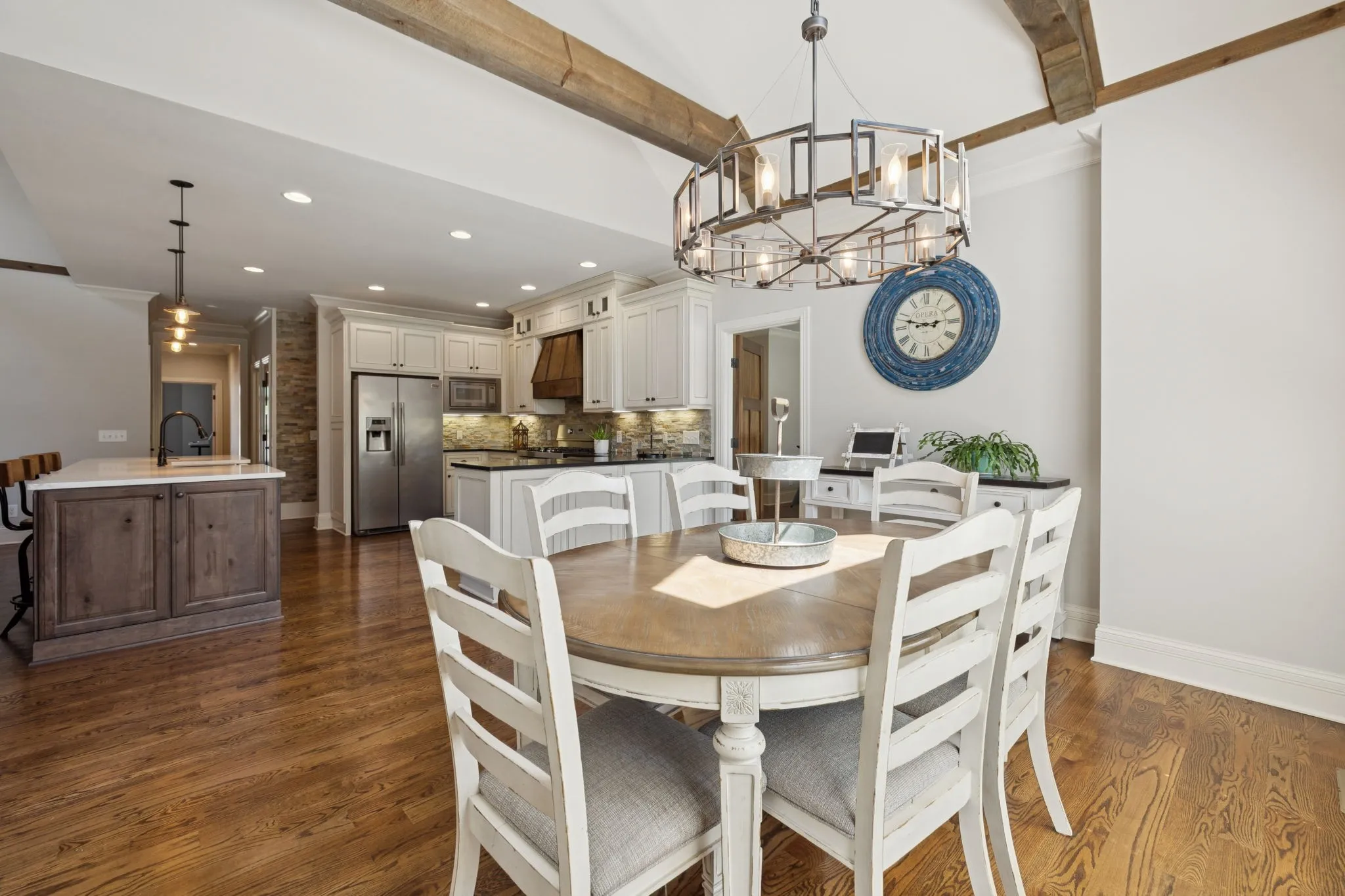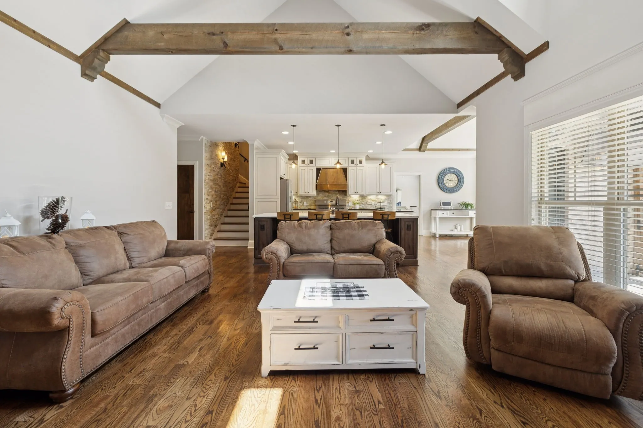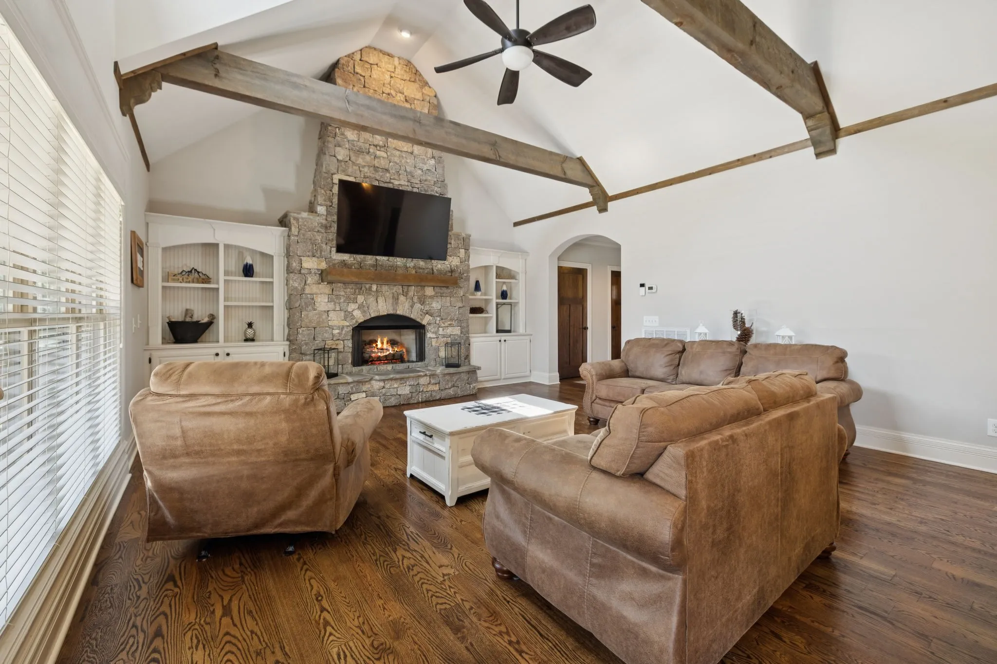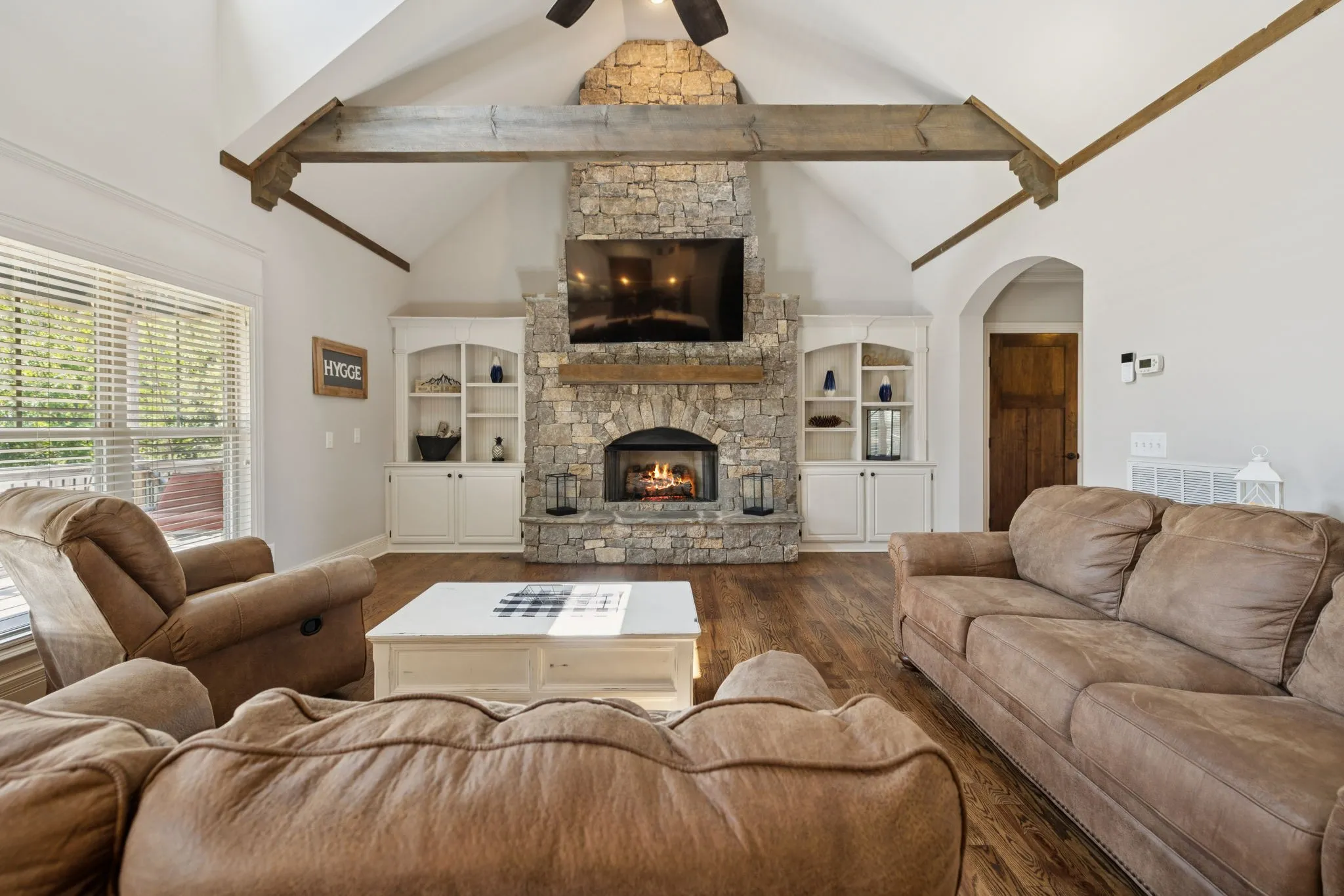 The heart of the home is the chef’s kitchen, anchored by a custom island with quartz countertops and a farmhouse sink. Additional granite counter space and a gas range make it a dream for cooking and entertaining. The living room invites you in with soaring vaulted ceilings, exposed solid wood beams, and a striking custom stone fireplace flanked by built-in shelving and cabinetry—perfect for cozy evenings or gatherings with friends. The primary suite is a true retreat, complete with his-and-hers closets and a spa-inspired ensuite featuring a dual vanity, soaker tub, and separate shower.