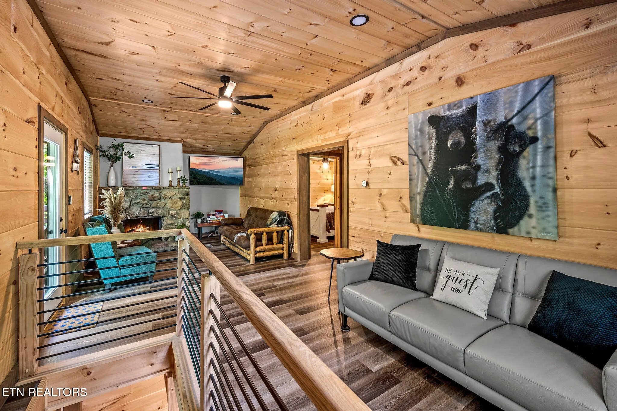 Inside, you’ll find a warm and inviting living space with a striking wood-burning stone fireplace, vaulted ceilings, and a balcony off the upper-level living room that overlooks the serene setting. The full kitchen, dining area, and dedicated remote workspace make it practical for both vacation and extended stays.