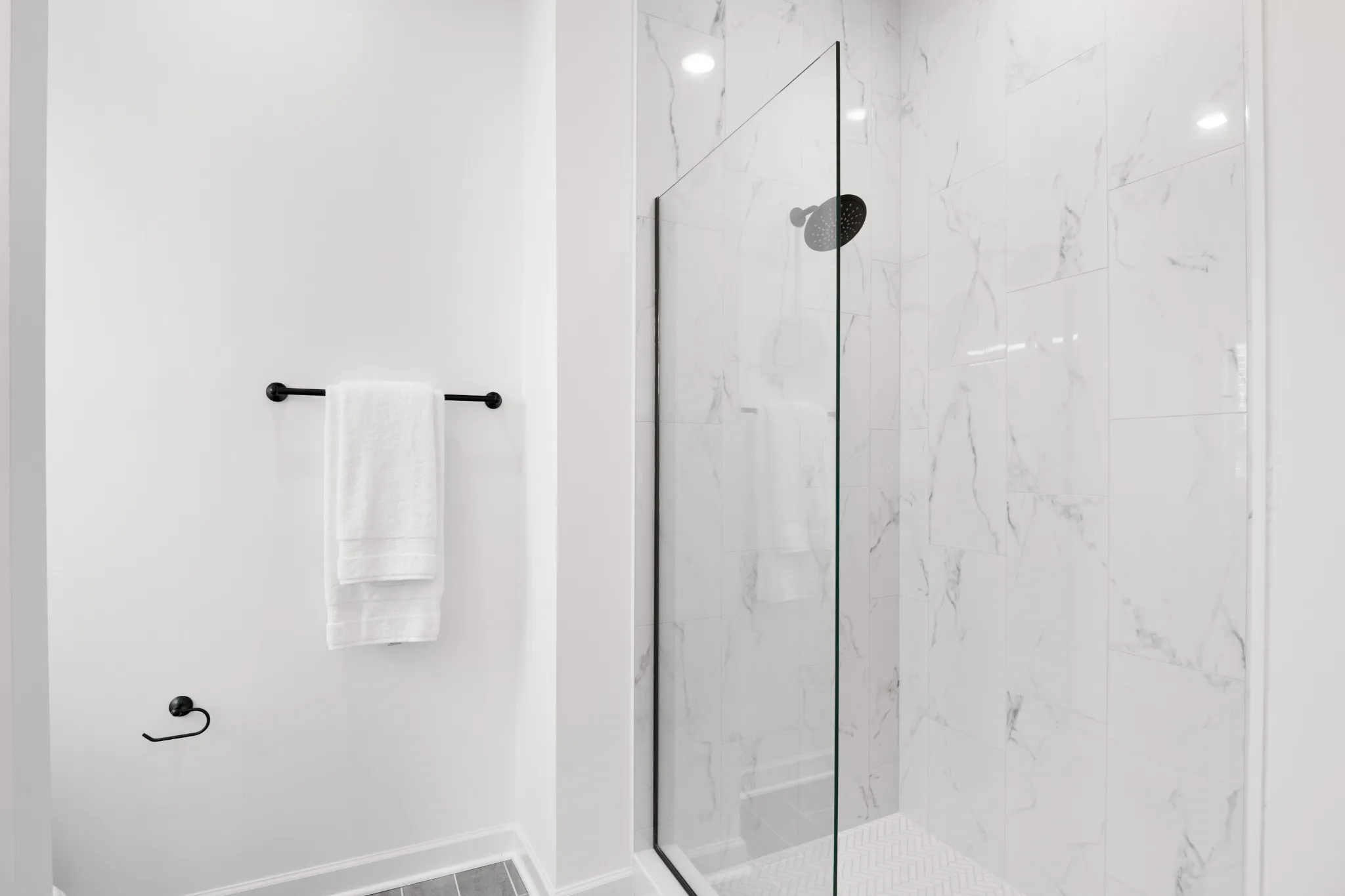 Retreat to the spa-like primary suite with a large glass-enclosed shower, floor-to-ceiling designer tile, mosaic tile floors, and a double vanity with quartz counters and under-mount sinks. The spacious secondary bedroom offers its own en suite bath for ultimate privacy and comfort.