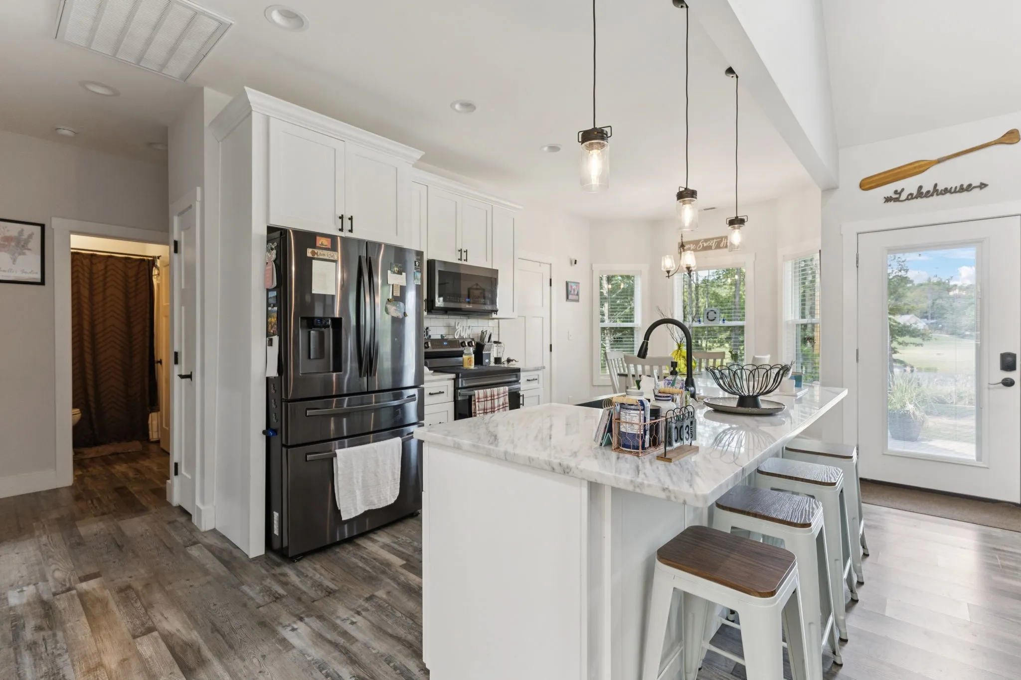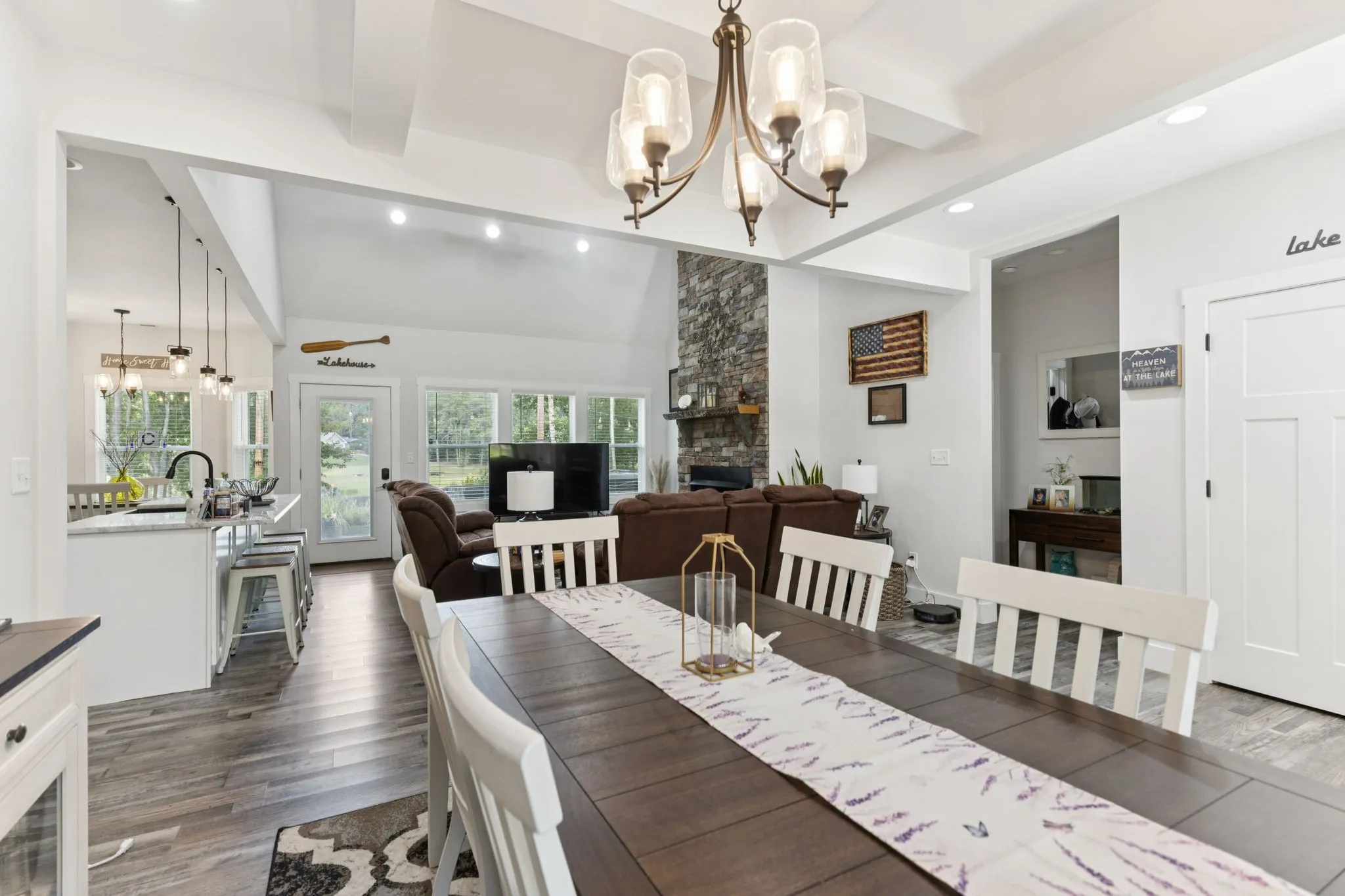 Inside, enjoy durable vinyl plank flooring, granite countertops, and a cozy gas fireplace. The open floor plan flows easily, and the bonus room offers flexible use—home office, gym, or media space. Step outside to your own slice of lakefront paradise for fishing, coffee on the porch, or quiet evenings under the stars.