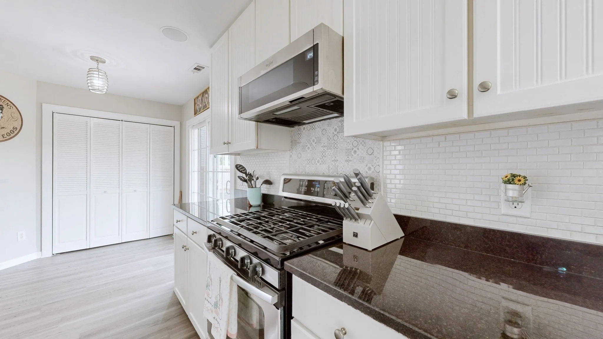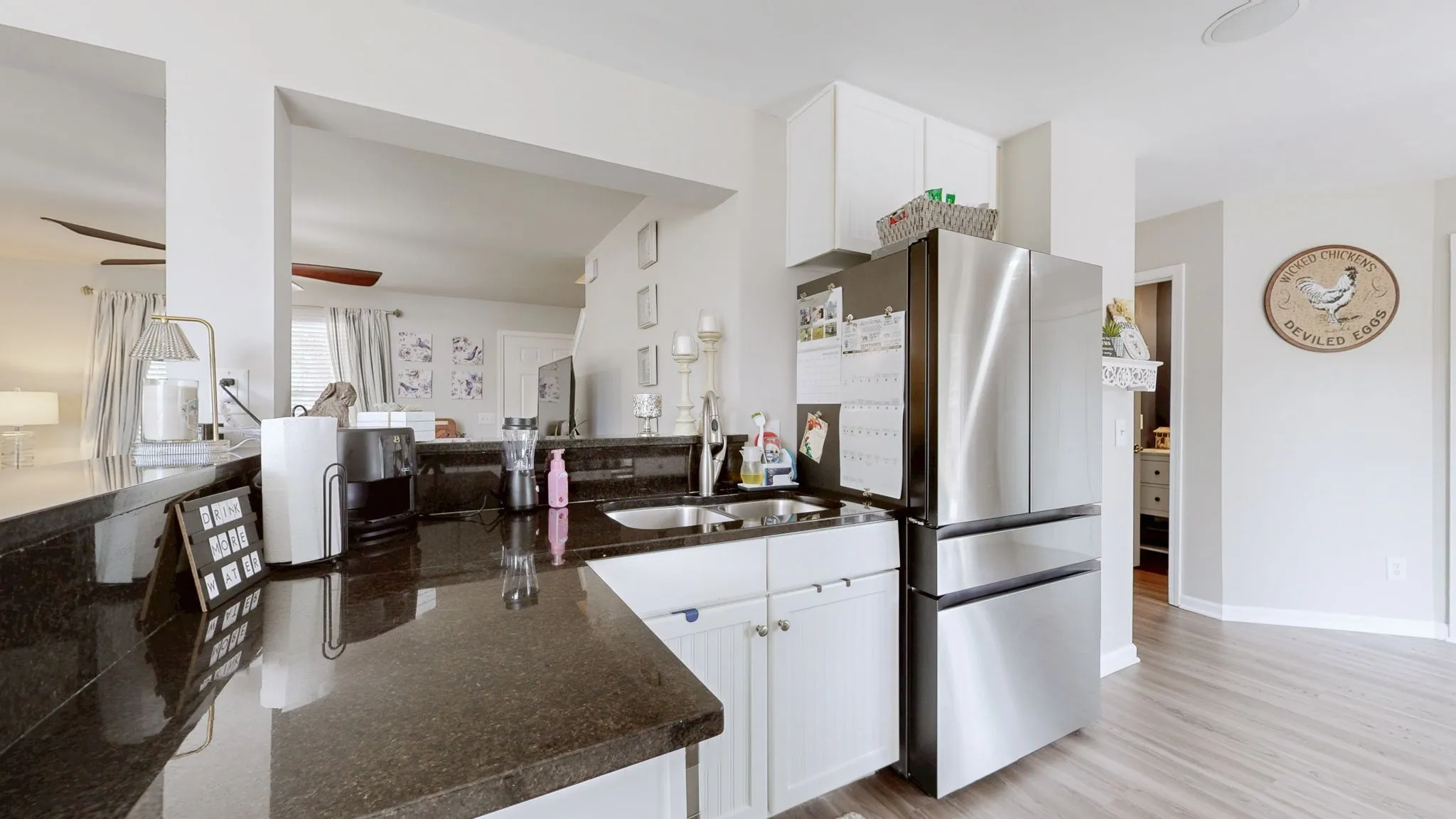 Inside, the living room soars with vaulted ceilings, while the open kitchen and dining area shine with granite countertops & stainless steel appliances.