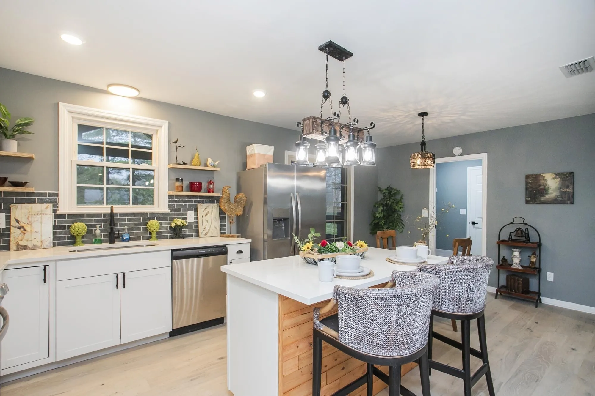 This beautifully remodeled brick home features a new kitchen with stainless steel appliances, updated flooring, and modern tiled bathrooms. Freshly painted inside and out, the house features three bedrooms, two bathrooms, and an office (staged to resemble a nursery). With an open and airy floor plan, a cozy fireplace, a garage, and concrete parking. Additionally, there is a screened-in deck at the back. Upstairs is a brand-new expansion that nearly doubles the space to almost 1000 square feet.