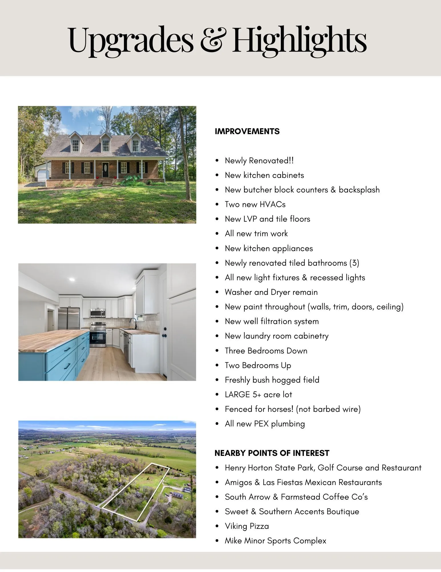 Very motivated seller! Take a look at this 5 bedroom 3 bath with a bonus room home, close to 3000 sq ft under heat and air but some pitched ceiling walls reduced the professional measurement to what’s listed. What a remarkable remodel, breathing life back into this home for someone to enjoy for years to come. This home was remodeled from top to bottom including two new HVACs and a new well water filtration system, brand new kitchen including cabinetry, butcher block counters, deep sink and new stainless appliances. Inside you will find that all the floors, trim and paint are new, notice the new light fixtures and recessed lights plus red oak stair treads stained to match those lovely white oak look LVP floors. Don’t miss the tiled bathrooms, they’re stunning! There are 3 bedrooms and 2 bathrooms downstairs with 2 bedrooms and 1 bath up stairs as well as a bonus room! Plenty of space to spread out here inside and out! The pasture is fully fenced on all sides with a creek at the back with a few trees here and there for shade. There’s also a 20×22 shop/garage with 3 roll up doors! The views from your back porch are breathtaking and the views from your front porch are nothing short of peaceful. This little neighborhood is just what you’ve been looking for if you’ve been searching for an exhale and enjoy seeing the occasional person trail riding horses up and down the roads as well as the perfect road to take an early morning or evening walk. Just minutes to all that Chapel Hill has to offer. Less than 5 minutes to the best gourmet coffee shops, quaint boutiques, diners, Brooks Grocery, Henry Horton State Park, kayak launch and Golf Course! 35 minutes to Franklin, Murfreesboro and Spring Hill or 55 minutes to Nashville! Talk about a dream, you will feel the sense of relaxation and close knit community when you enter this little town.