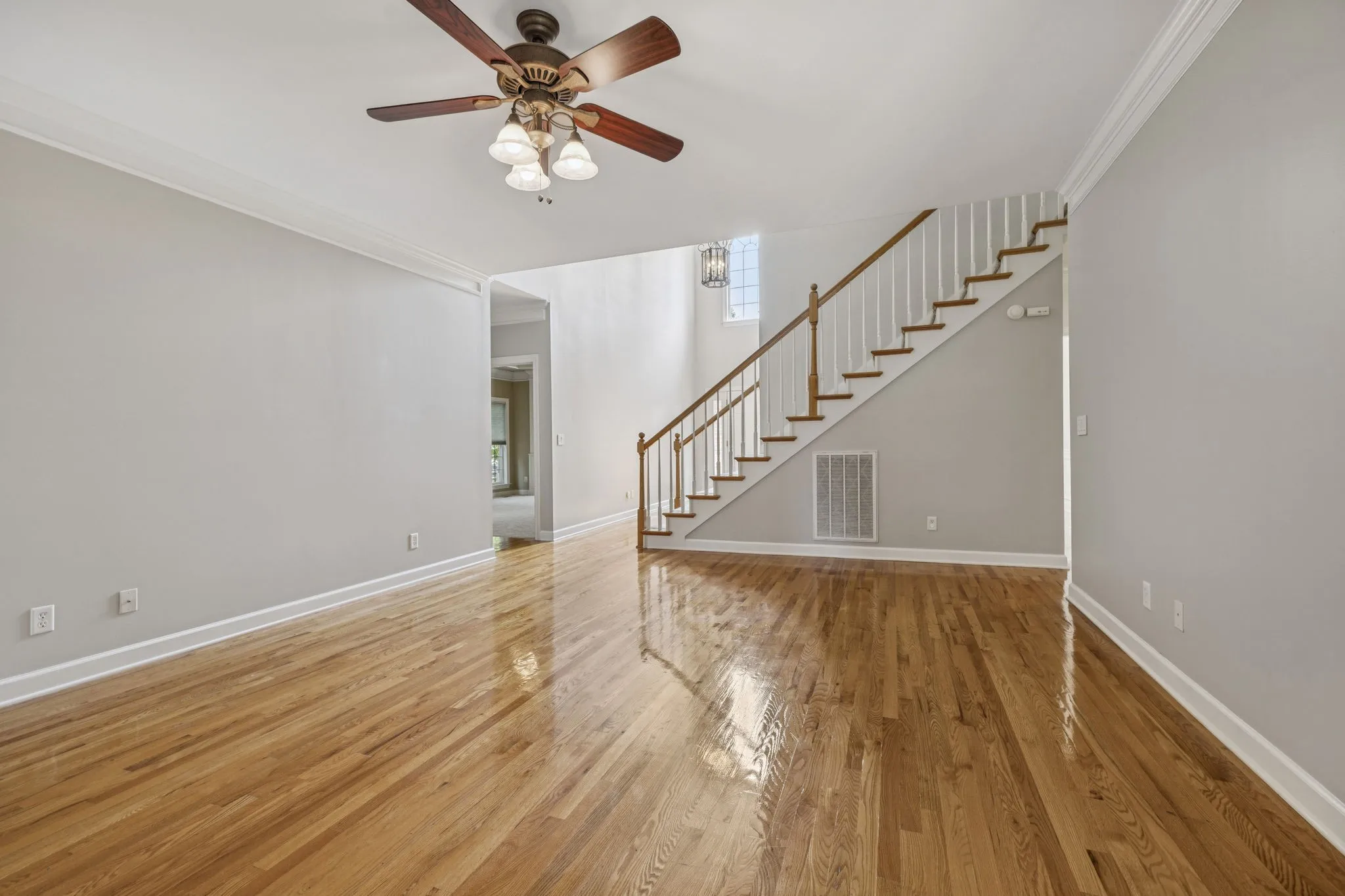 Welcome home to this stunning 4-bedroom, 3.5-bath residence offering comfort, style, and convenience. The main-level primary suite features a spacious sitting area for relaxation. Beautiful hardwood floors and new carpet flow throughout, while a grand 2-story foyer creates an impressive entrance. The kitchen is designed for both function and style with quartz countertops, tile backsplash, and an adjoining gathering room with a cozy fireplace. Upstairs, a media room with custom built-in bookcases provides the perfect retreat. Step outside to enjoy the covered deck overlooking mature trees, lush landscaping, and an irrigation system already in place. Conveniently located near shopping and dining, this home is move-in ready and waiting for you! Preferred lender offering a 1% lender credit towards buyers closing costs or discount points.