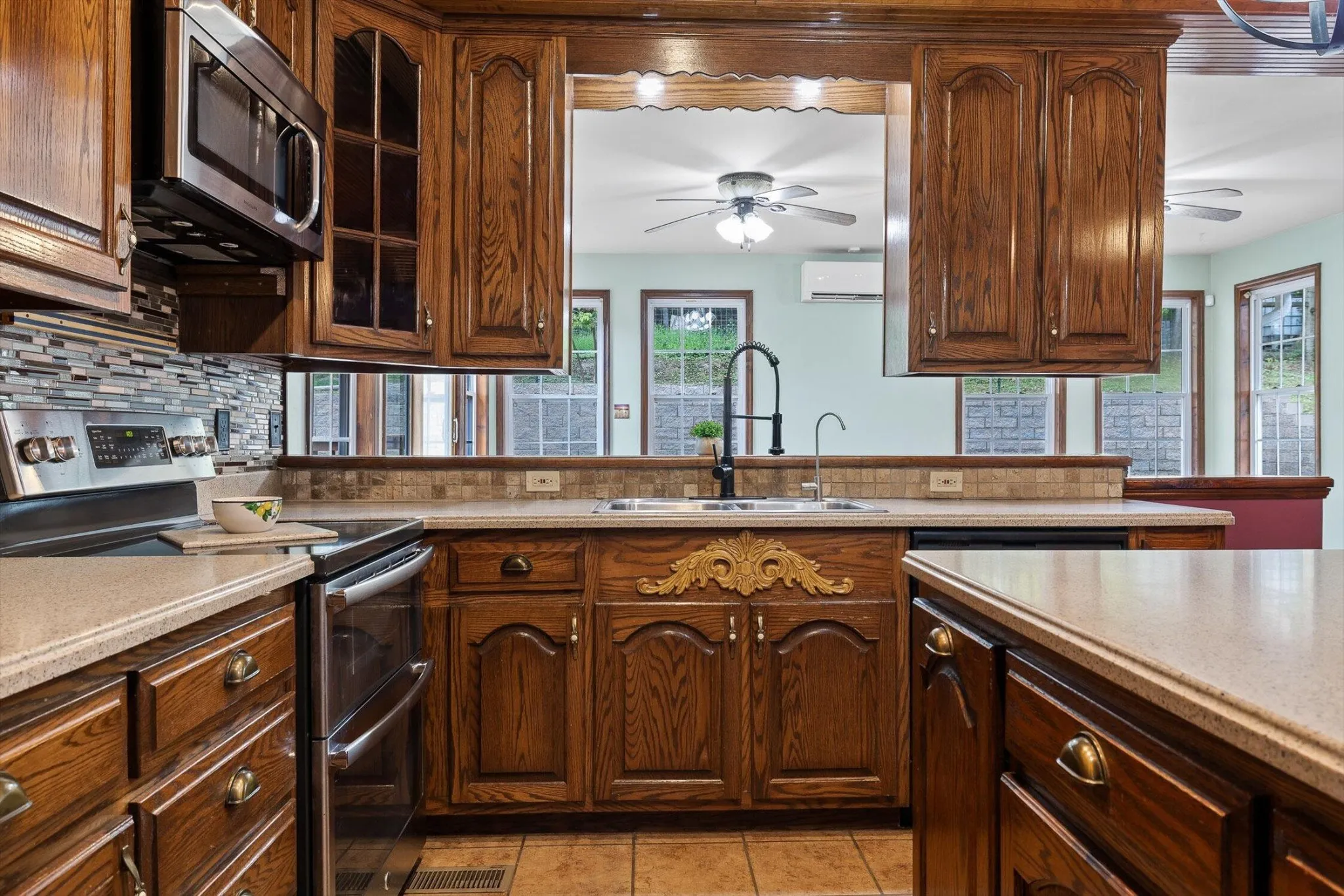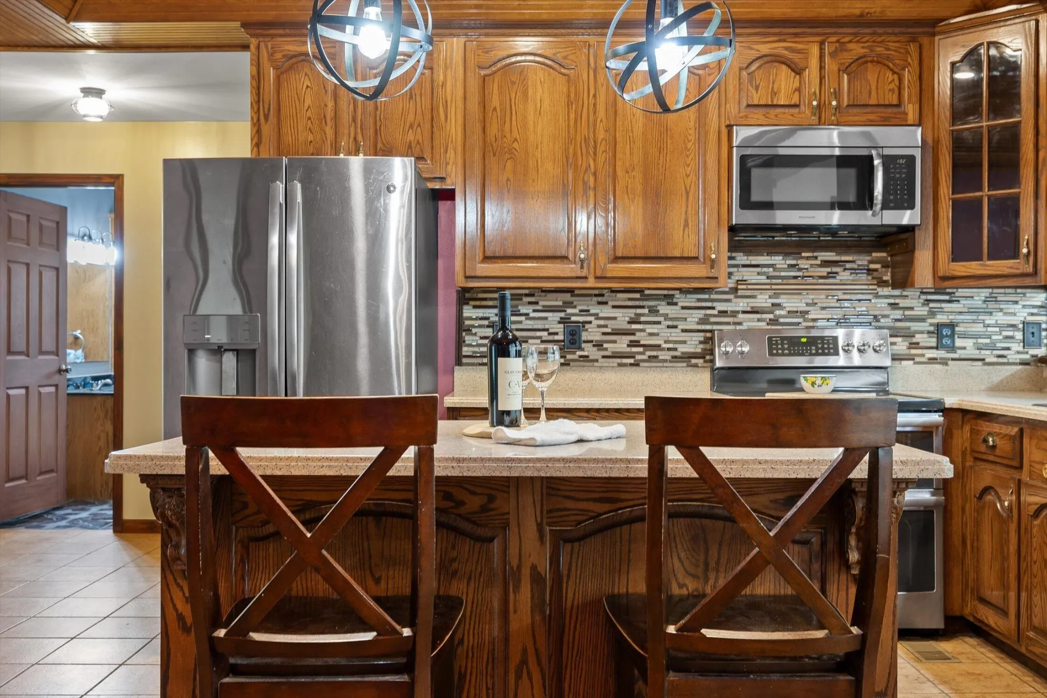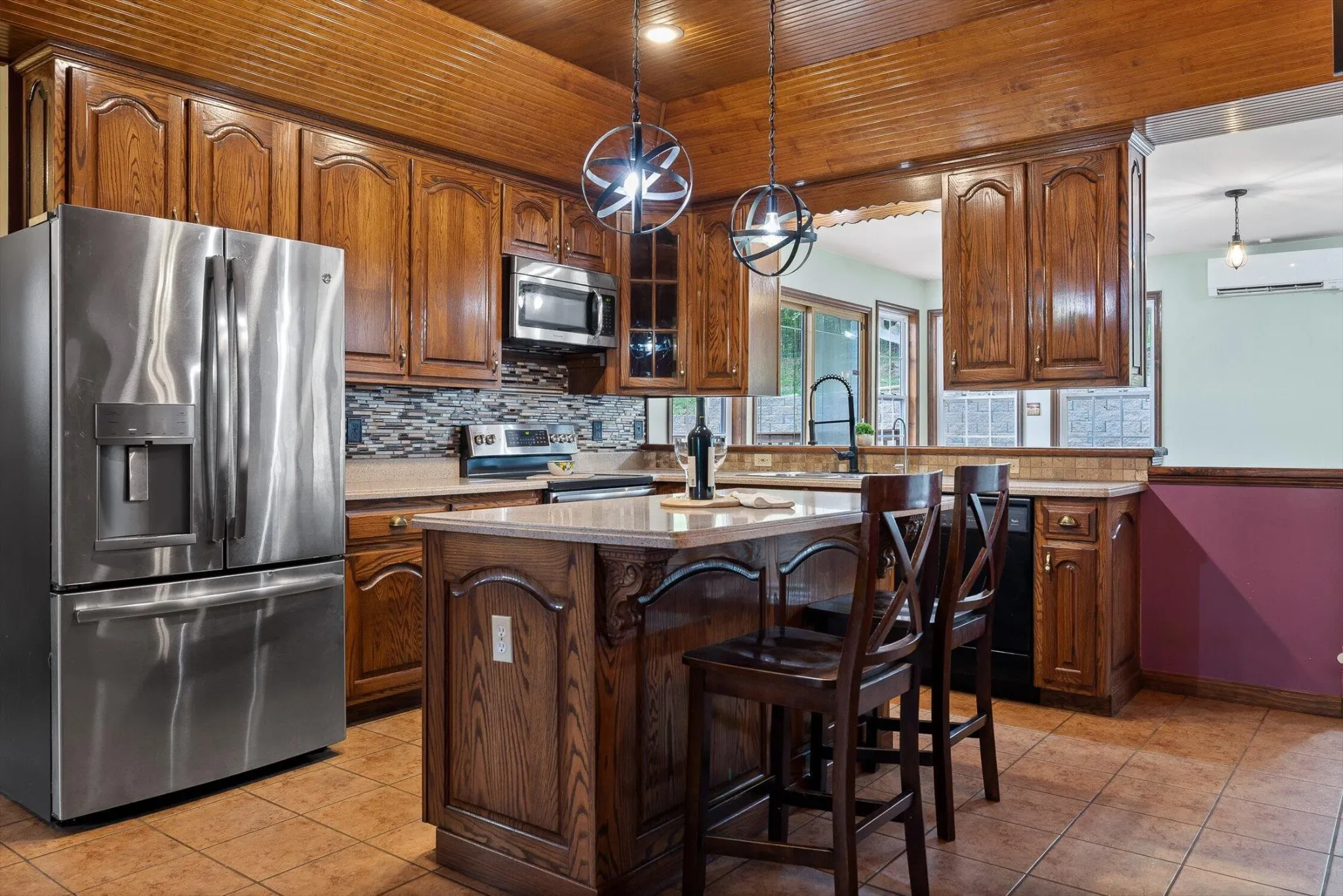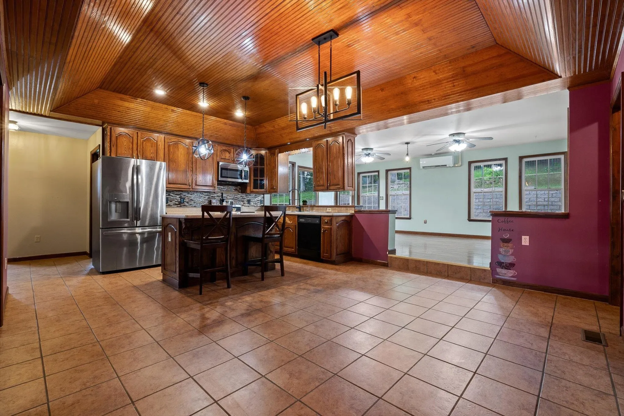 Step inside to a thoughtfully designed split-bedroom floor plan. The owner’s suite offers a relaxing escape with a jetted tub and two spacious closets. The kitchen is a cook’s delight, featuring beautiful custom wood cabinetry, solid surface countertops, and a large center island—ideal for prepping meals or gathering with loved ones. The dining room features a warm wood-lined tray ceiling, and the living room showcases a cozy fireplace with stunning views of the pond.