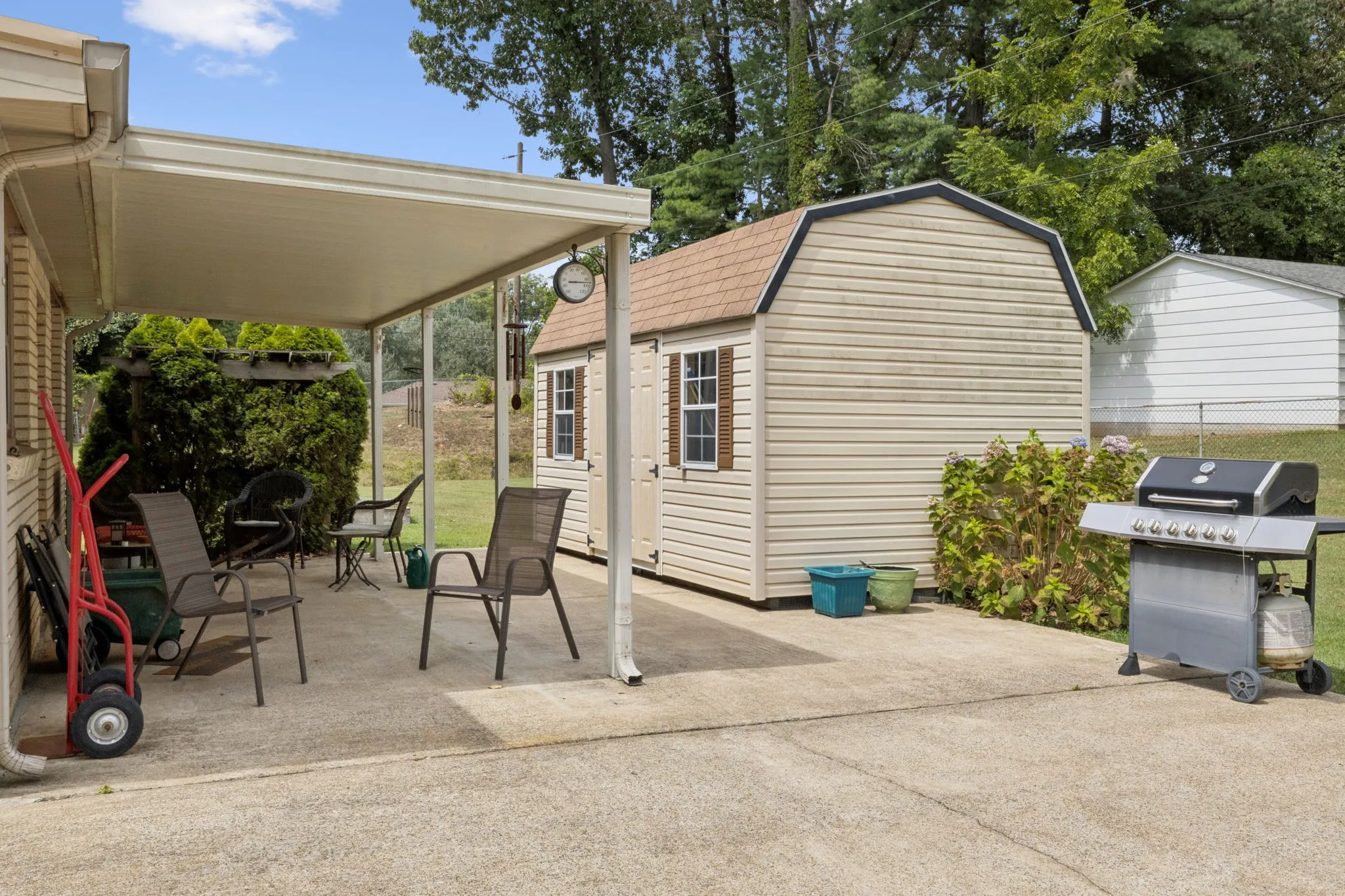 The sunken den offers a flexible bonus area — perfect as a movie room, home office, or game space. Step out back to the covered patio, ideal for year-round enjoyment, whether it’s summer BBQs or morning coffee. The large backyard includes a 12×16 powered outbuilding, perfect for hobbies, tools, or a creative workspace.