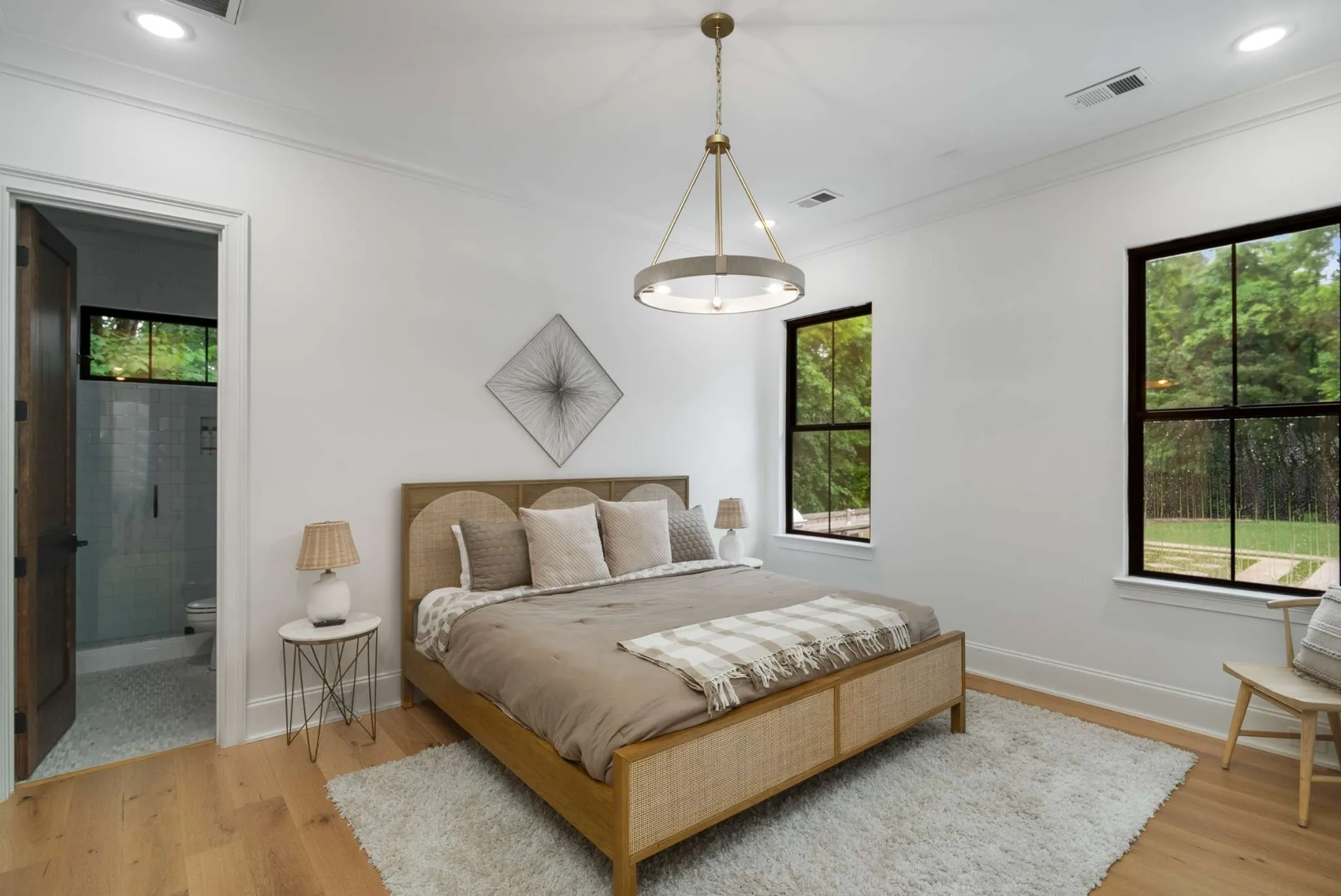 Step outside to your private, tree-lined sanctuary, where a custom saltwater pool with tanning ledge, hot tub, and cold plunge await. The outdoor kitchen is a true entertainer’s dream, boasting a built-in smoker, gas grill, pizza oven fireplace, and refrigerator—all set on an expansive travertine patio with a covered seating area.