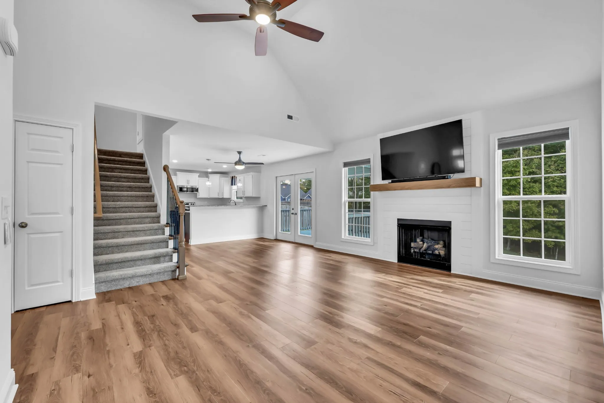 Welcome home to your private retreat on nearly half an acre with no backyard neighbors and a peaceful wooded view! Step inside to a bright entry foyer with tile that opens into an airy living space featuring laminate floors and a cozy gas fireplace. The stylish kitchen steals the show with granite counters, stainless appliances, a pantry, and two-tone cabinetry—classic white on top, bold blue on bottom—for a designer look. Enjoy morning coffee at the breakfast bar or casual meals in the eat-in area overlooking the trees.The primary suite is a true escape with double vanities, an oversized shower, and a walk-in closet. Bedrooms 2 and 3 offer upgraded carpet and ceiling fans for comfort. The 4th bedroom is located upstairs & is currently being used as the crafting space, it includes a half bath, closet, & plenty of space.. Relax or entertain on the covered back deck while soaking in the wooded view, and rest easy with a ventilated crawlspace system. Washer and dryer remain for a move-in ready lifestyle. With a 2-car garage, gas fireplace, and smart layout, this one has it all!