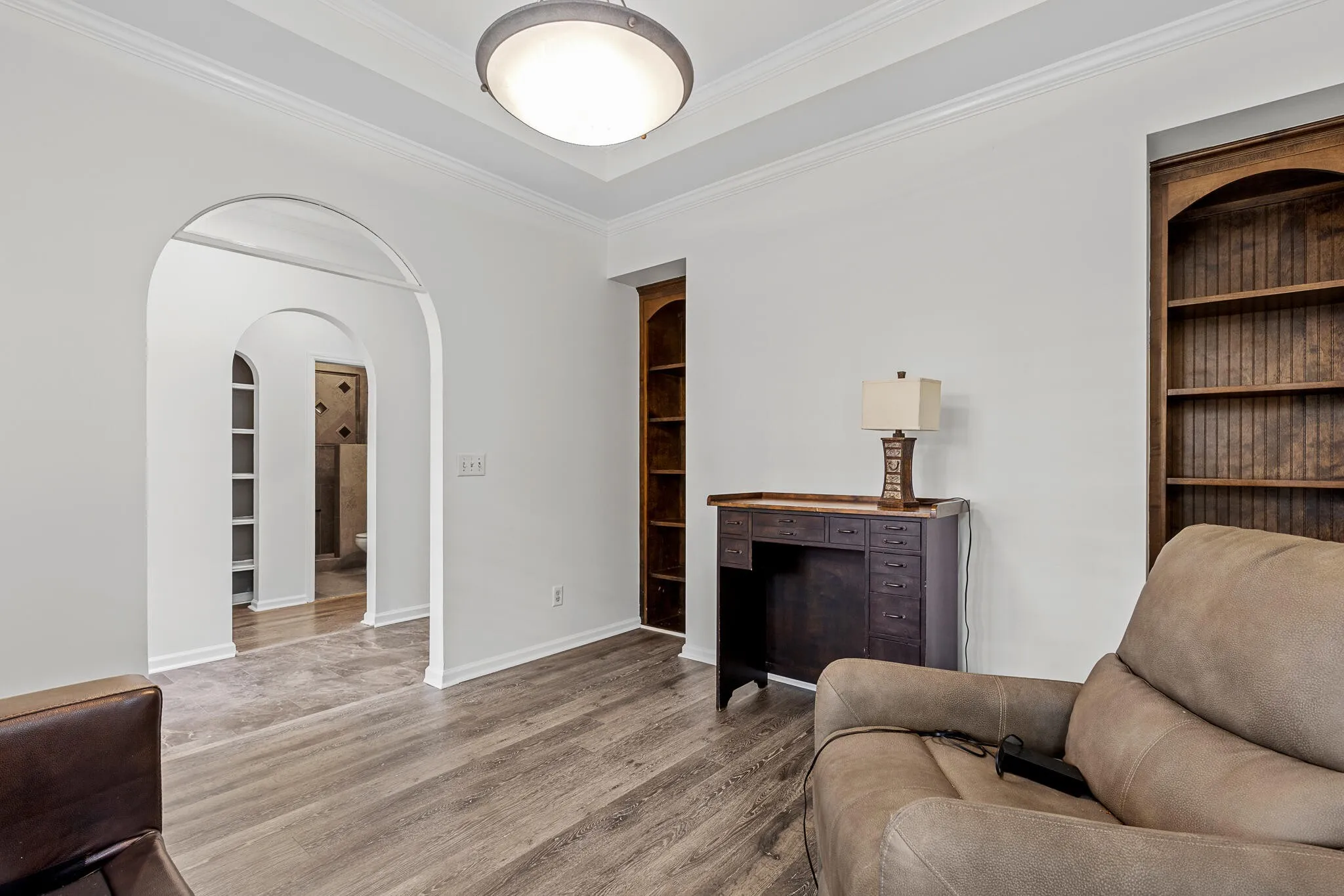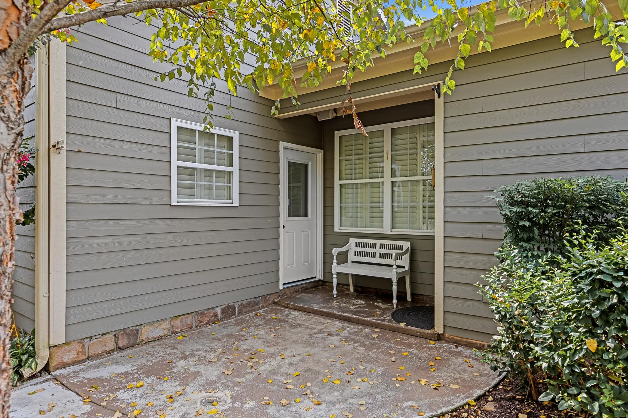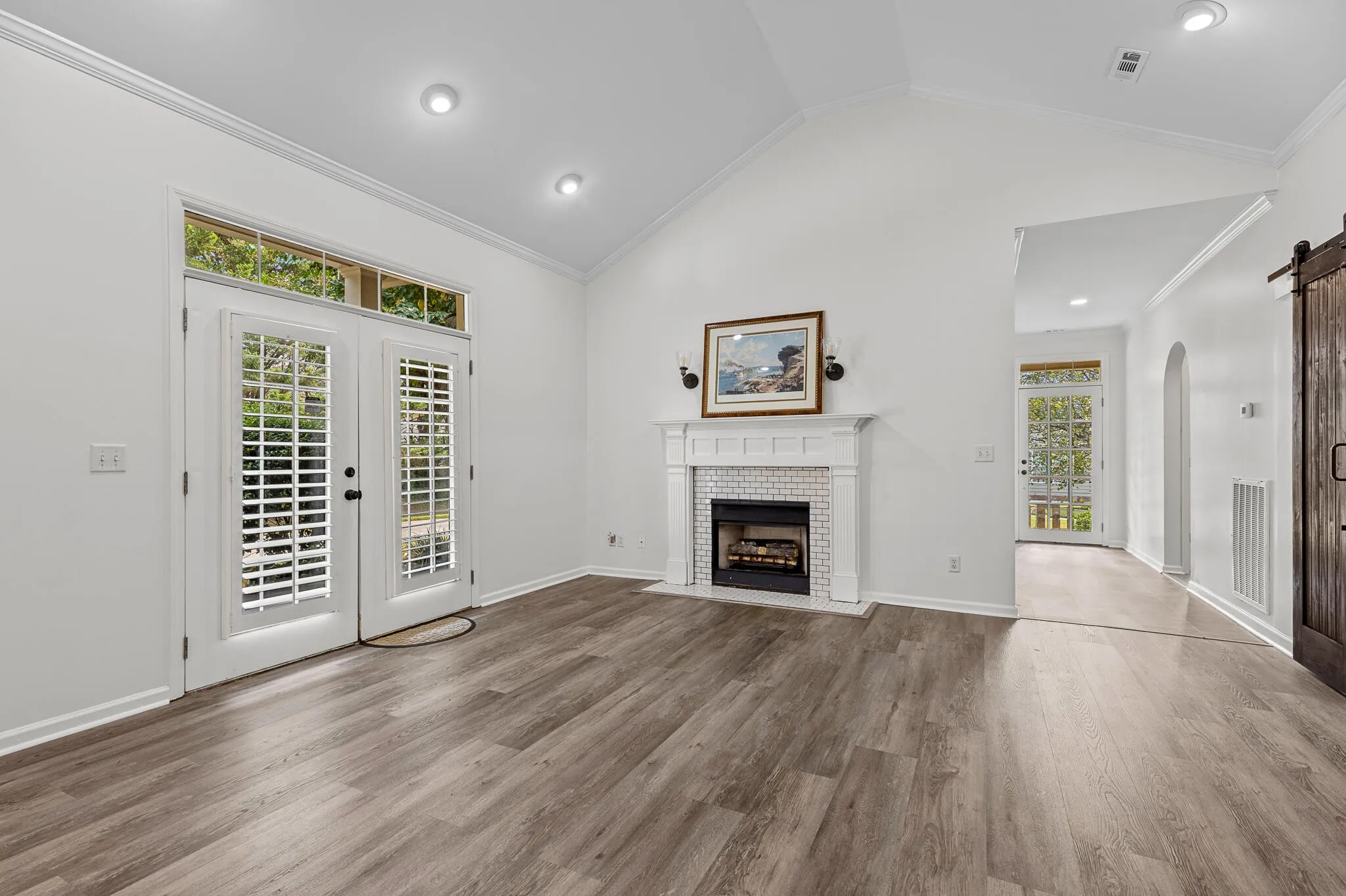 Welcome to 854 Callaway Court, a stunning two-bedroom, two-bath condo that blends timeless design with elegant finishes. As you step inside, you’re greeted by vaulted ceilings and a spacious living room centered around a fireplace with a white wooden mantle. French doors, accented by a transom window above, flood the space with natural light, while the adjoining dining room—tucked behind sliding dark oak barn doors—creates the perfect balance of openness and privacy.